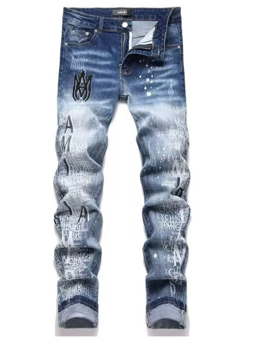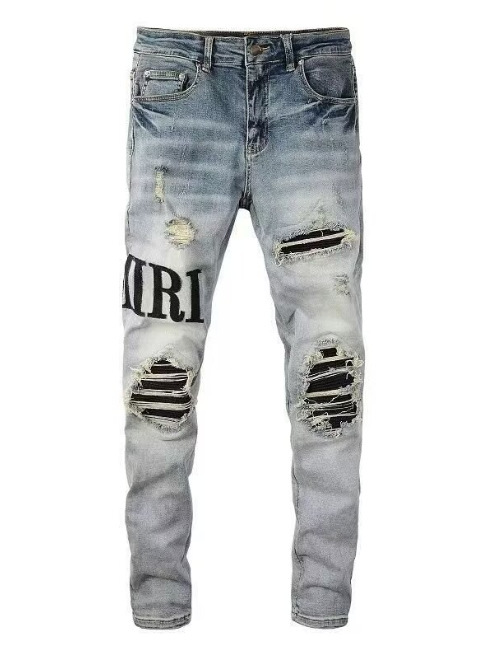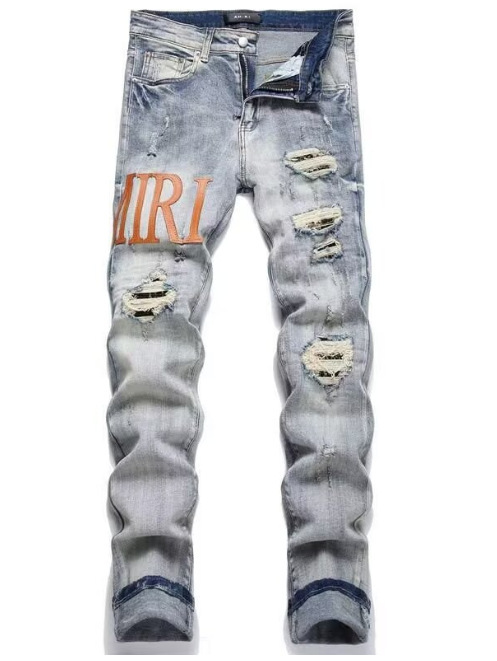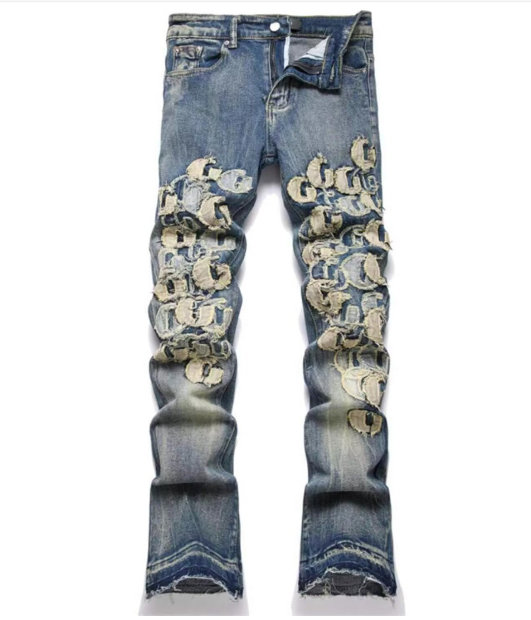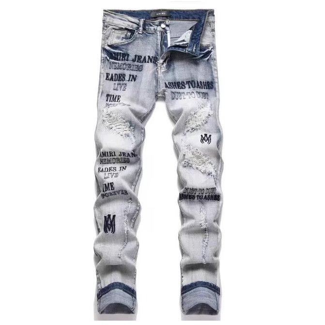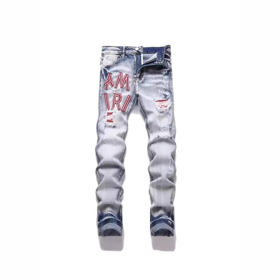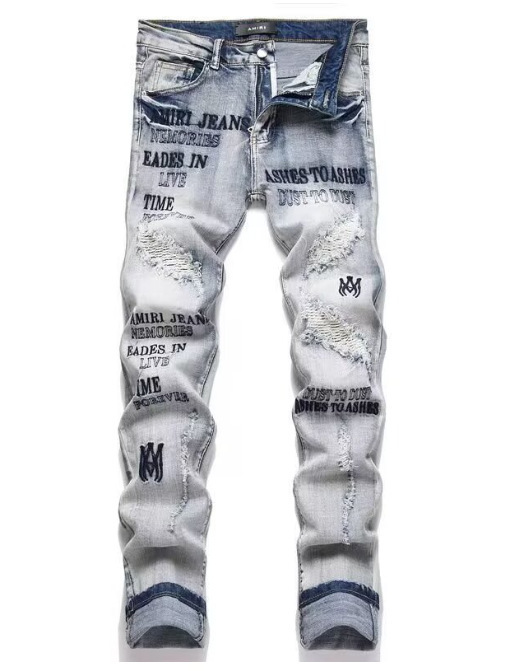 대외 무역 바느질 자수 빈티지 AM 슬림 핏 스키니 바지 남자 바지 찢어진 천 바지
