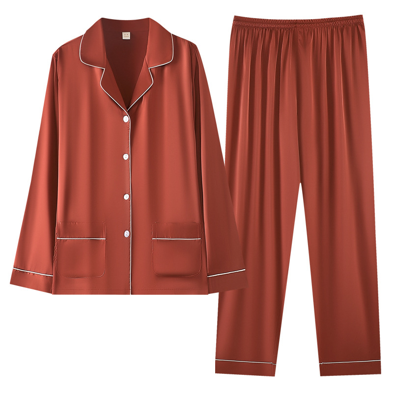 Yirui 컬러 아이스 실크 잠옷 여성용 긴 소매 봄과 가을 얇은 벽돌 레드 단색 간단한 여름 새틴 실크 홈 옷