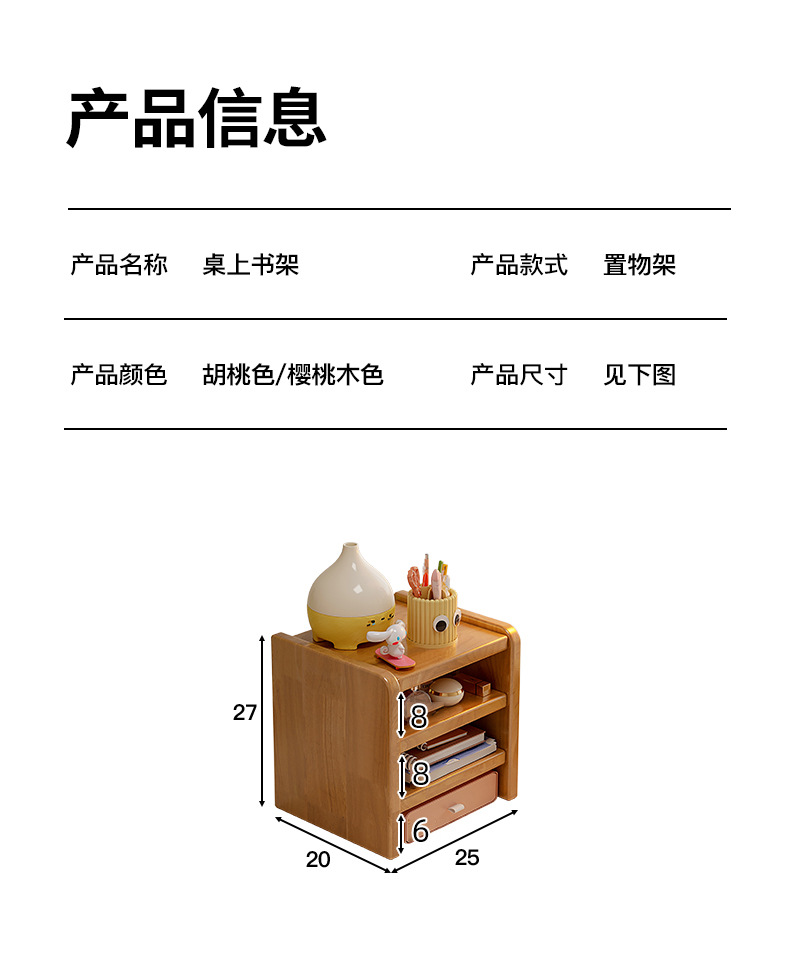 100% 고무나무로 제작된 체리색 3단 수납선반-25*20*27CM