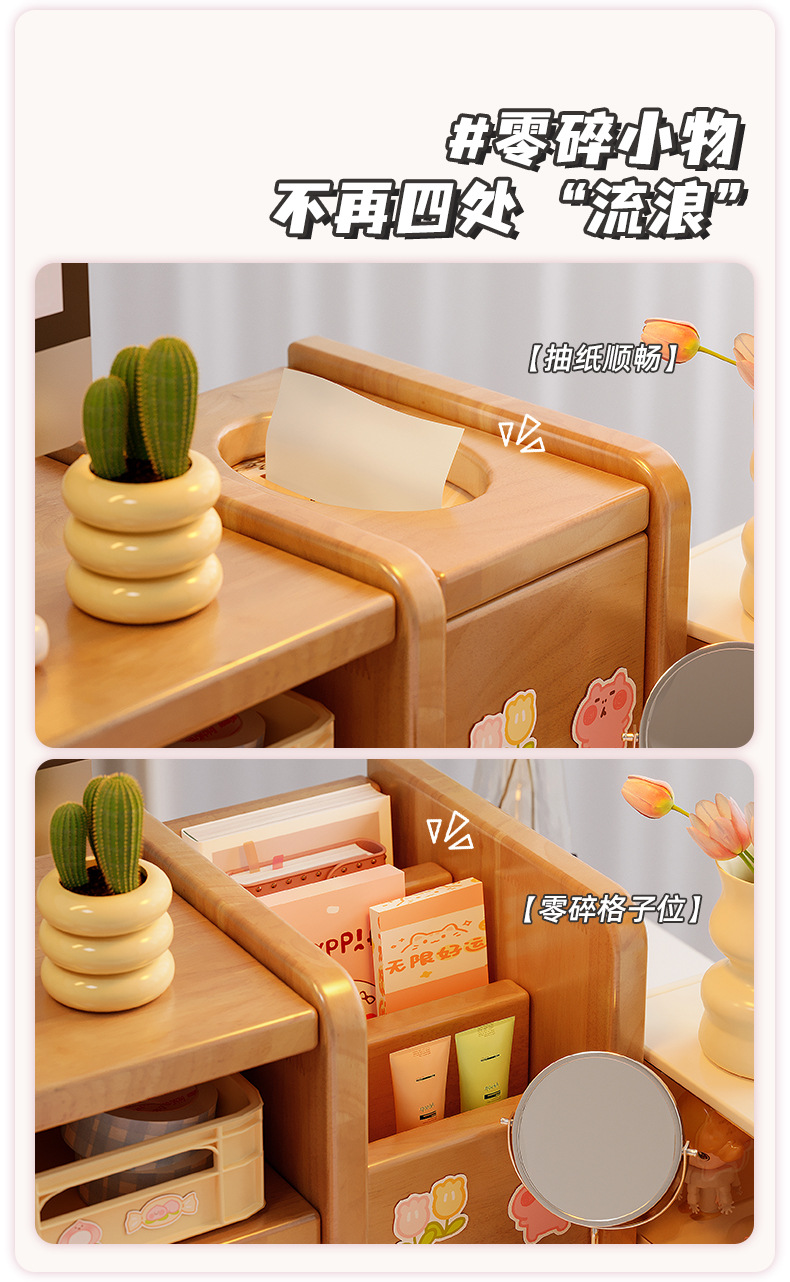 100% 고무나무 원목, 체리색 2단 2칸 - 50cm (티슈 수납칸 포함)