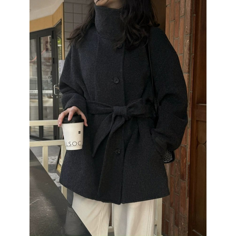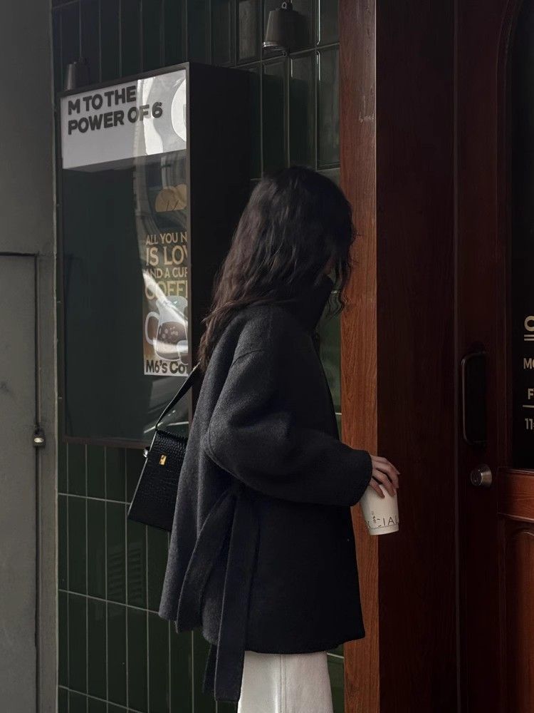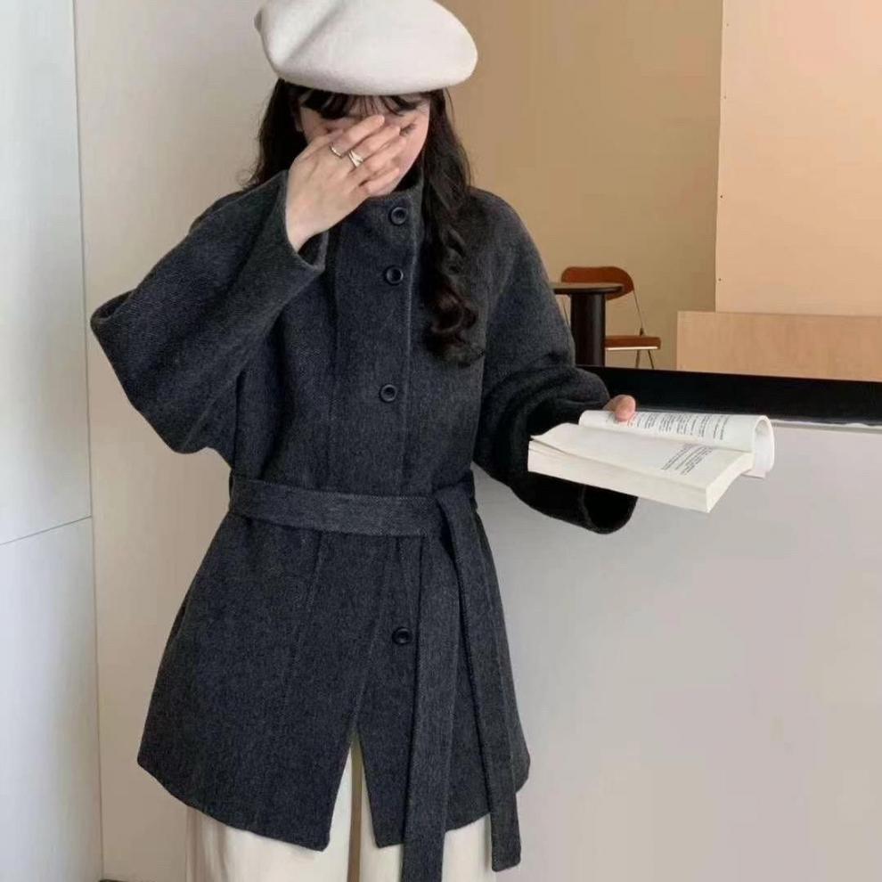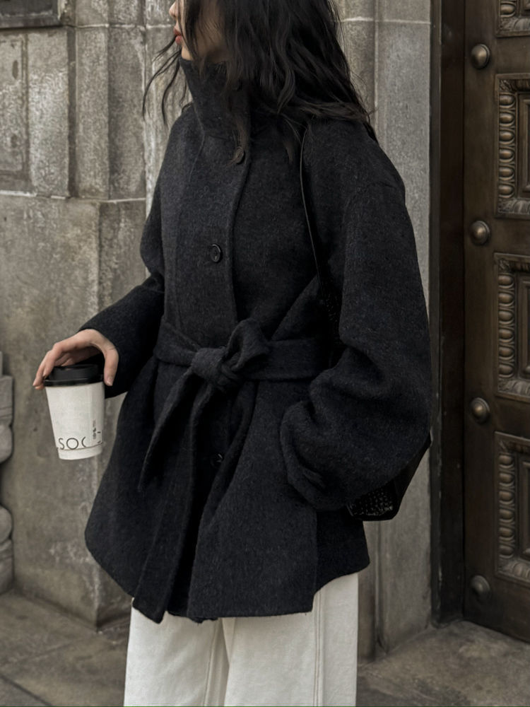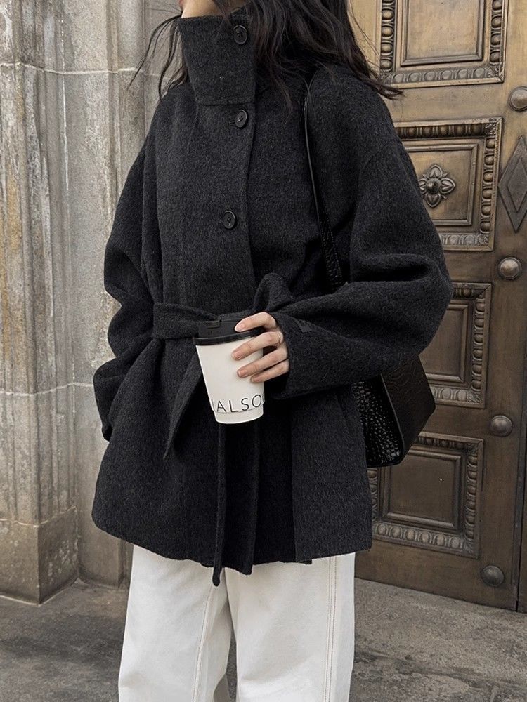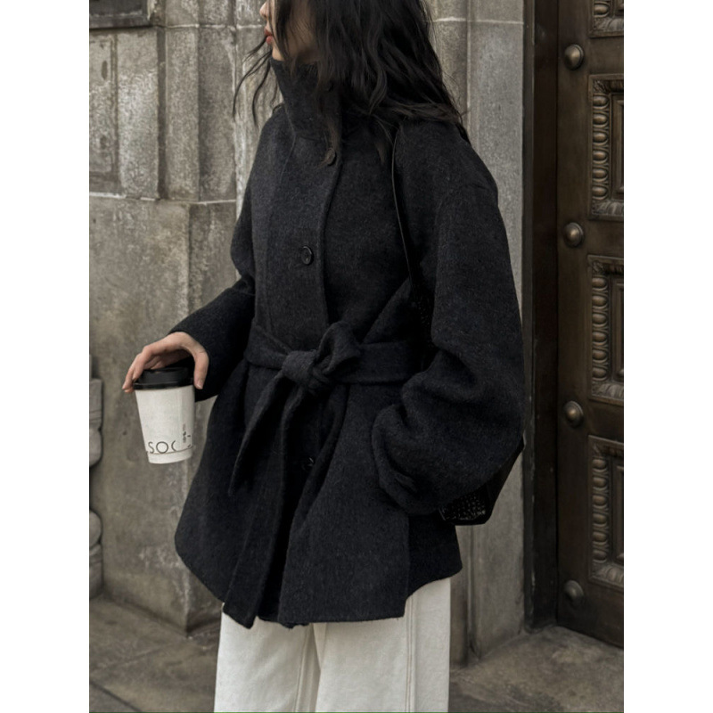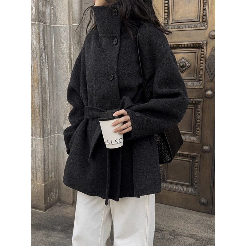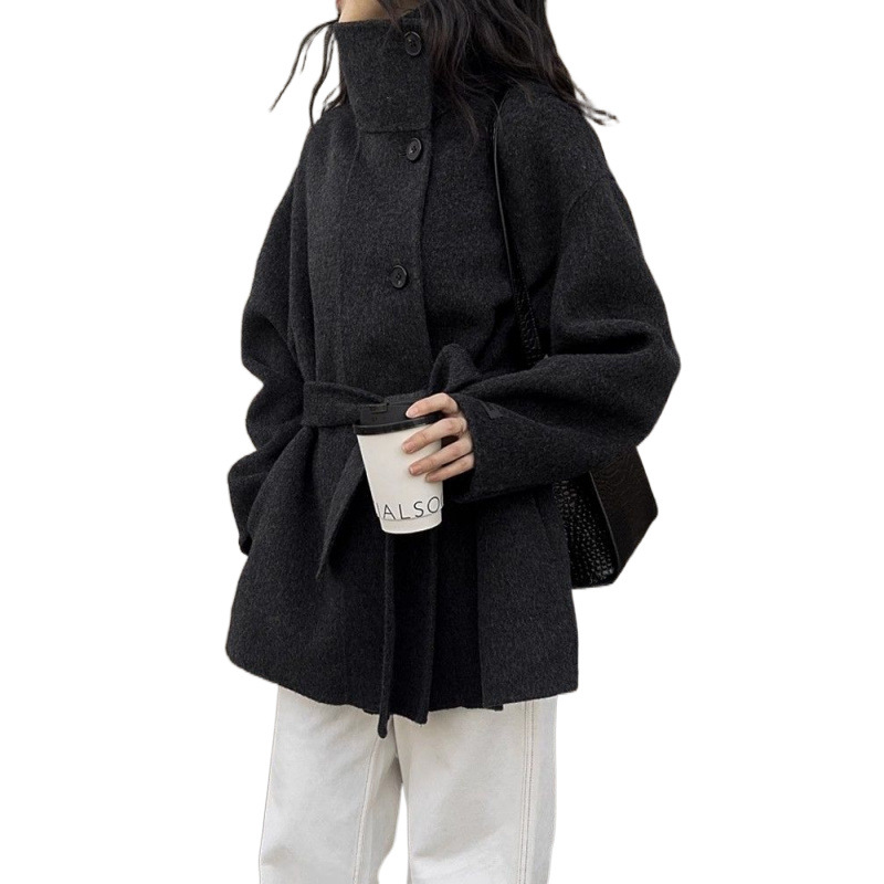 스탠드 칼라 블랙 양면 캐시미어 코트 여성용 2025 가을 겨울 슬리밍 울 코트 중간 길이