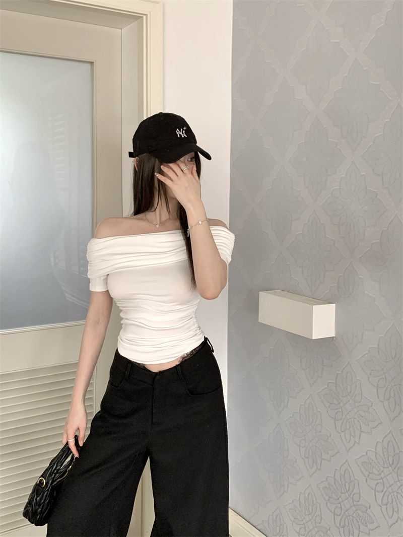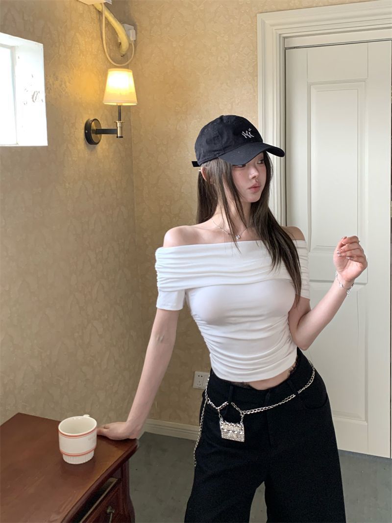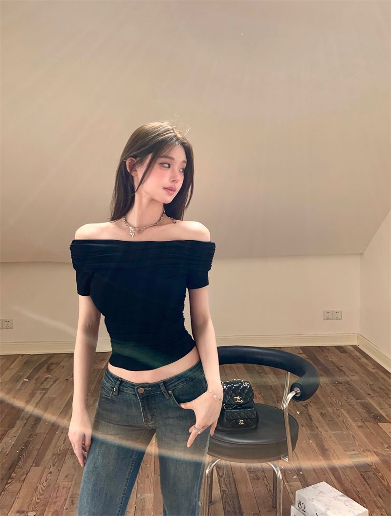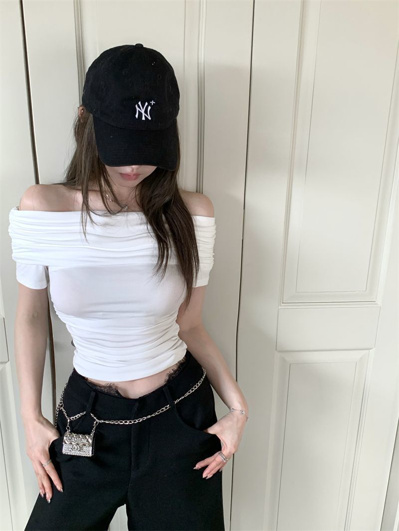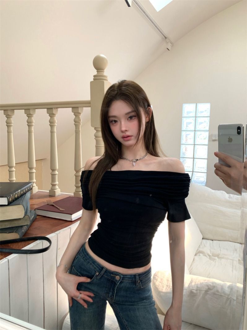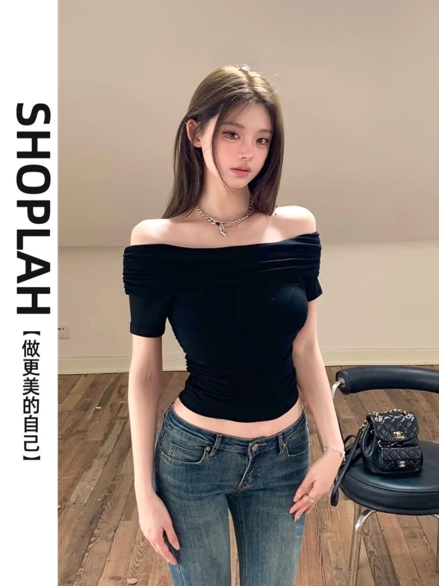 블랙 오프 숄더 반팔 티셔츠 여성용 여름 스파이스 걸스 세련되고 아름다운 꽉 끼는 타이트 허리 짧은 오프 숄더 이너 탑