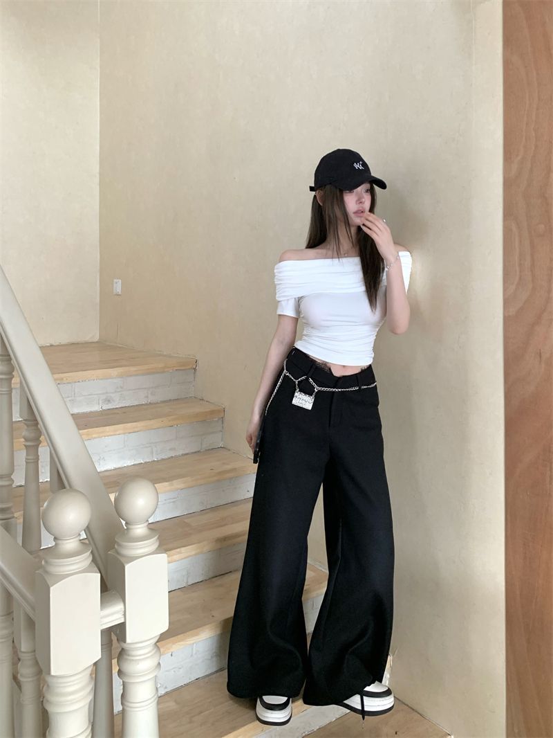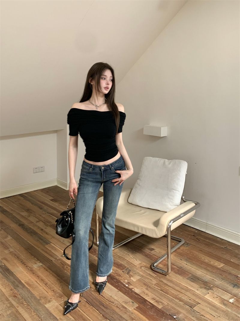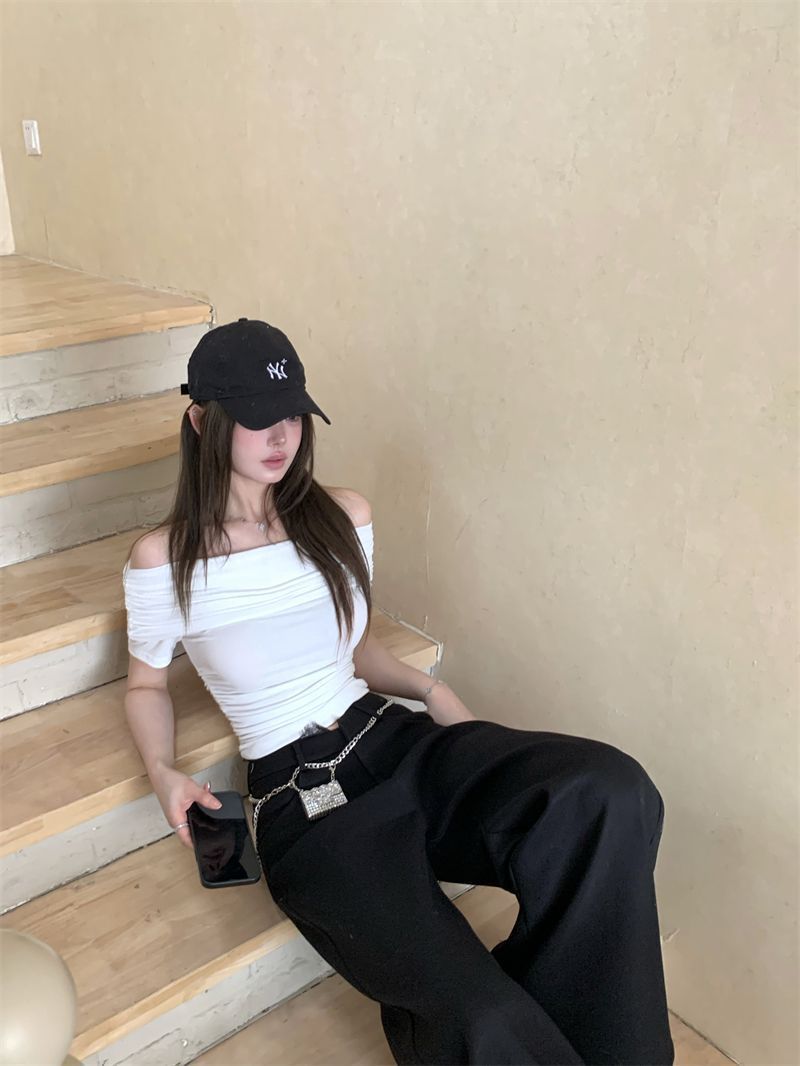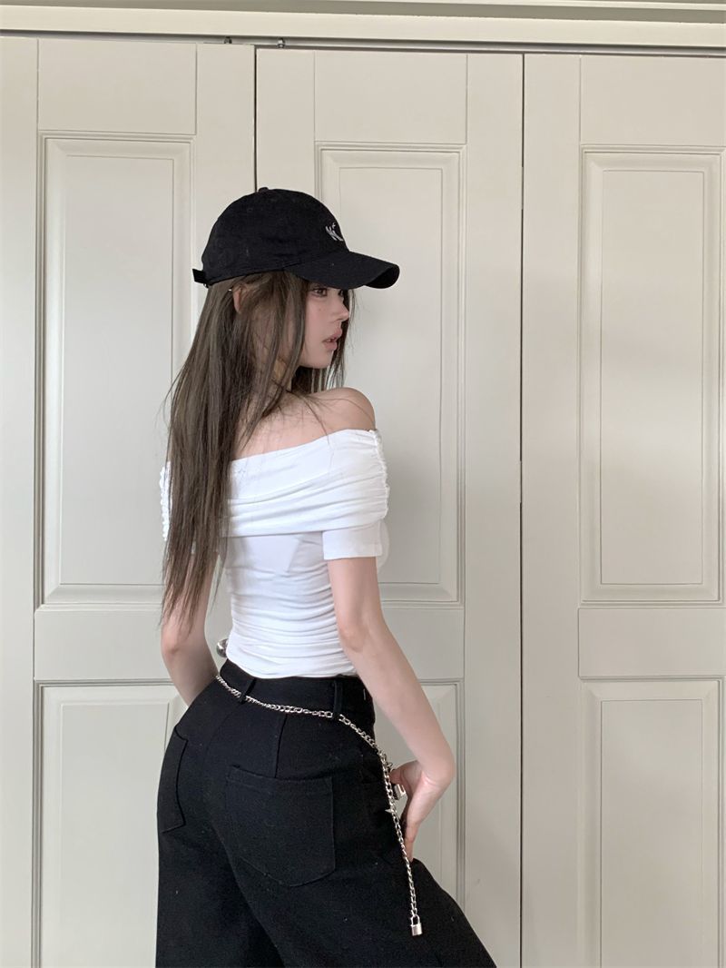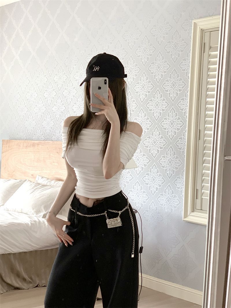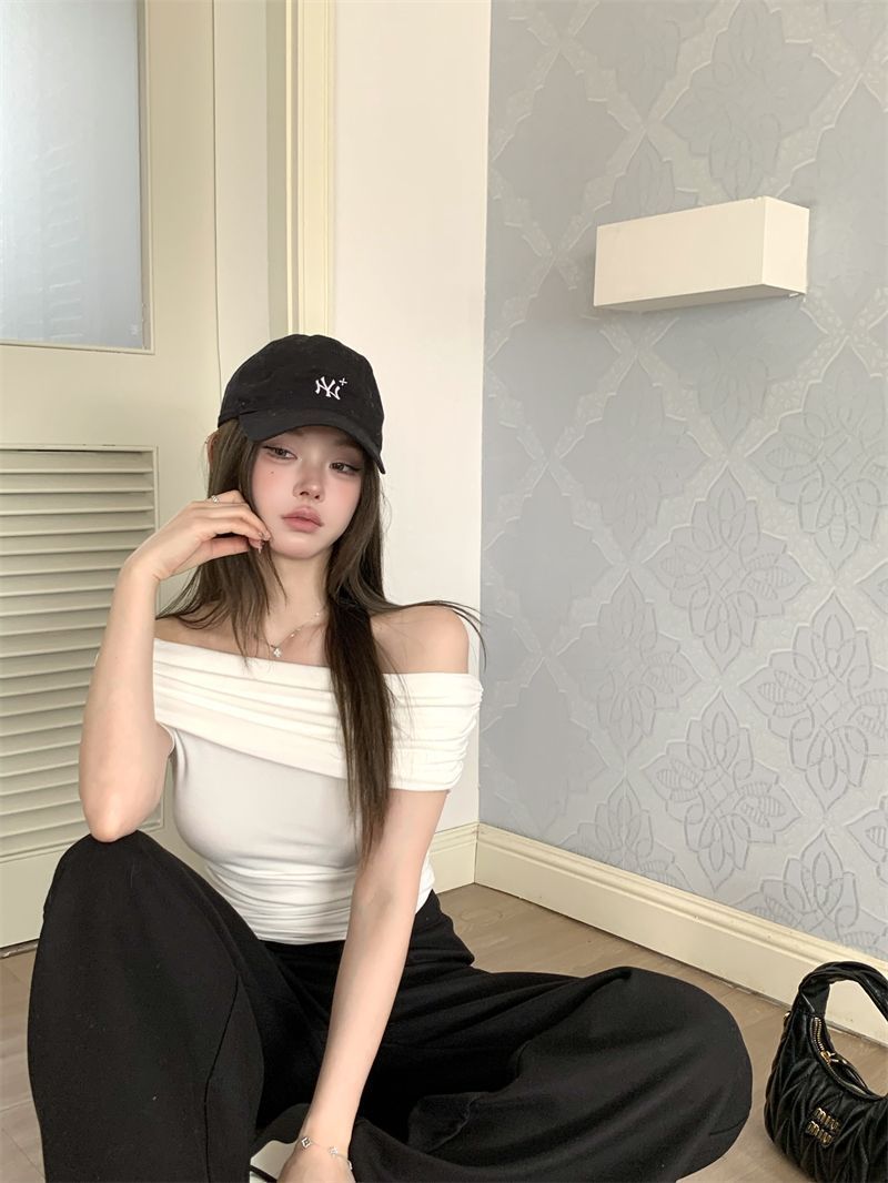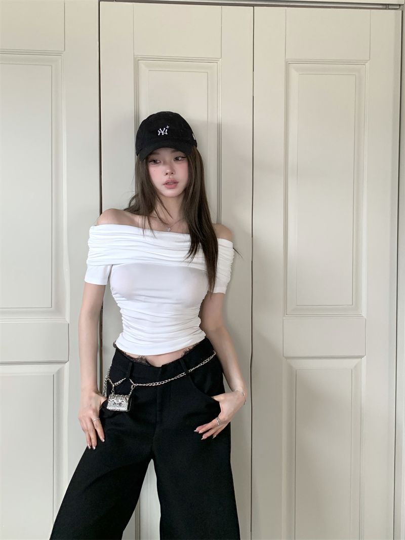 블랙 오프 숄더 반팔 티셔츠 여성용 여름 스파이스 걸스 세련되고 아름다운 꽉 끼는 타이트 허리 짧은 오프 숄더 이너 탑