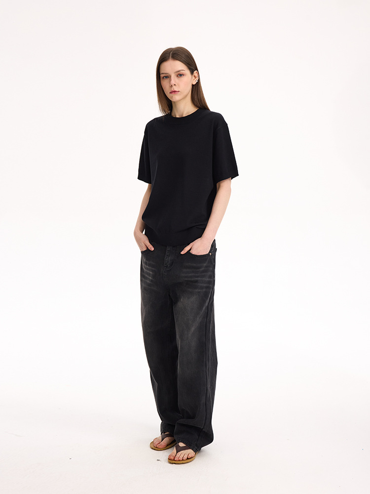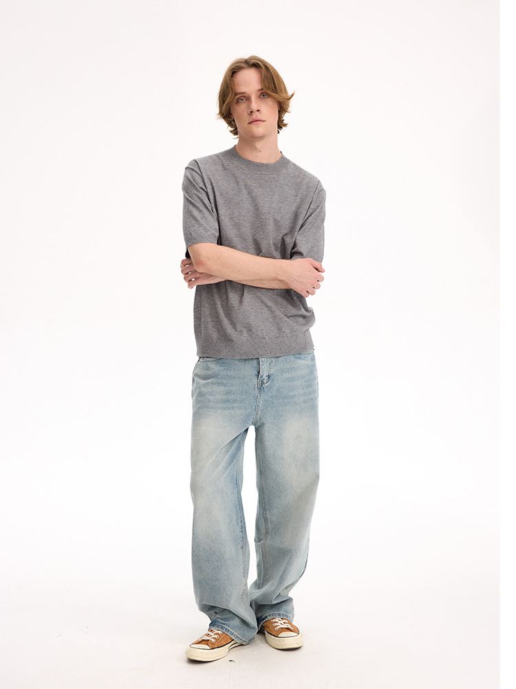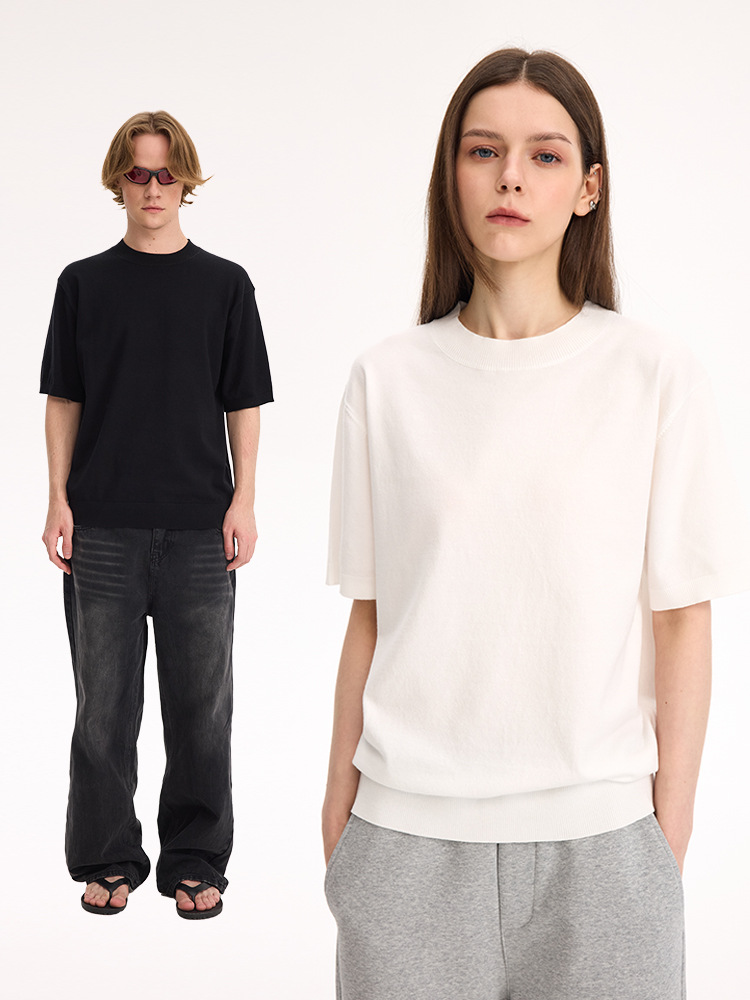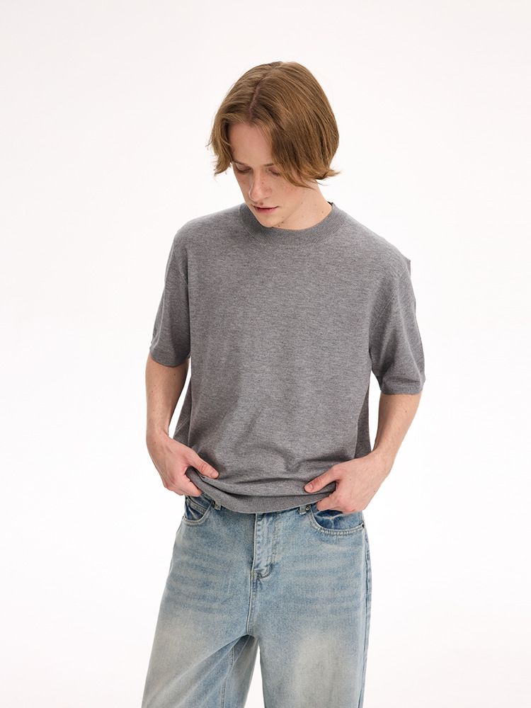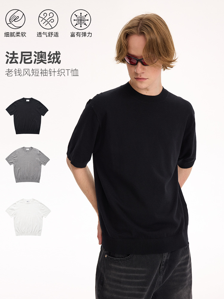 UNF "올드 머니 스타일 파니오 벨벳" 오른쪽 어깨 반팔 티셔츠 작은 터틀넥 솔리드 컬러 니트 티셔츠 봄 여름 남성