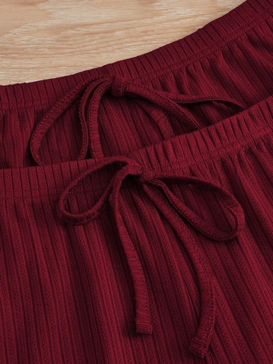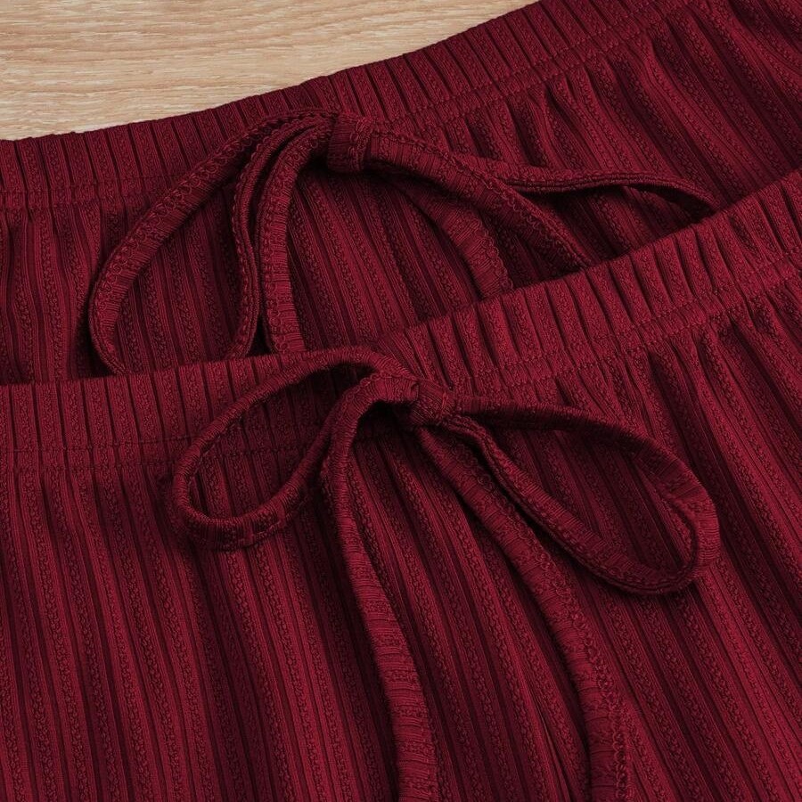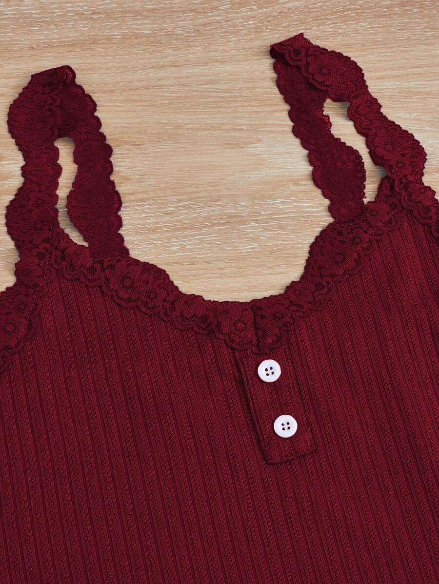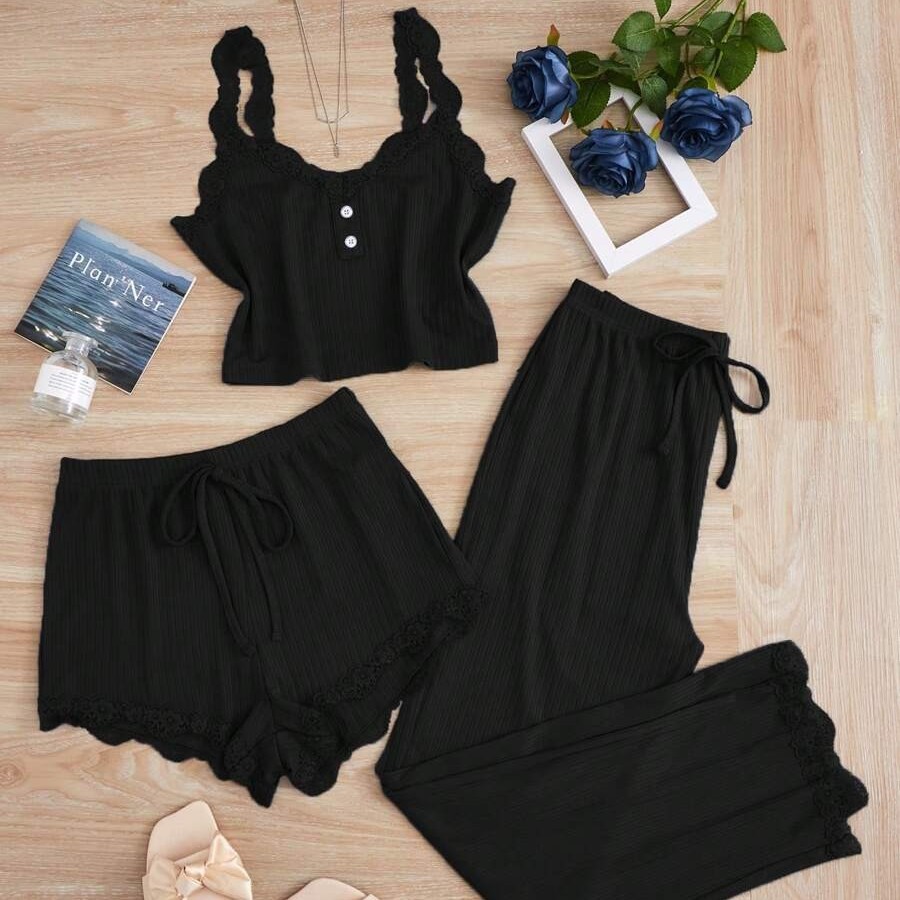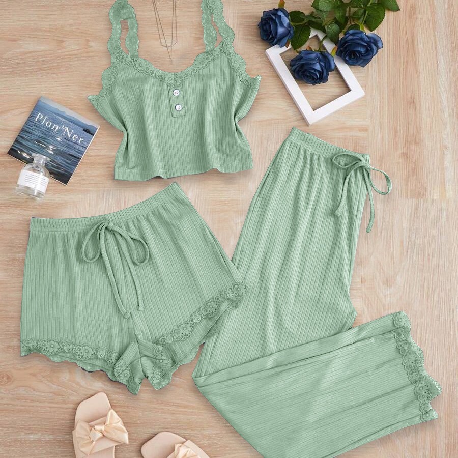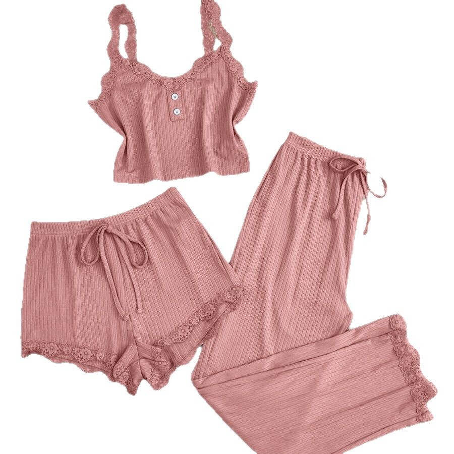 인기 있는 크로스보더 레이스 레이스업 3피스 세트, 끈나시, 반바지, 긴바지, 여성용 슬림핏 홈웨어