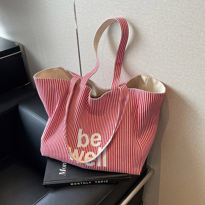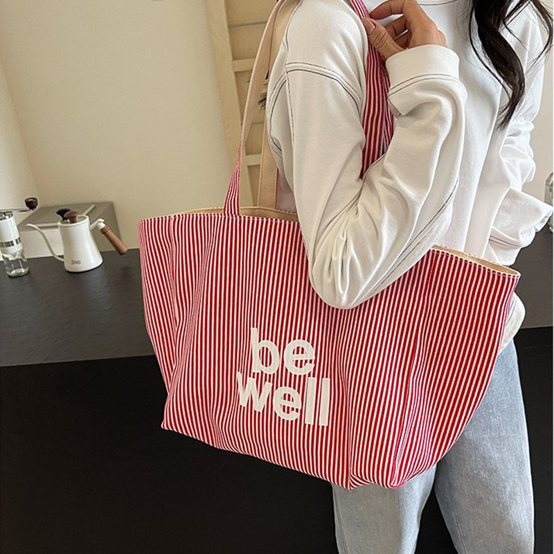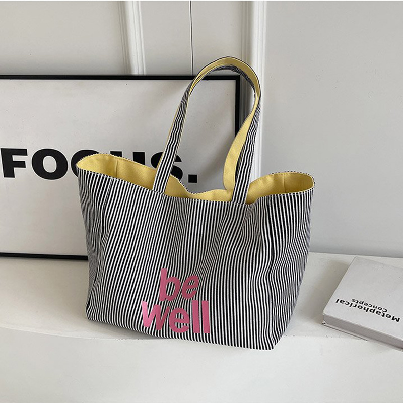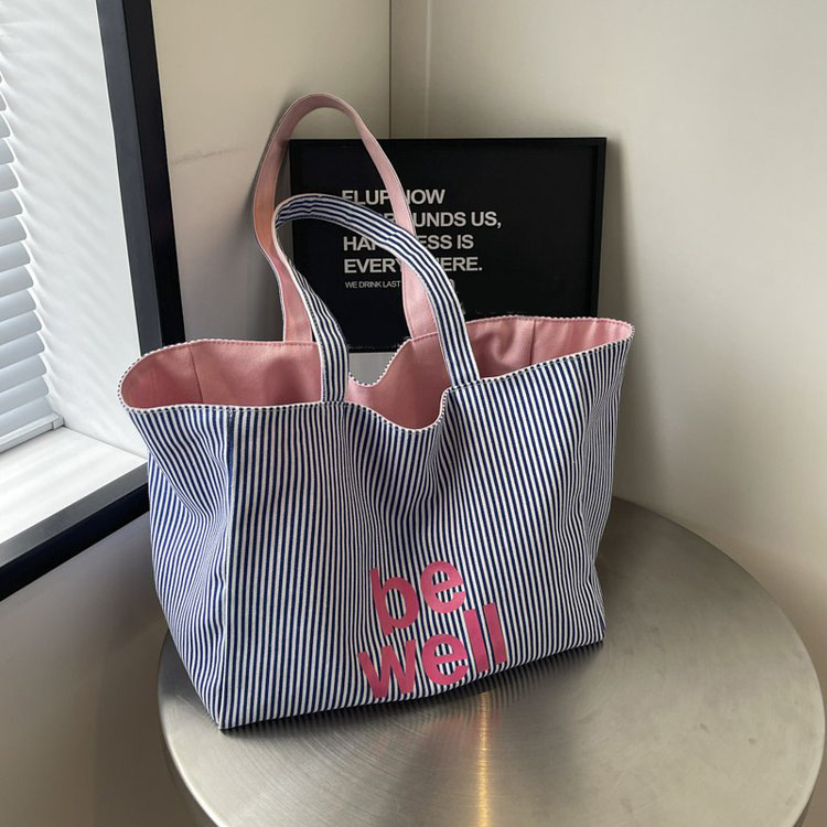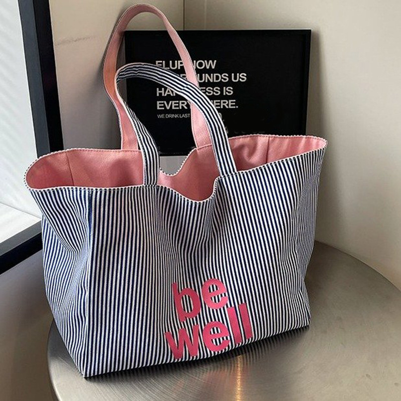 한국판 신형 대용량 토트백, 앞뒤 양면 패션 스트라이프 캔버스백, 학생용 레터프린트백