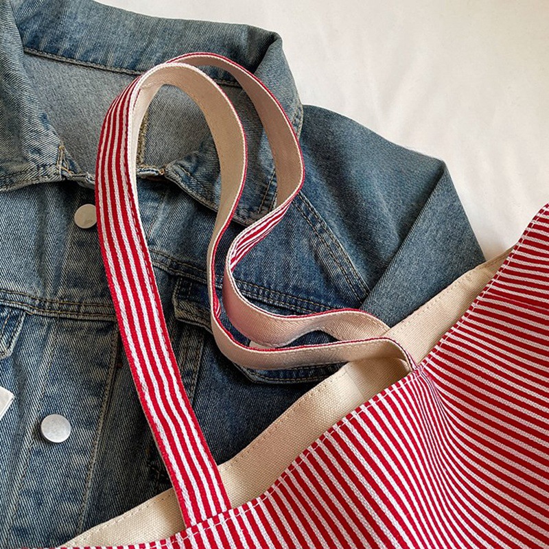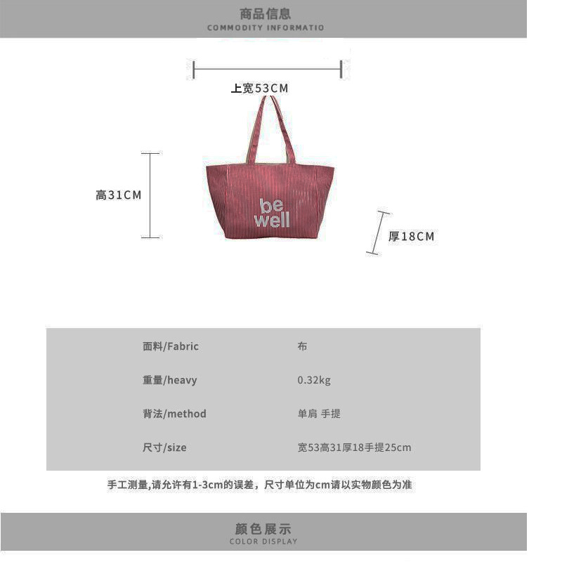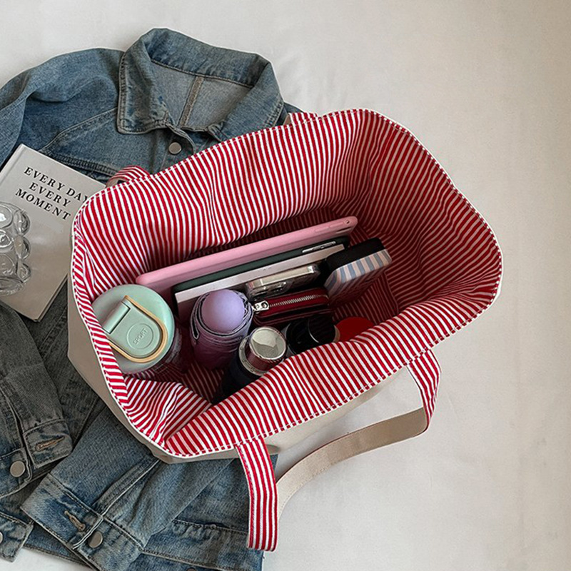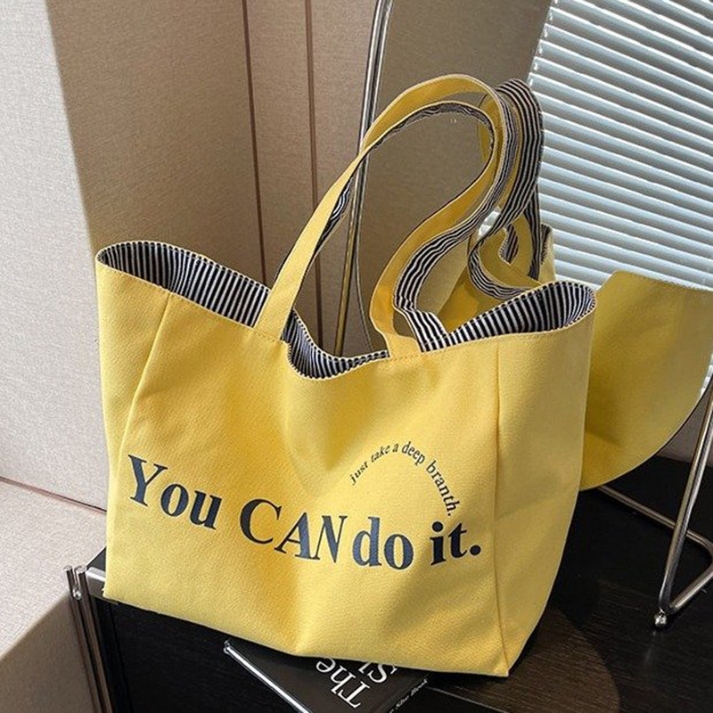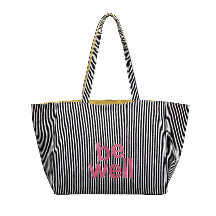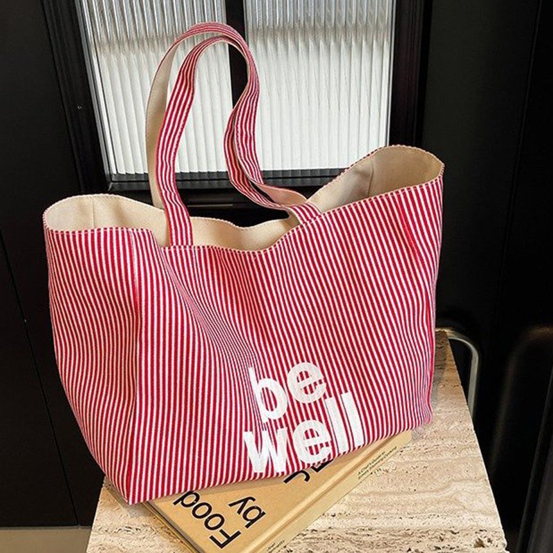 한국판 신형 대용량 토트백, 앞뒤 양면 패션 스트라이프 캔버스백, 학생용 레터프린트백