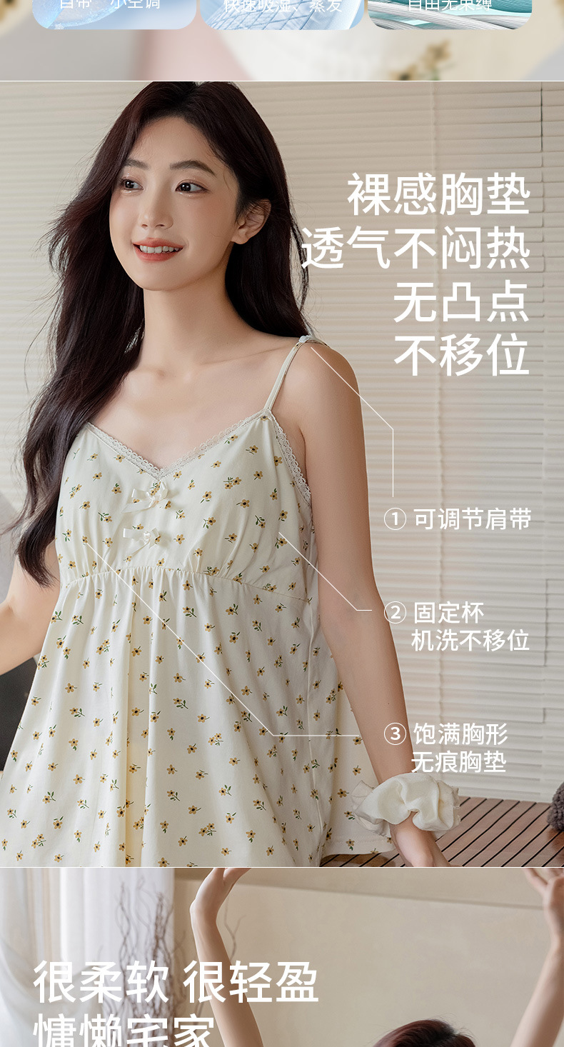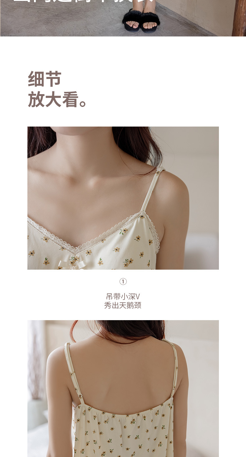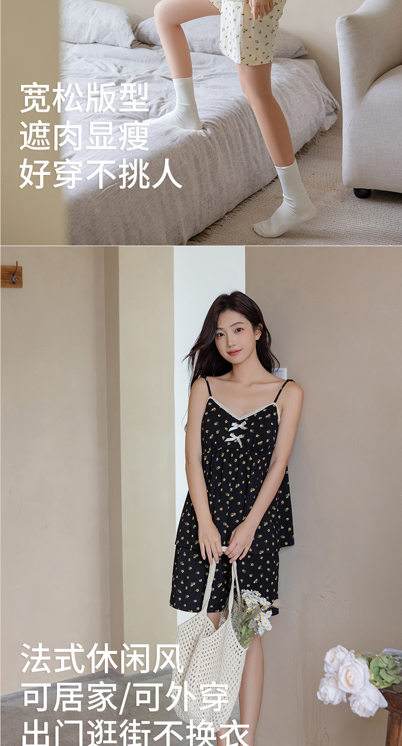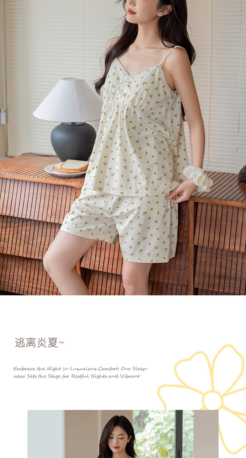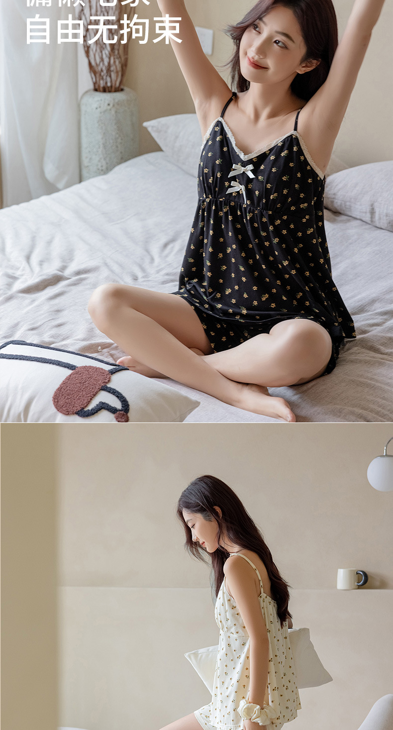 란징 모달 코튼 벨트 가슴 패드 슬링 파자마 여성의 여름 섹시한 달콤한 작은 꽃 홈 옷 투피스 세트