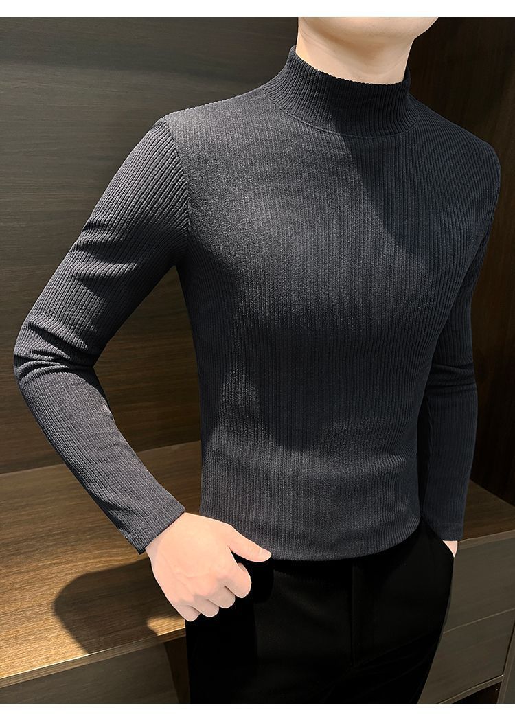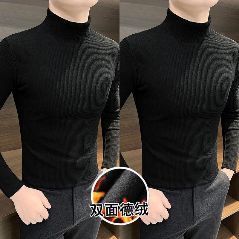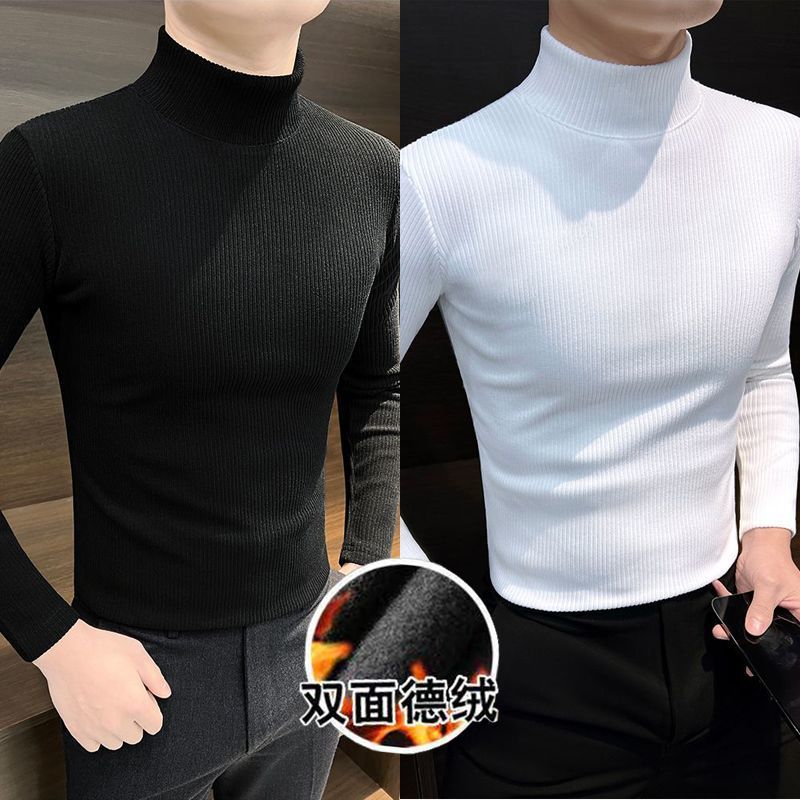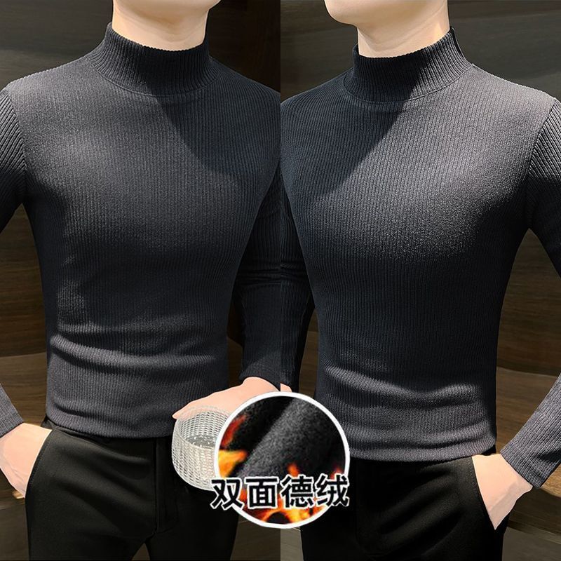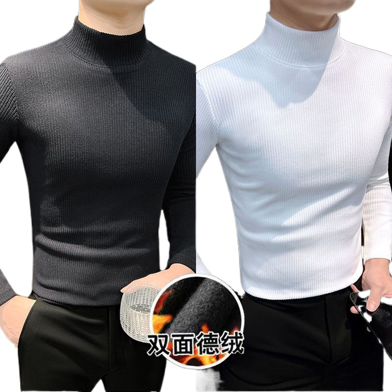 하프 하이 칼라베이스 셔츠 남자 가을과 겨울 2024 새로운 미드 칼라 벨벳 따뜻한 남자 내부 긴팔 티셔츠
