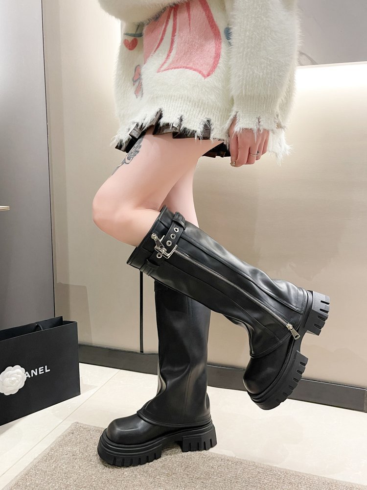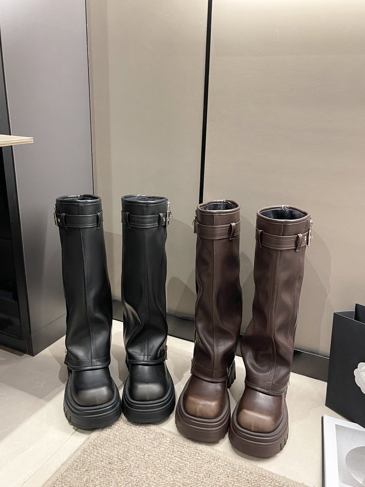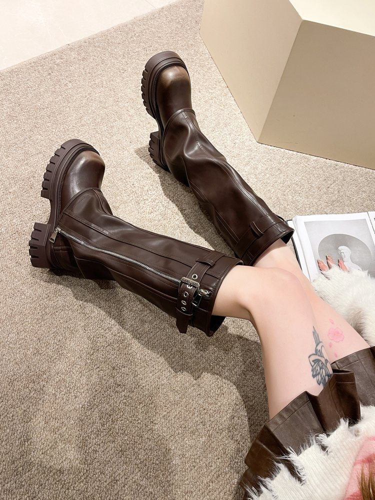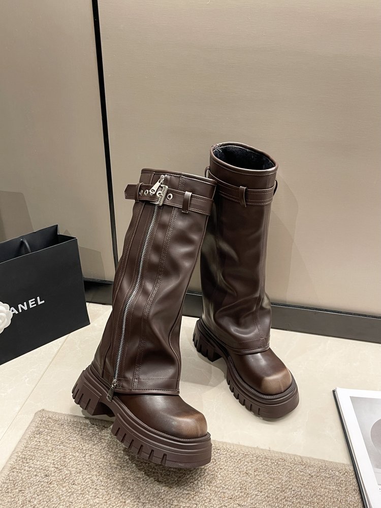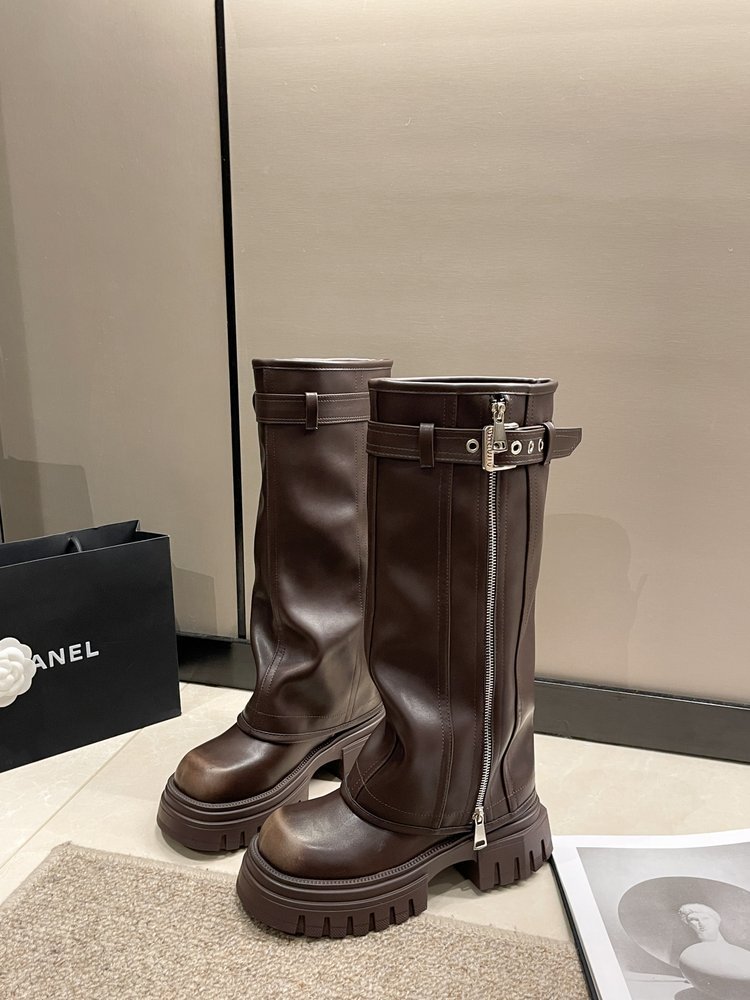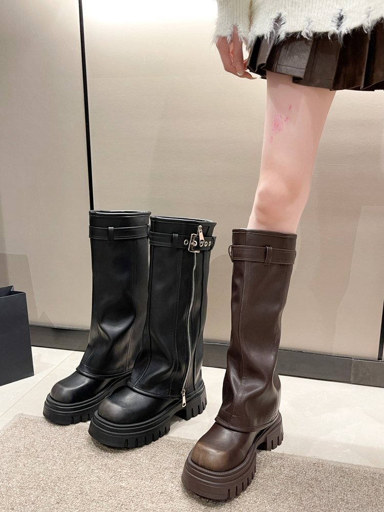스타일리시하게 강화 된 두꺼운 바닥 다크 브라운 여성용 새로운 두꺼운 다리 롱 부츠 2024 웨스턴 청바지 튜브 부츠