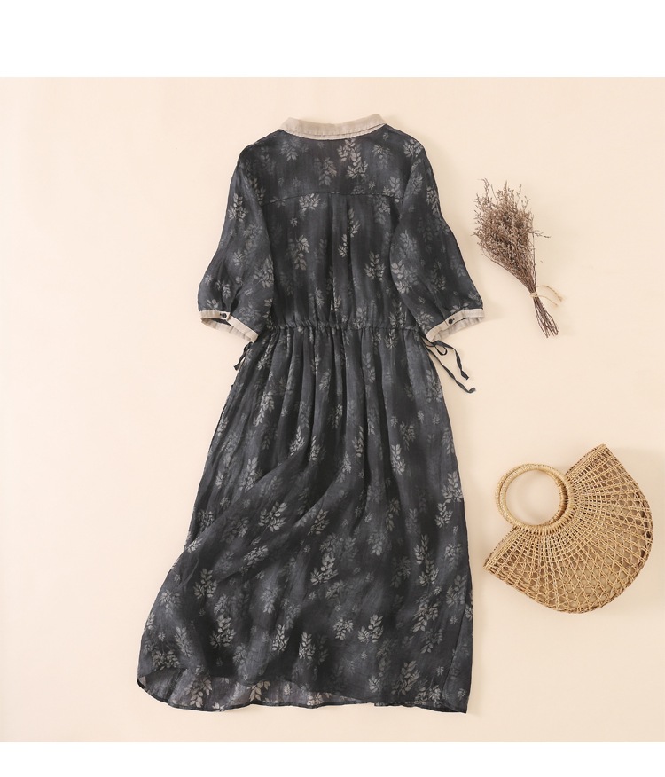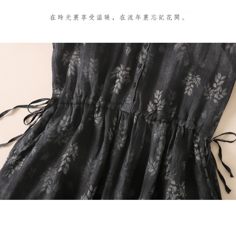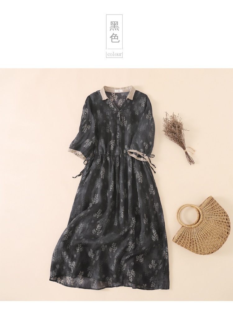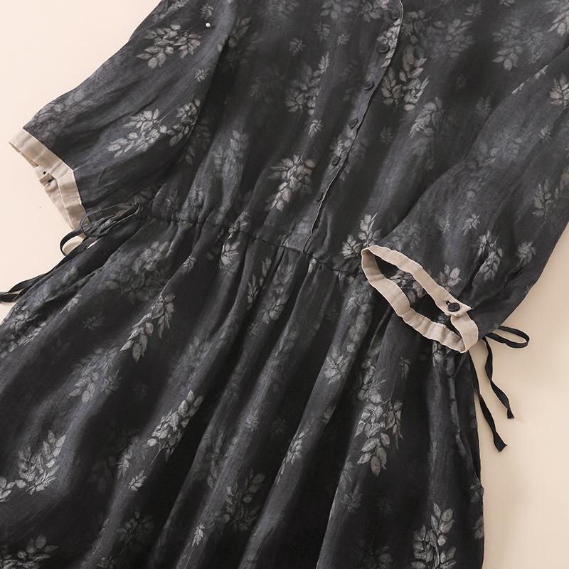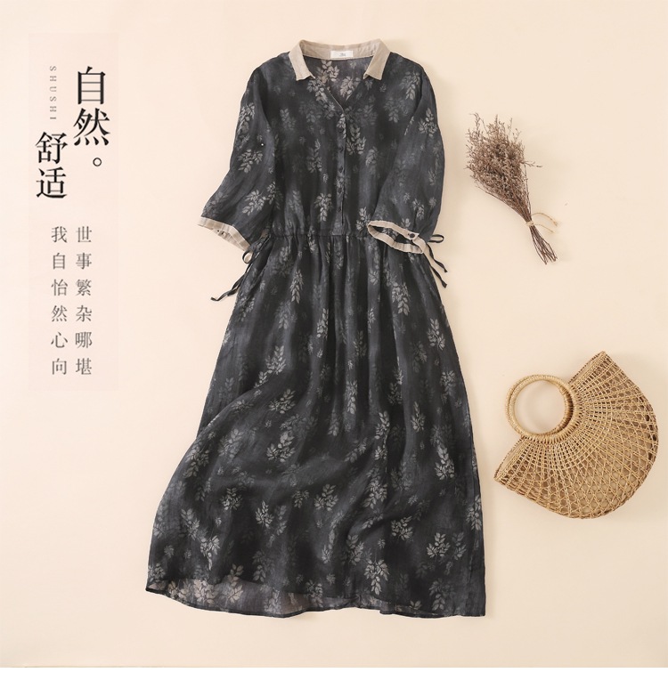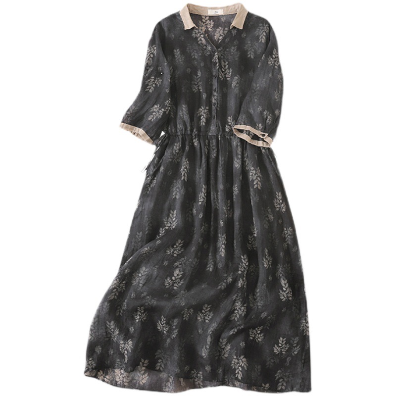 2025 봄 새 스타일 프린트 옷깃 얇은 면과 리넨 셔츠 원피스 여성용 느슨한 플러스 사이즈 단단한 허리 슬리밍 반팔 원피스