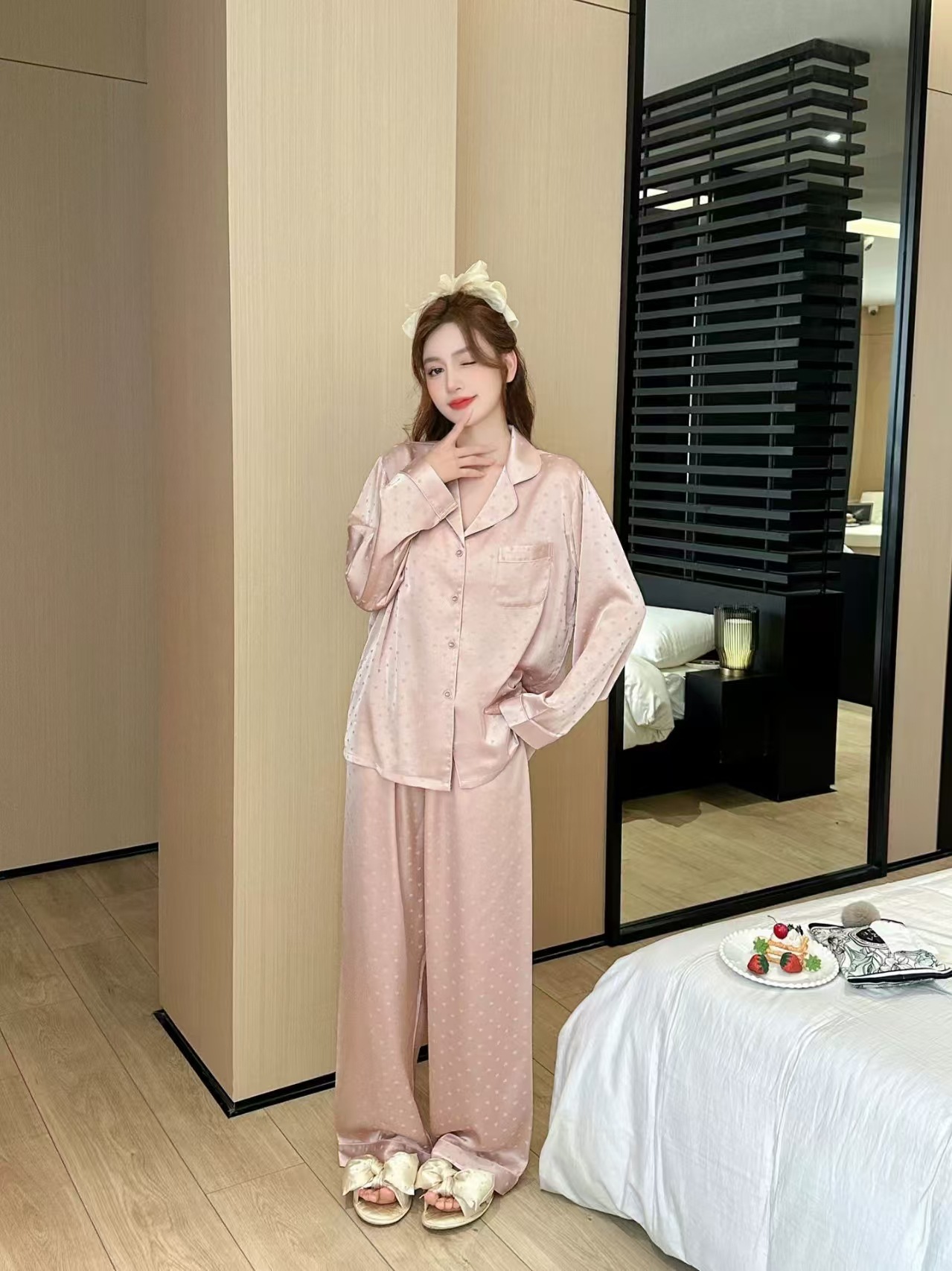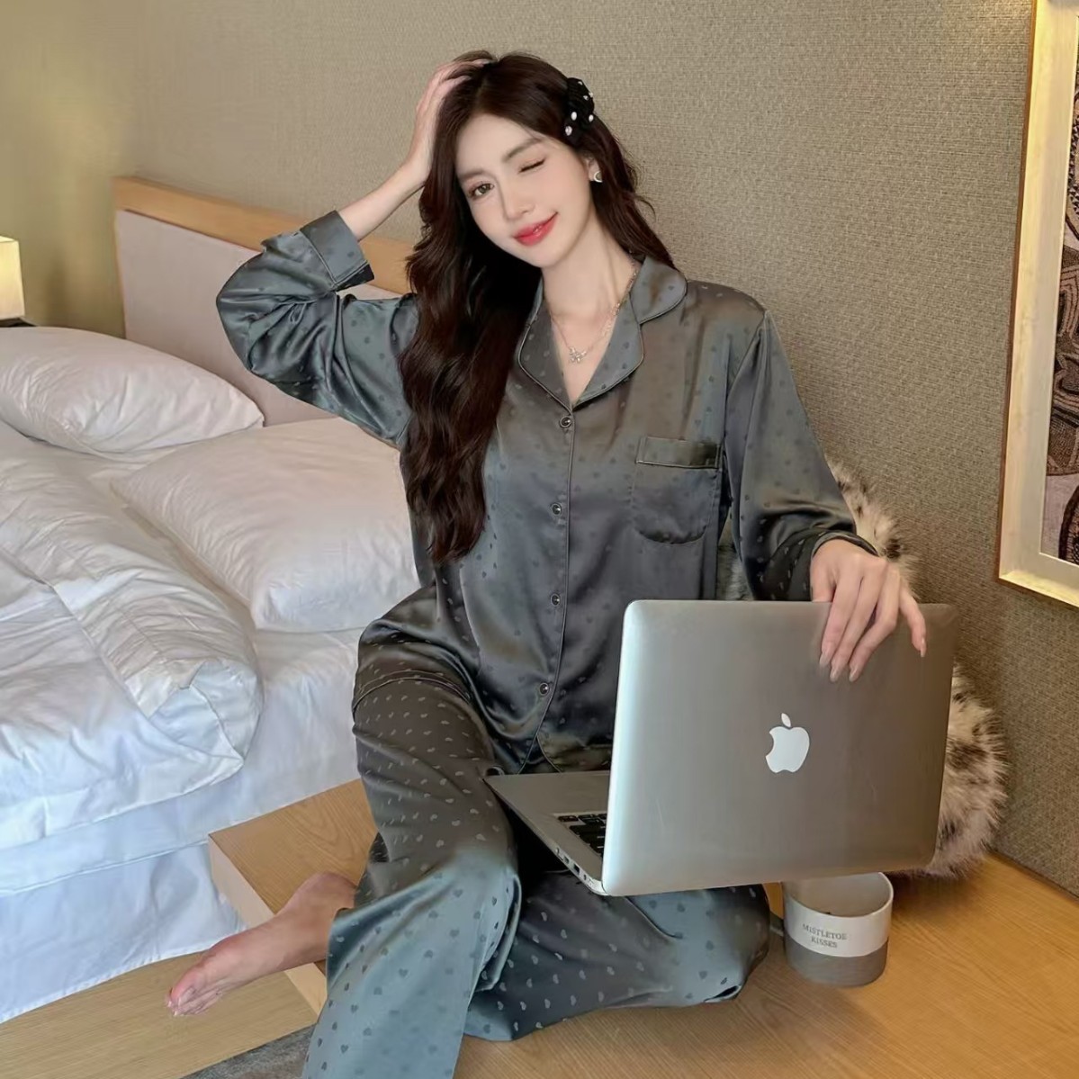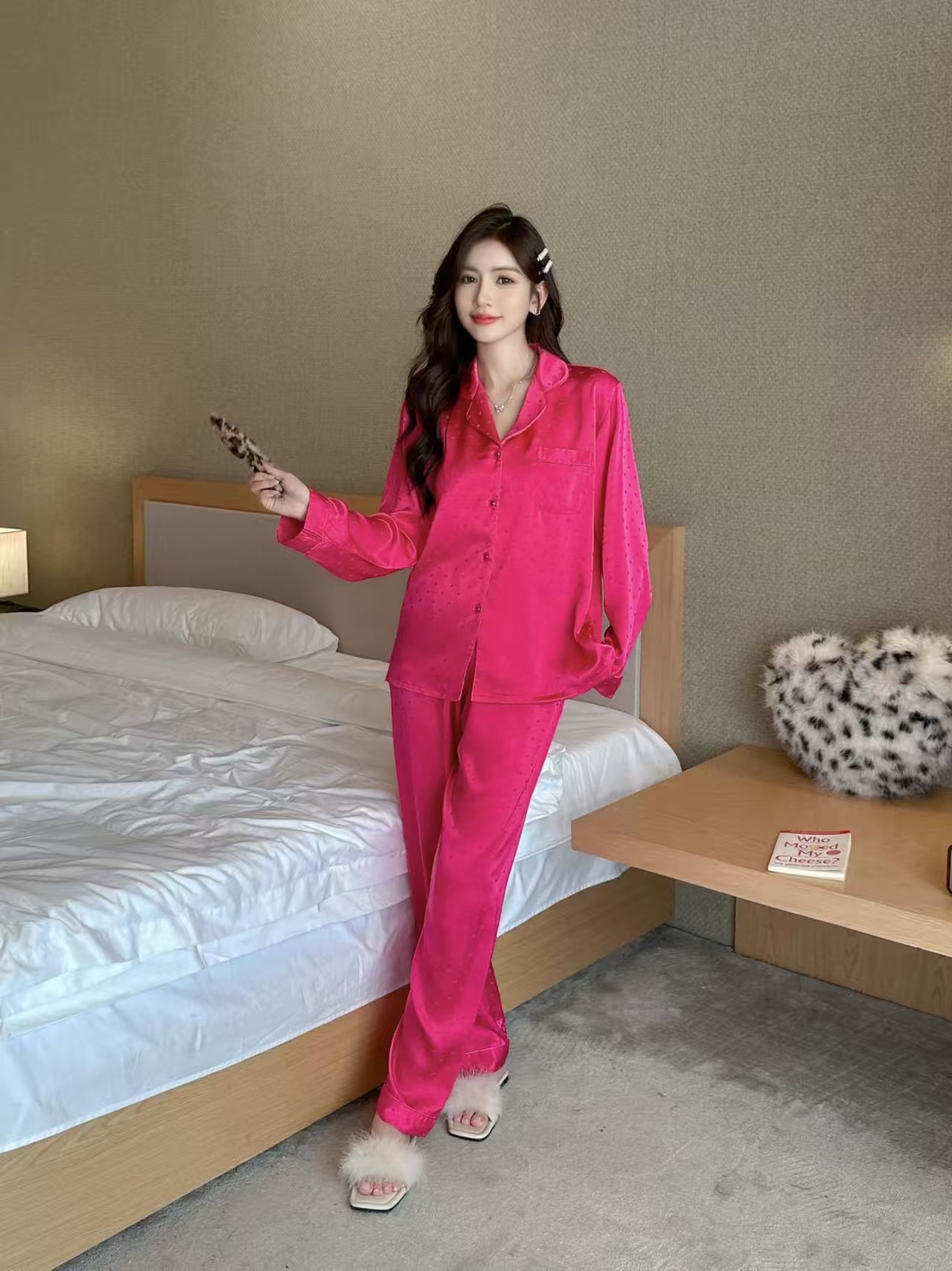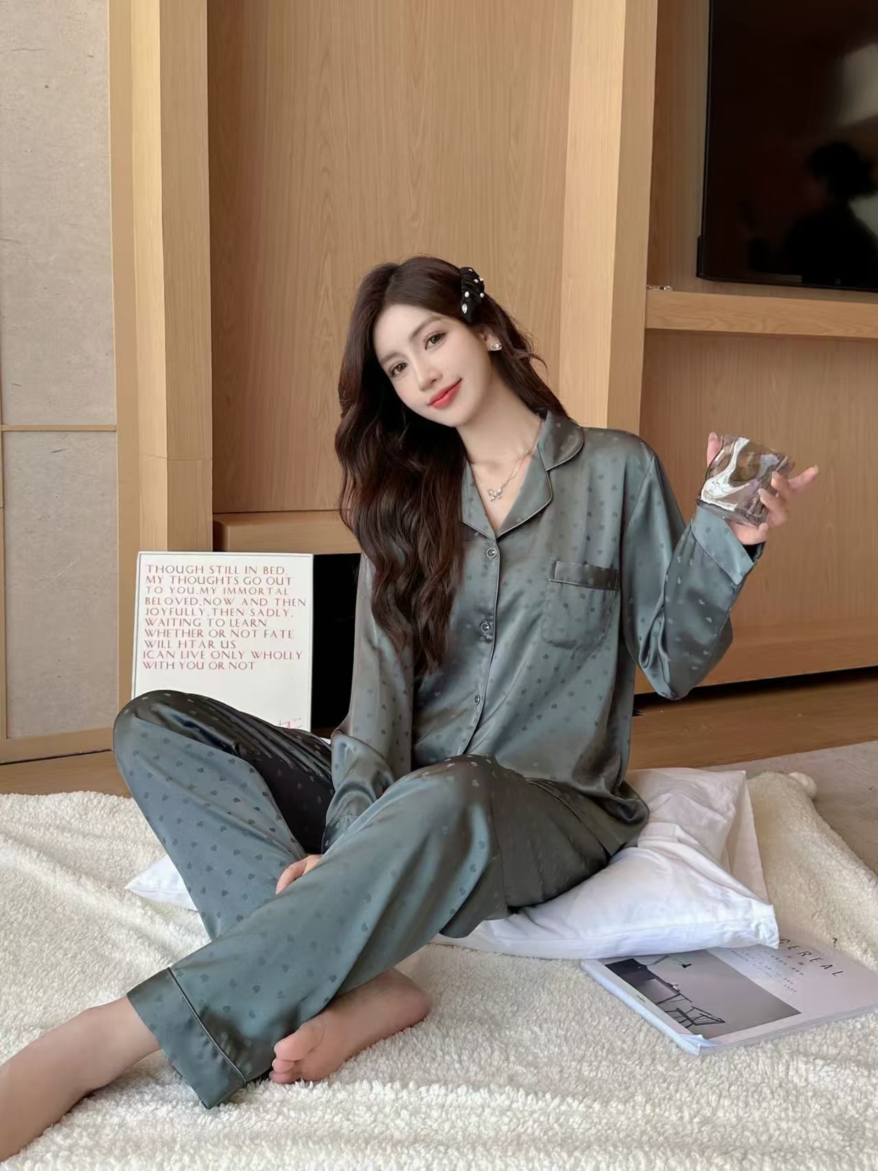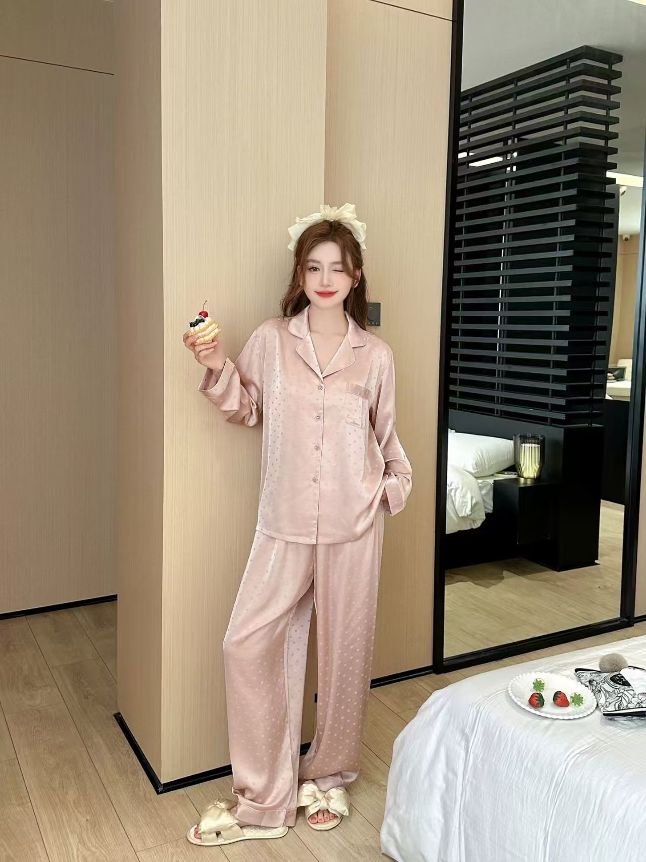 아이스 실크 잠옷 여성 봄과 가을 여름 실크 하이 엔드 자카드 긴팔 세트 새로운 여성 얇은 홈 옷