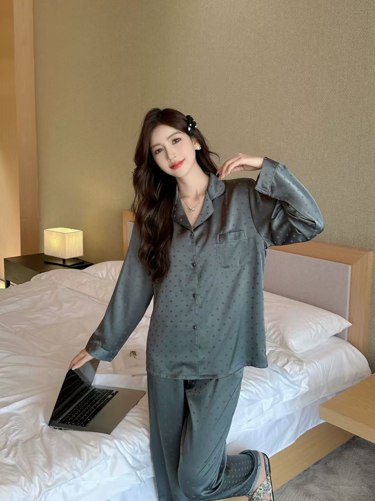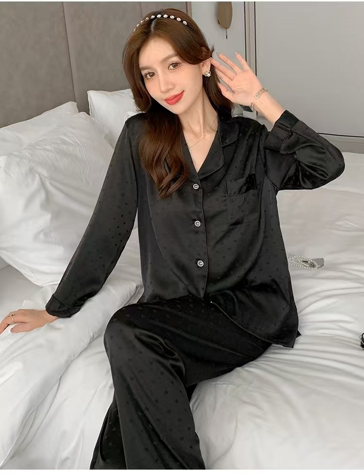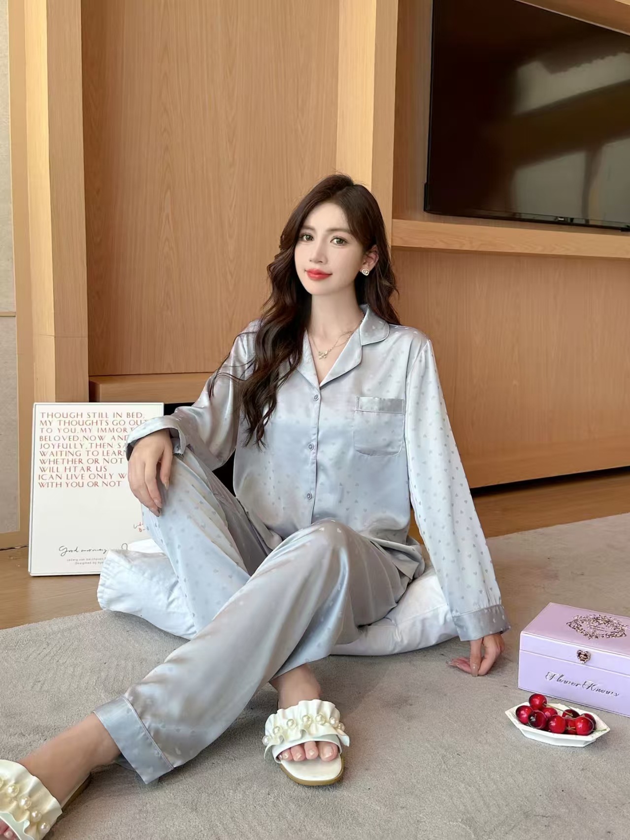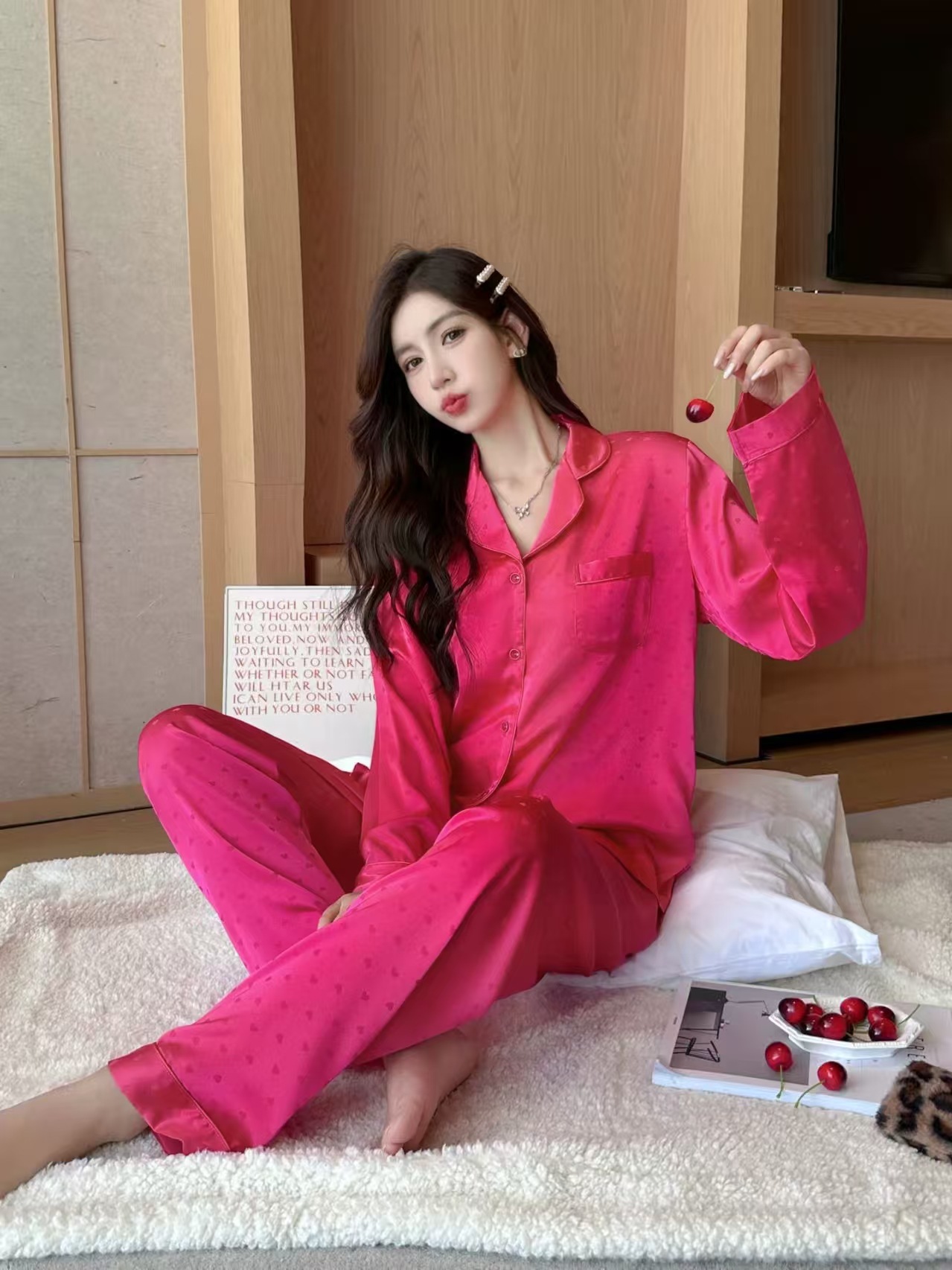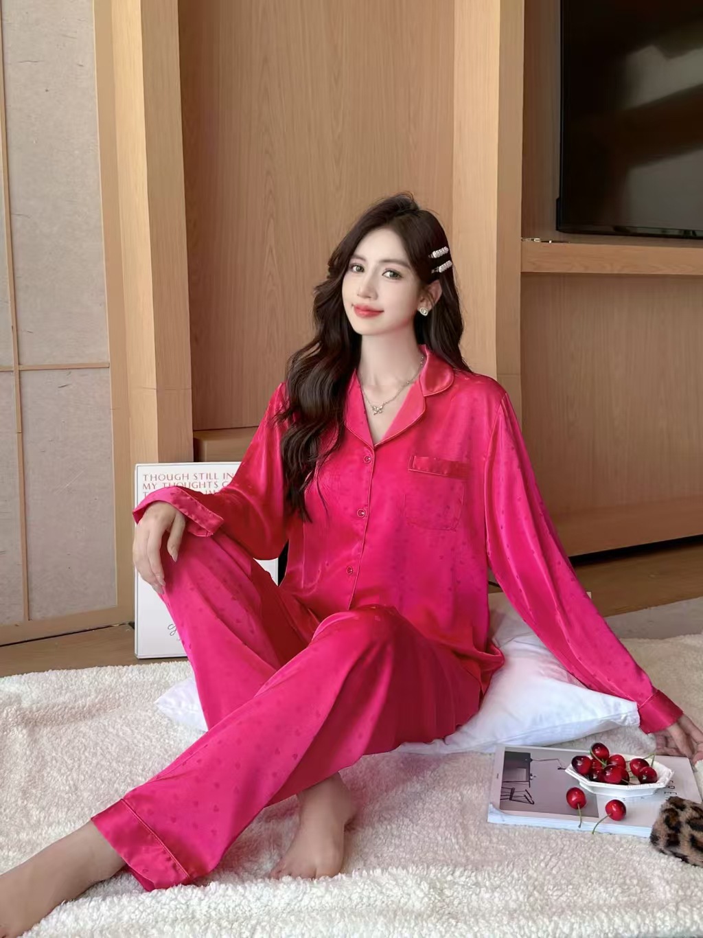 아이스 실크 잠옷 여성 봄과 가을 여름 실크 하이 엔드 자카드 긴팔 세트 새로운 여성 얇은 홈 옷