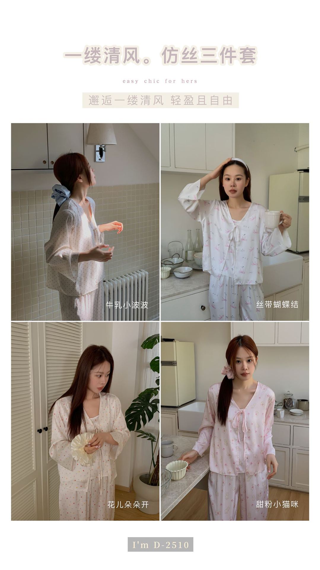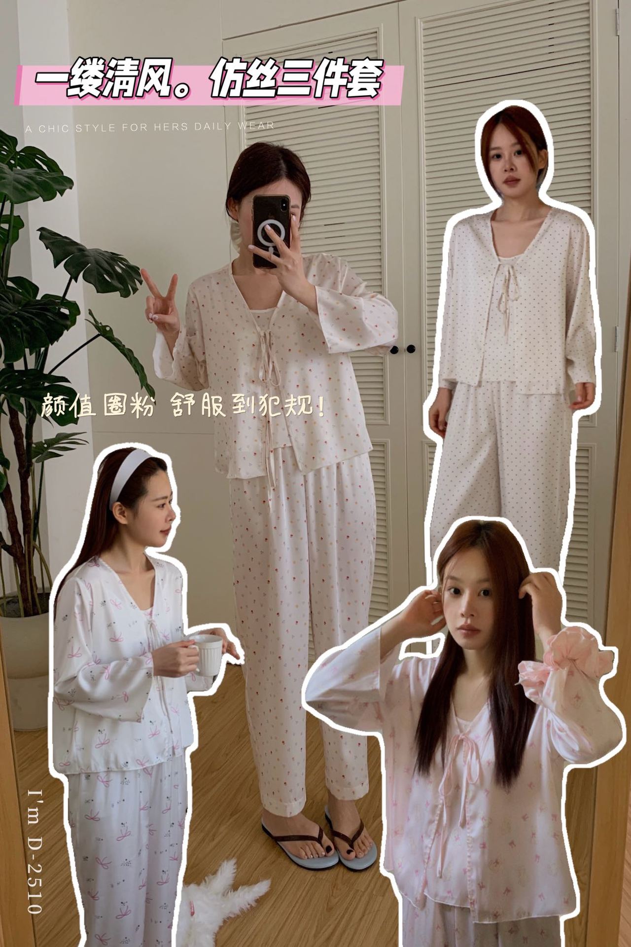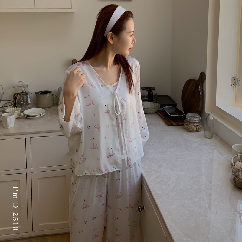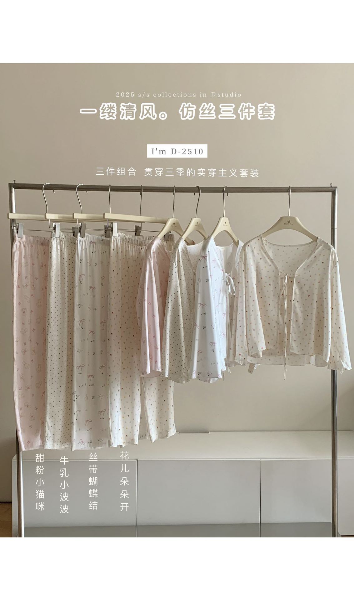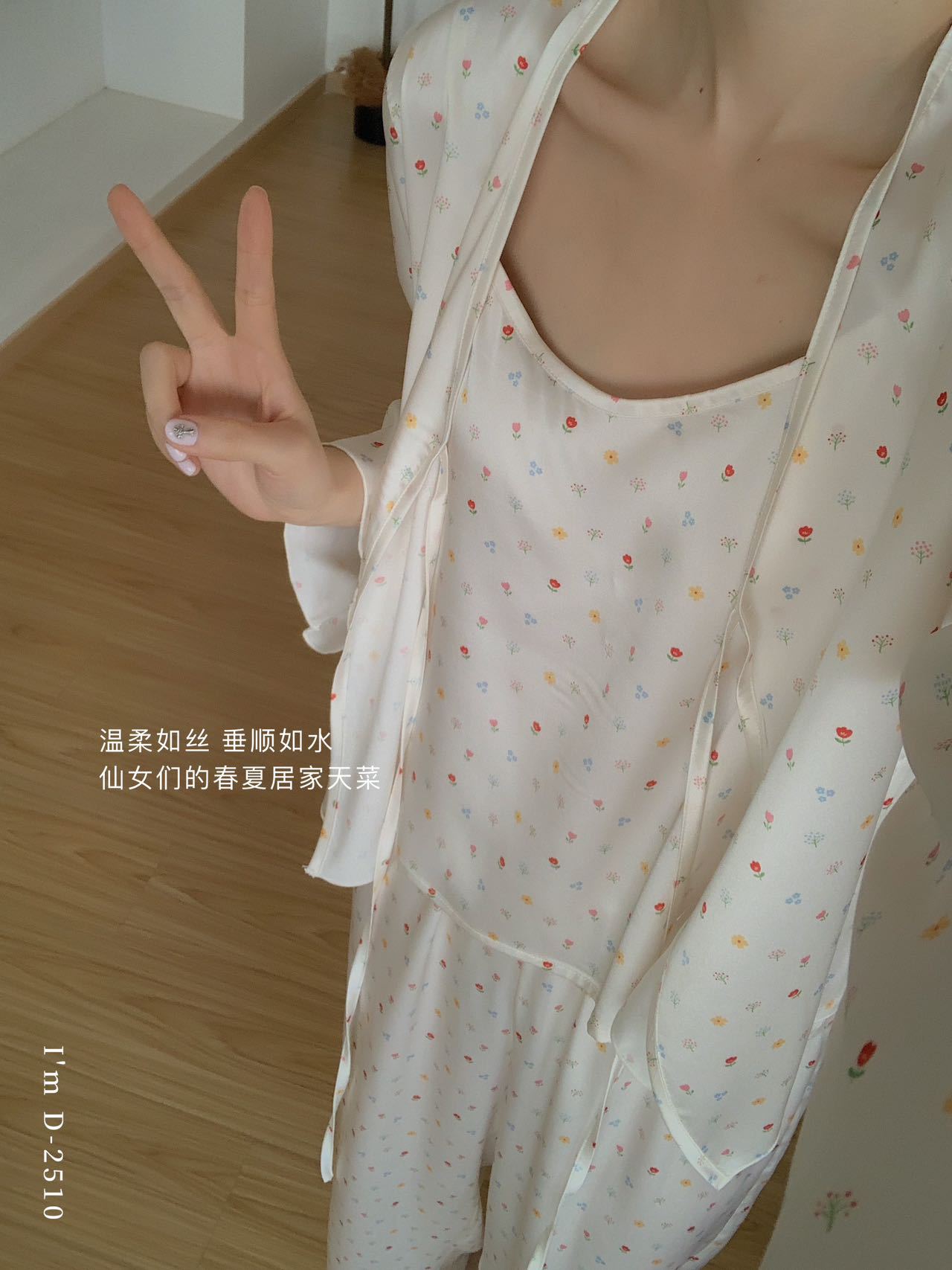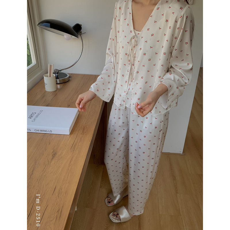 Du Xiaozhai 시원한 산들 모조 실크 3 피스 세트 고급 실크 서스펜더 카디건 바지 홈 의류 여성이 밖에서 입을 수있는