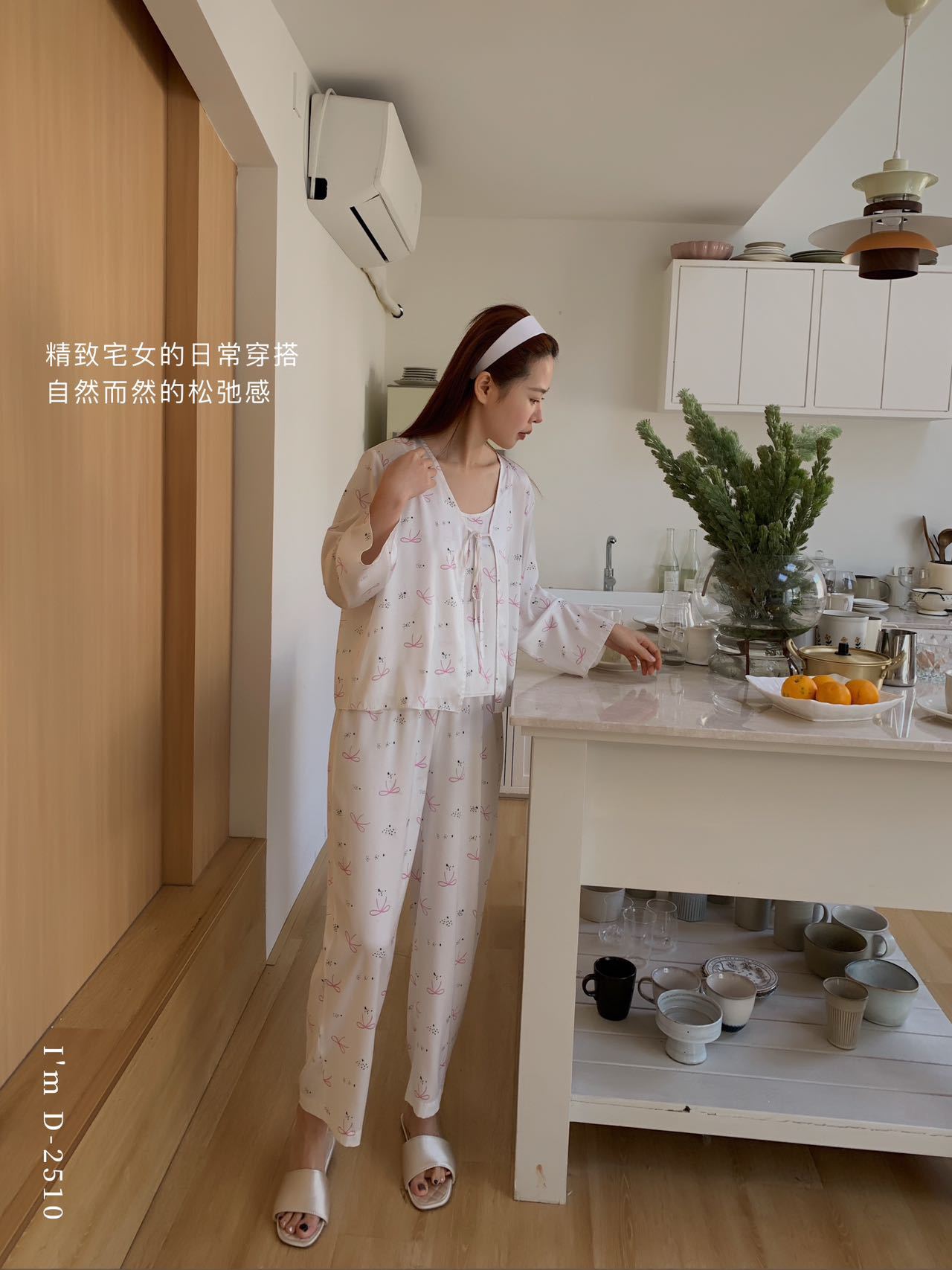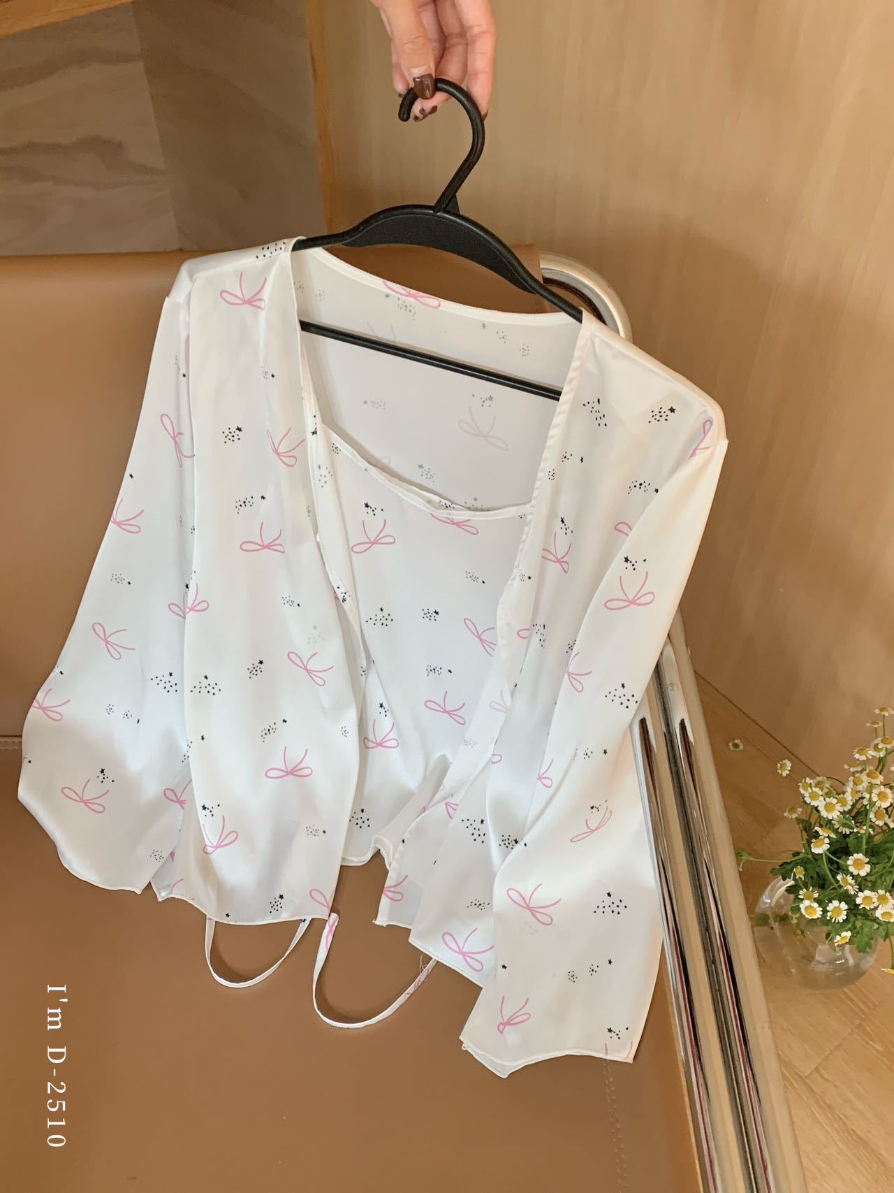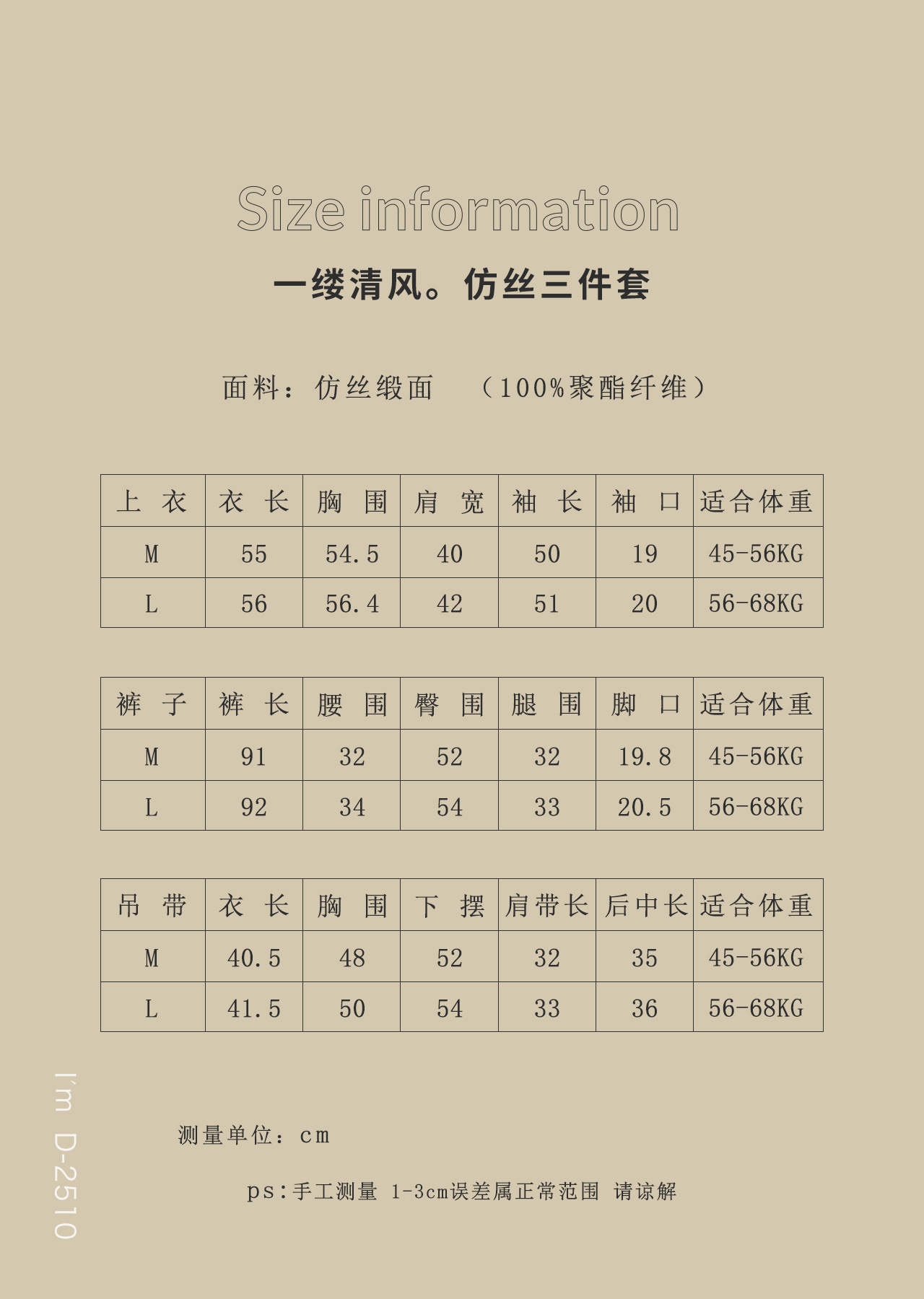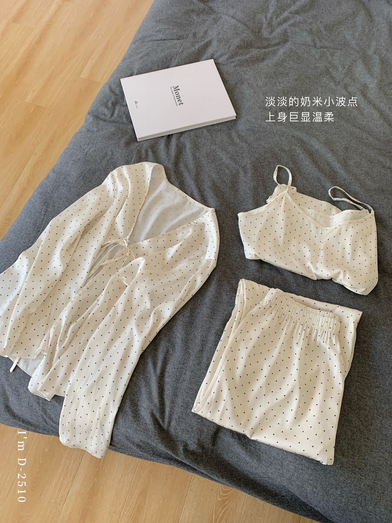 Du Xiaozhai 시원한 산들 모조 실크 3 피스 세트 고급 실크 서스펜더 카디건 바지 홈 의류 여성이 밖에서 입을 수있는