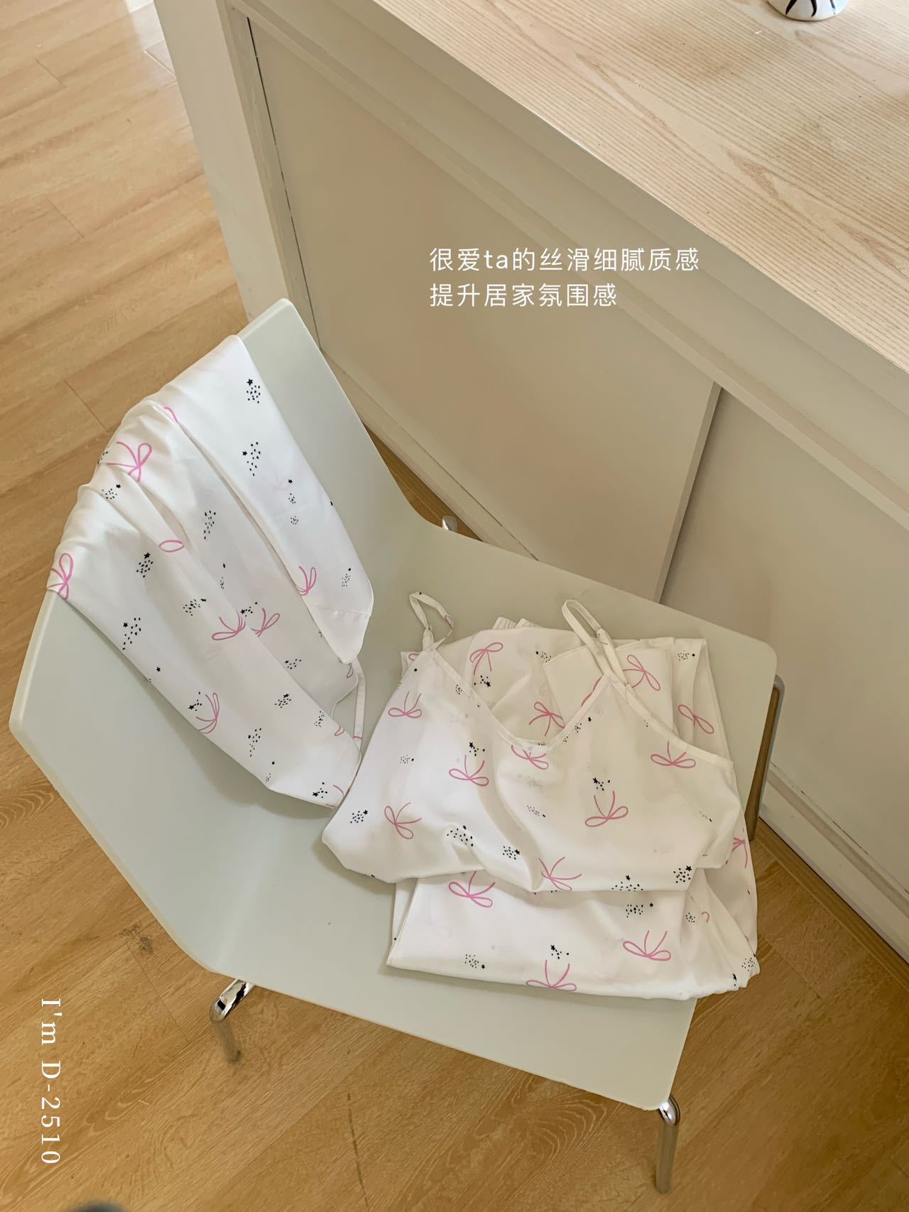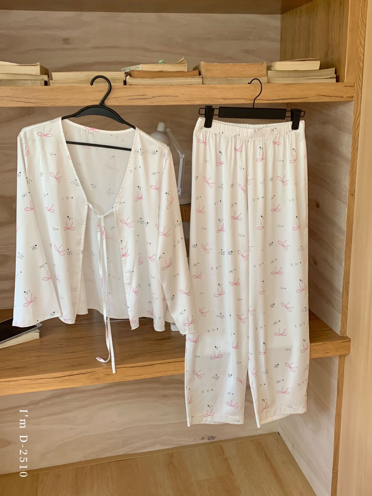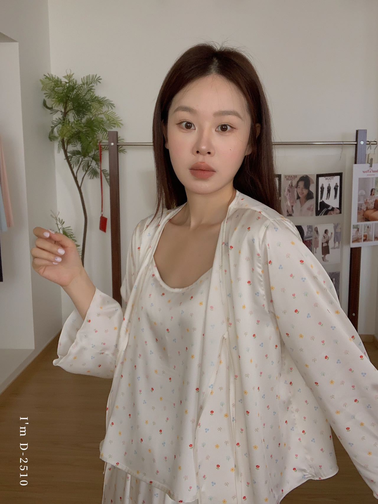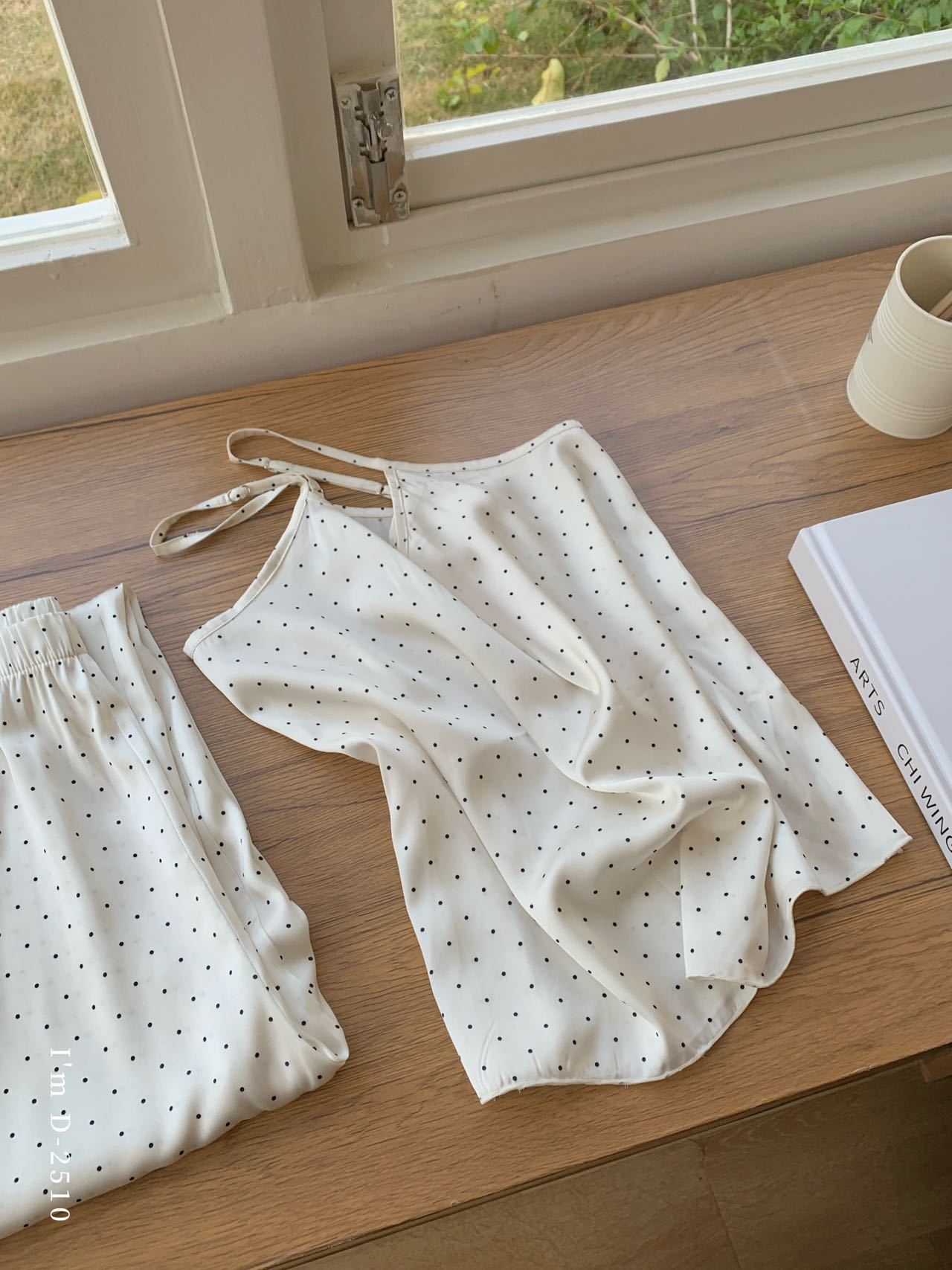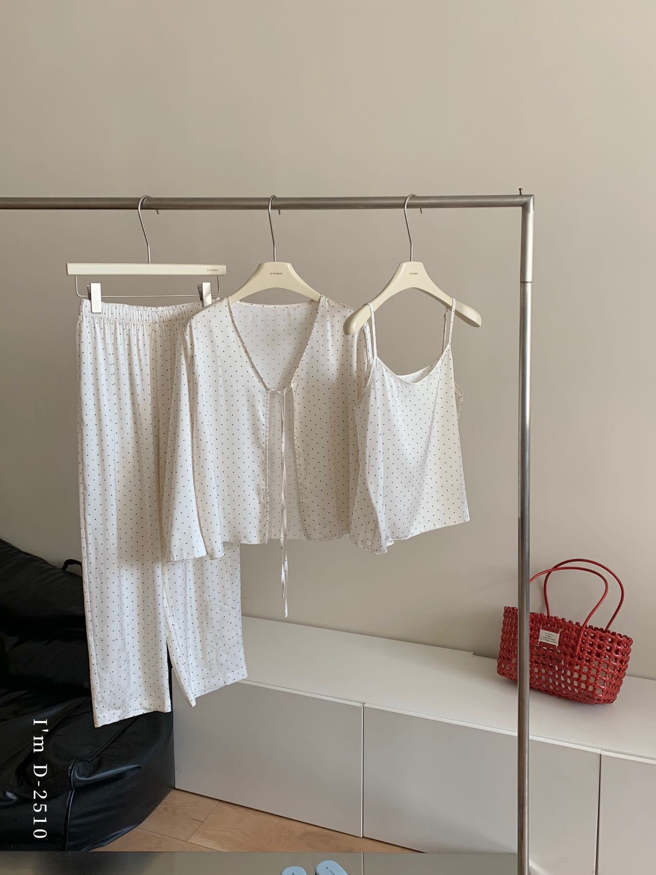 Du Xiaozhai 시원한 산들 모조 실크 3 피스 세트 고급 실크 서스펜더 카디건 바지 홈 의류 여성이 밖에서 입을 수있는