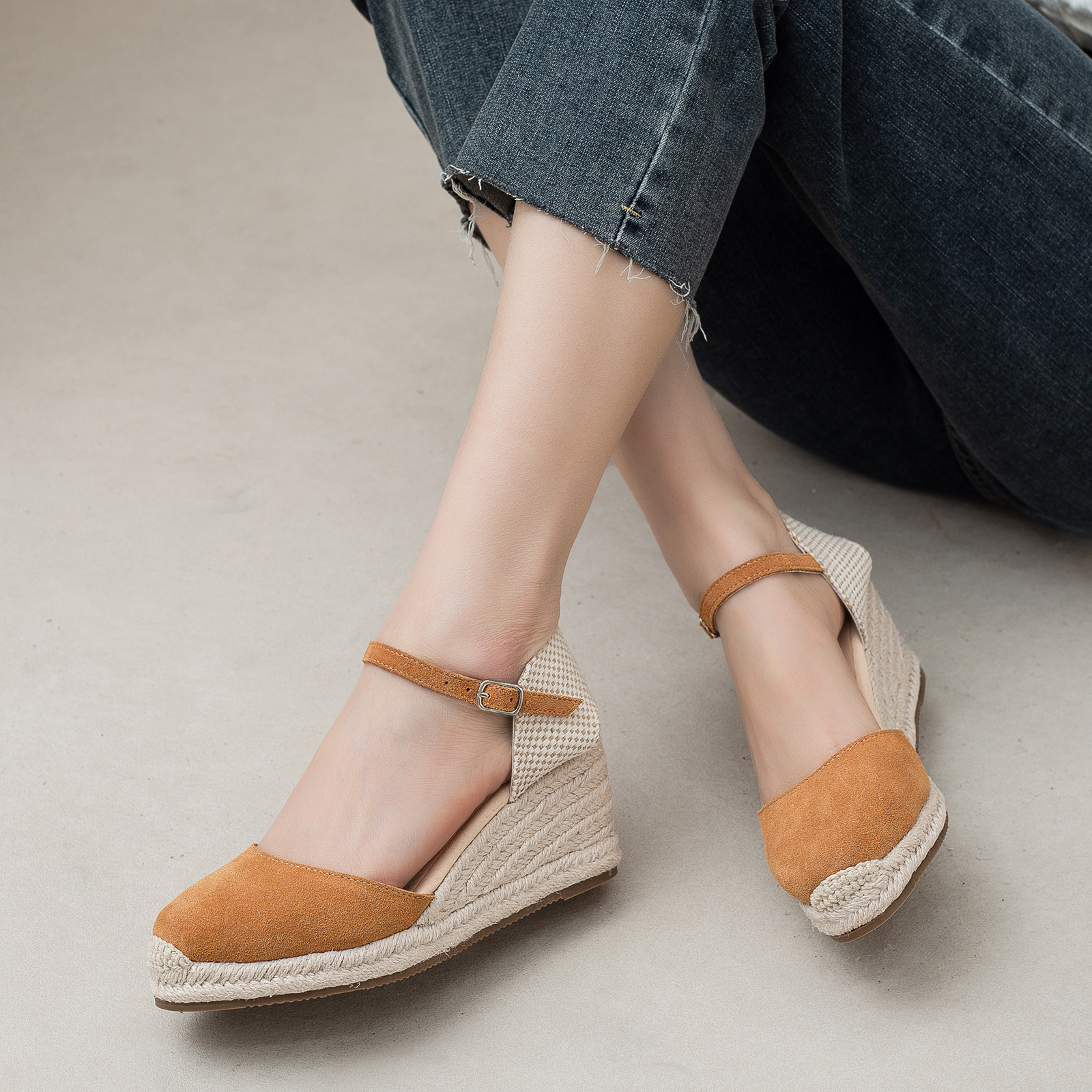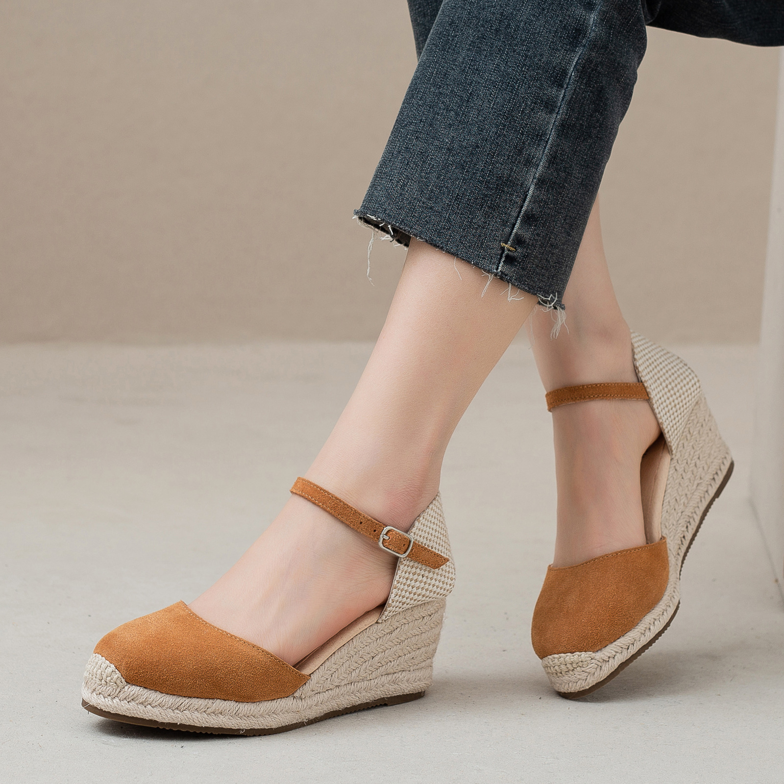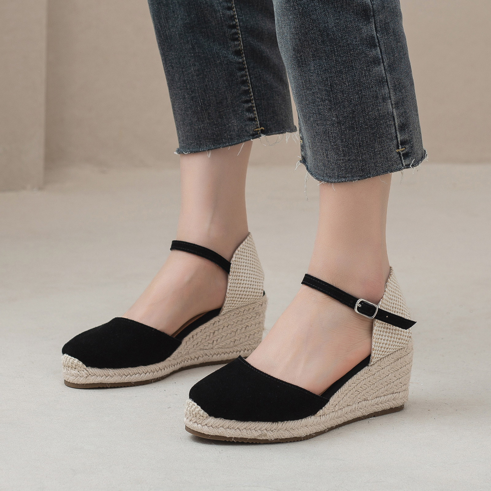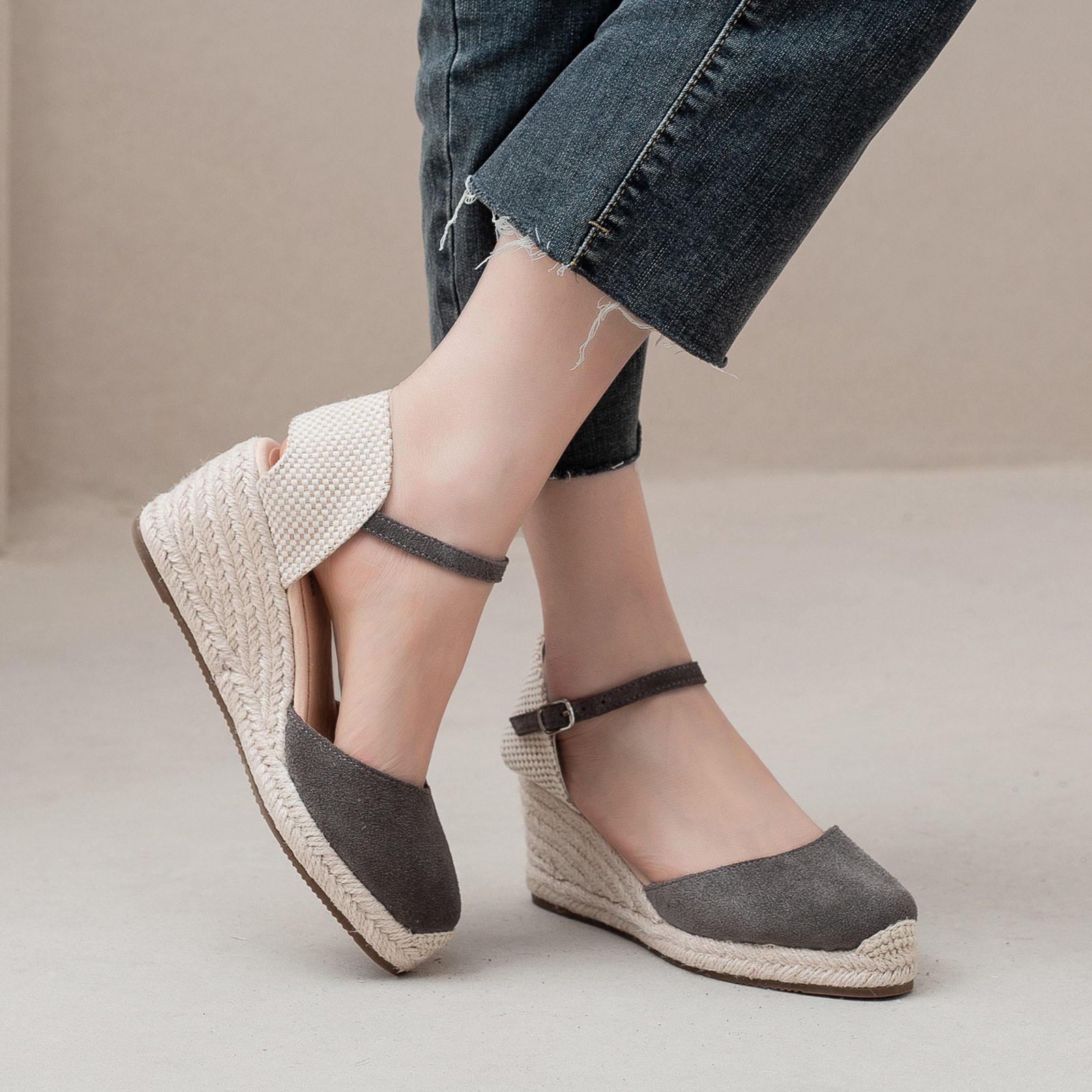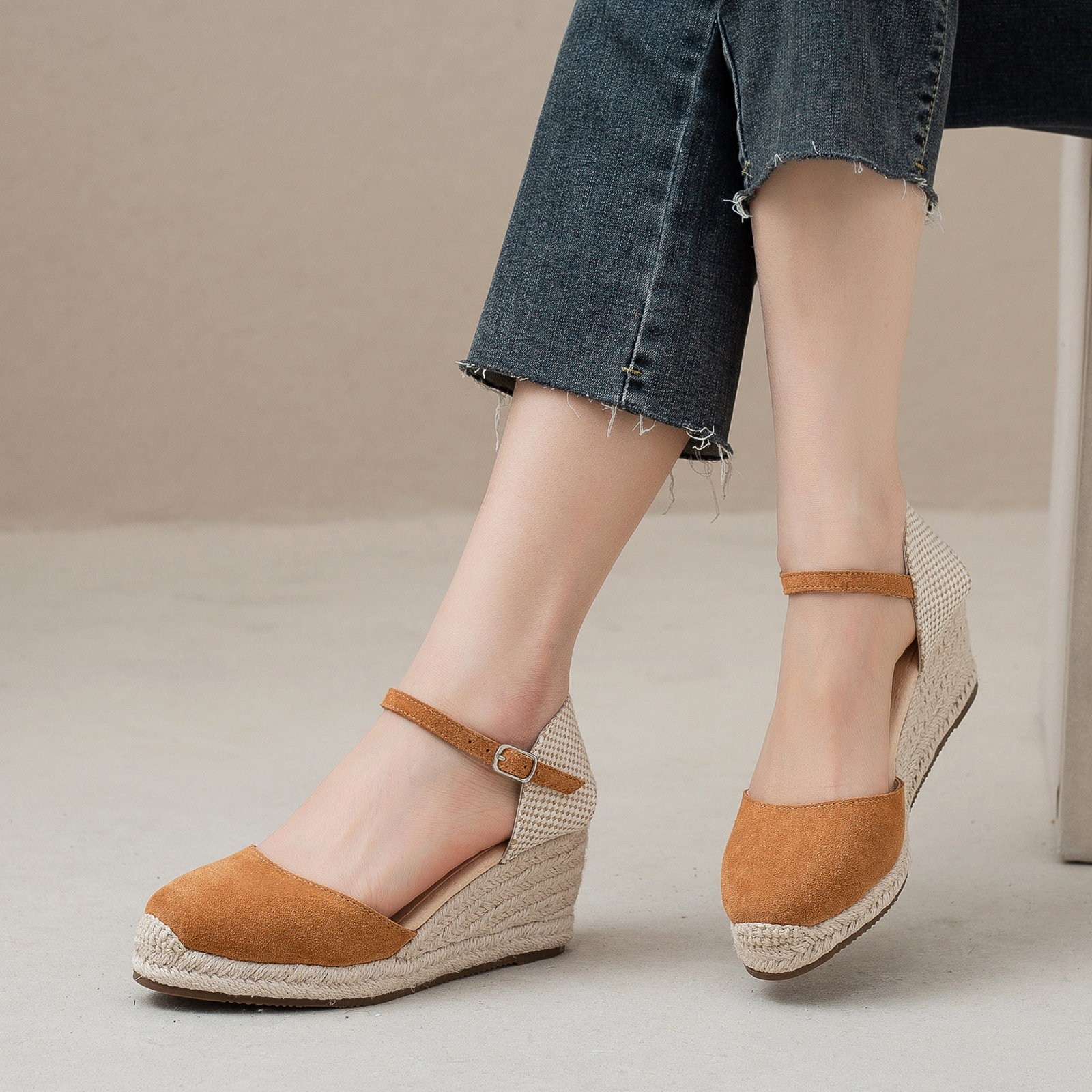 밀짚 웨지 샌들 봄과 여름 유럽과 미국 패션 새로운 소 벨벳 통기성 땀 흡수성 캐주얼 얕은 입 패션 여성 우아한