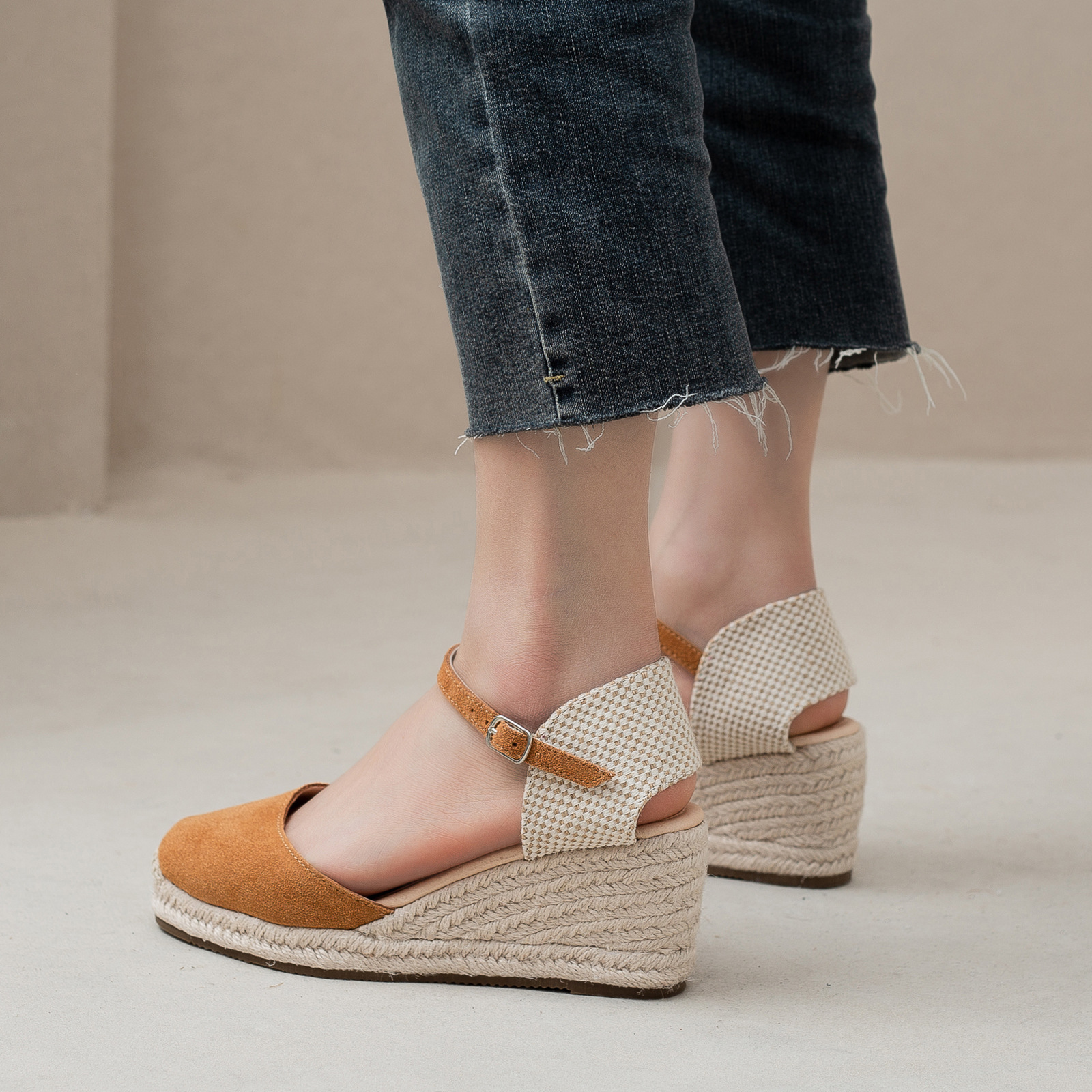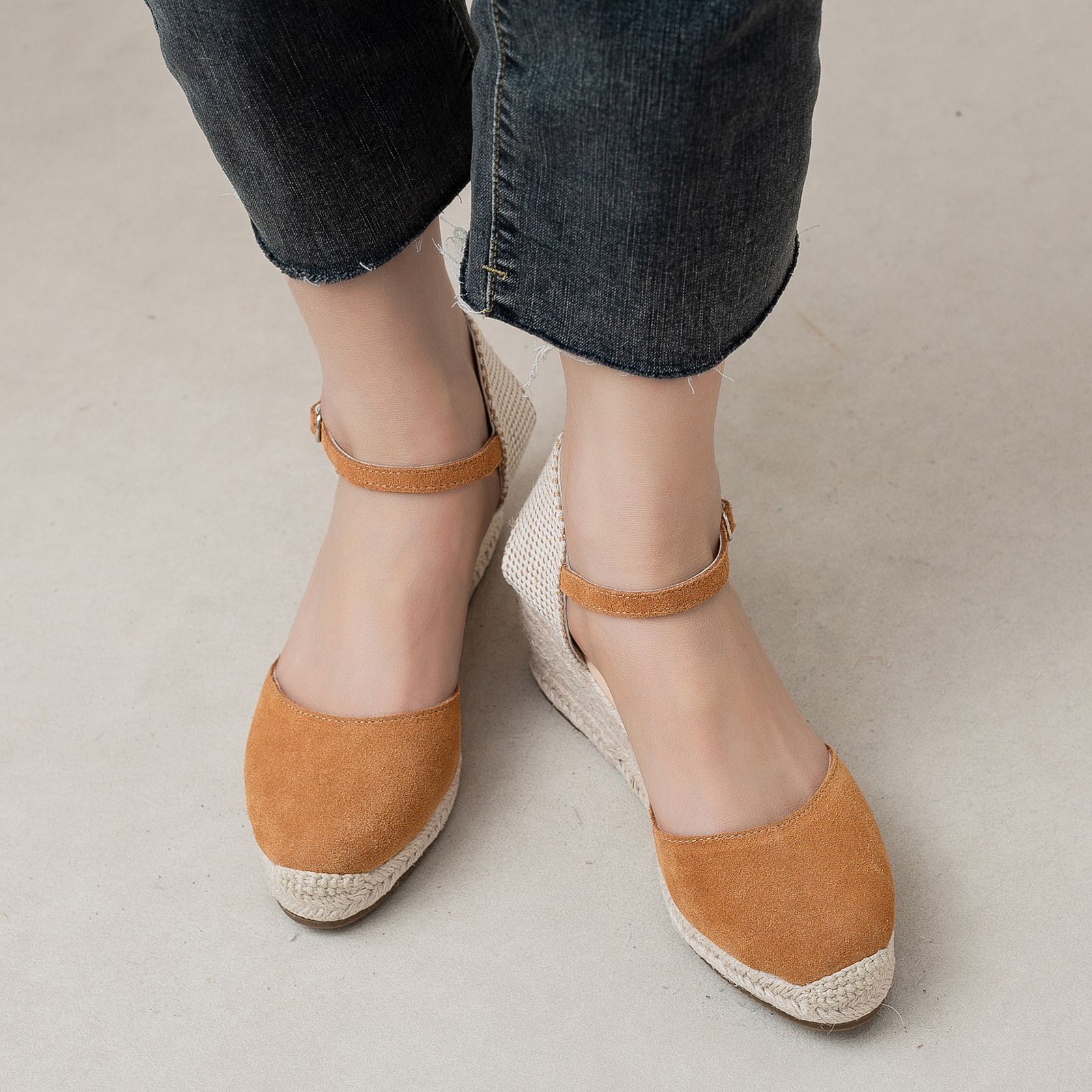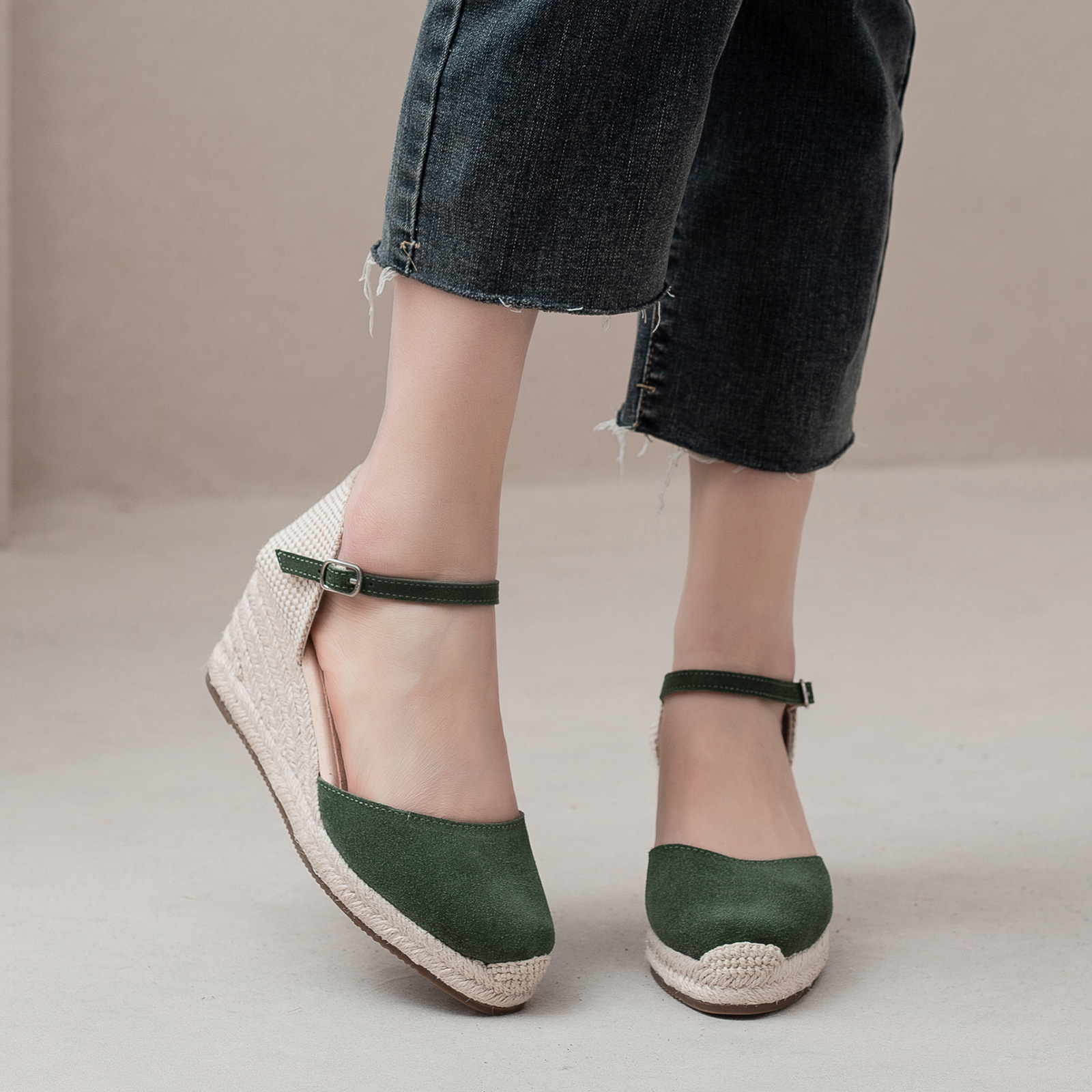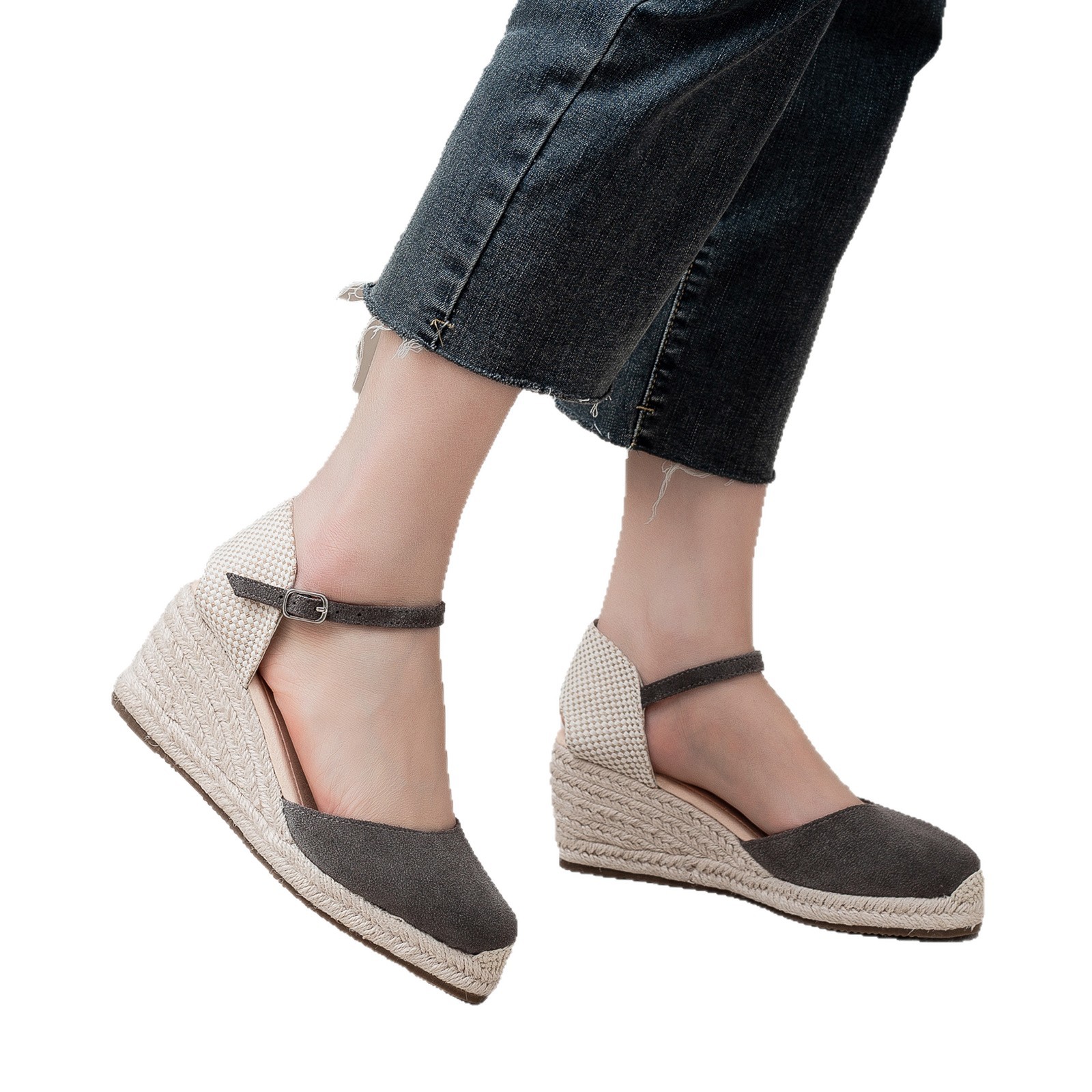 밀짚 웨지 샌들 봄과 여름 유럽과 미국 패션 새로운 소 벨벳 통기성 땀 흡수성 캐주얼 얕은 입 패션 여성 우아한