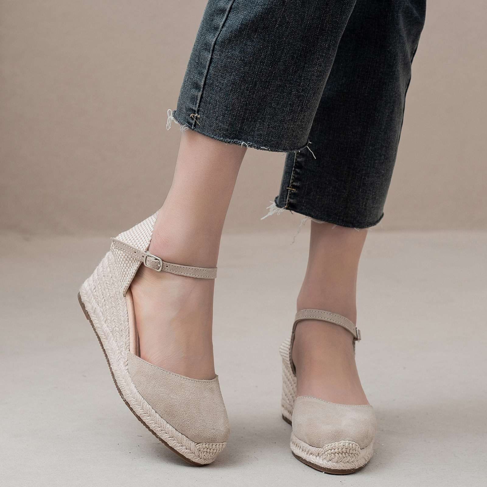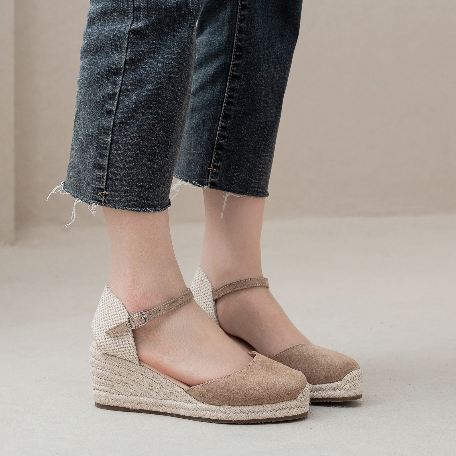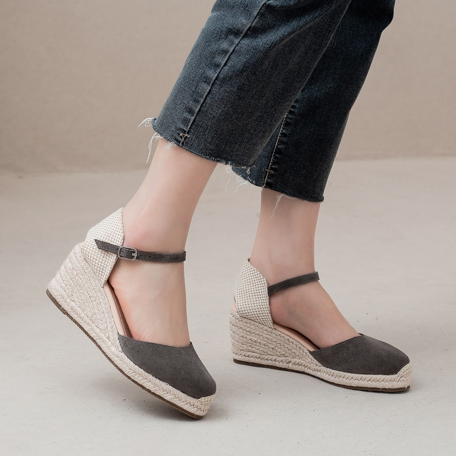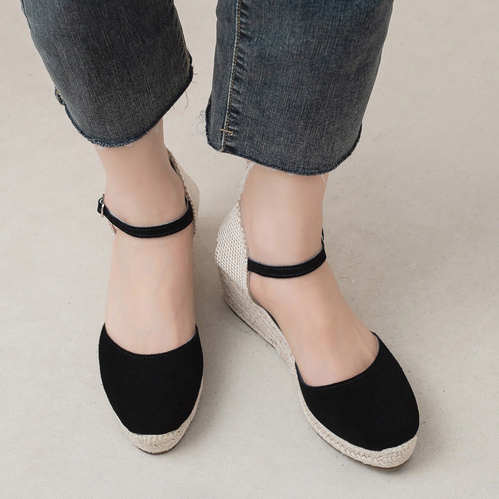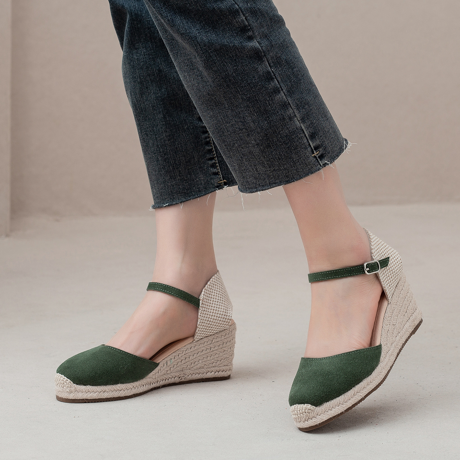 밀짚 웨지 샌들 봄과 여름 유럽과 미국 패션 새로운 소 벨벳 통기성 땀 흡수성 캐주얼 얕은 입 패션 여성 우아한
