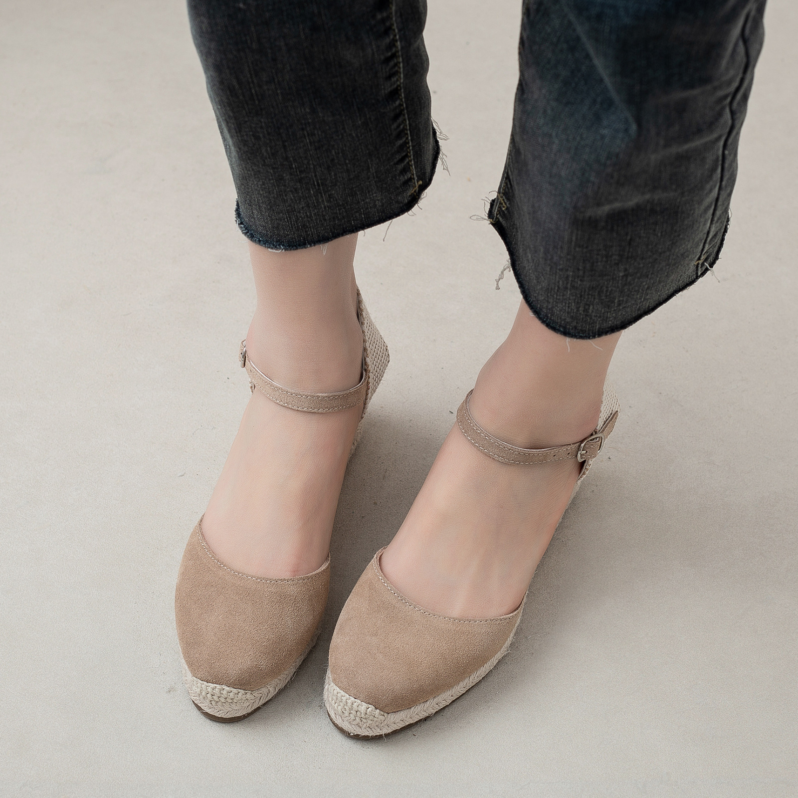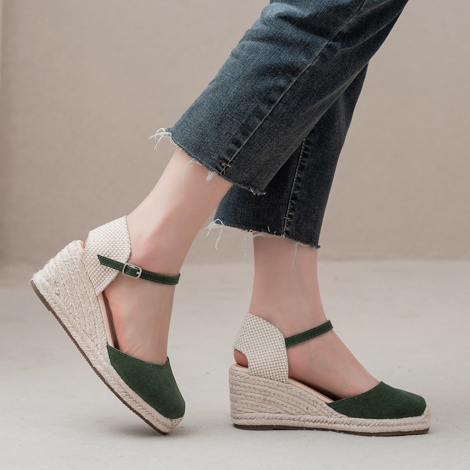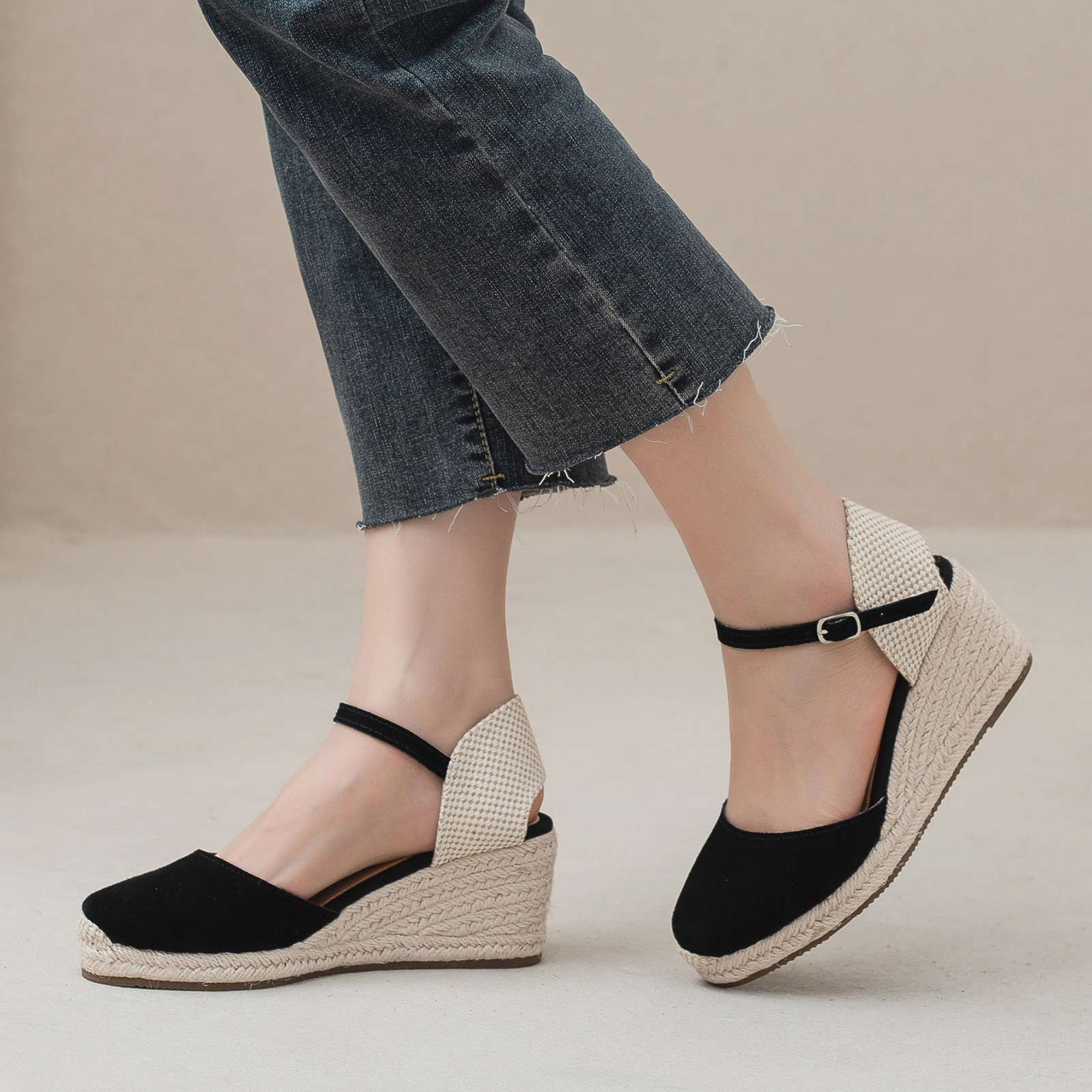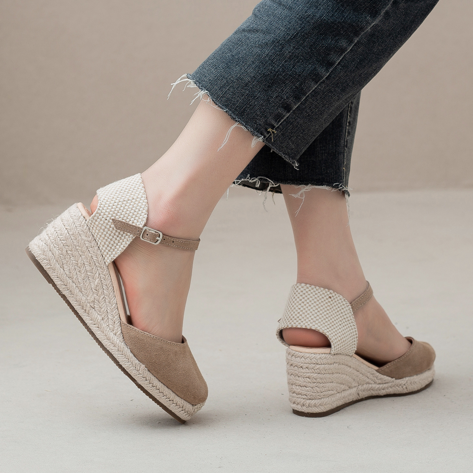 밀짚 웨지 샌들 봄과 여름 유럽과 미국 패션 새로운 소 벨벳 통기성 땀 흡수성 캐주얼 얕은 입 패션 여성 우아한