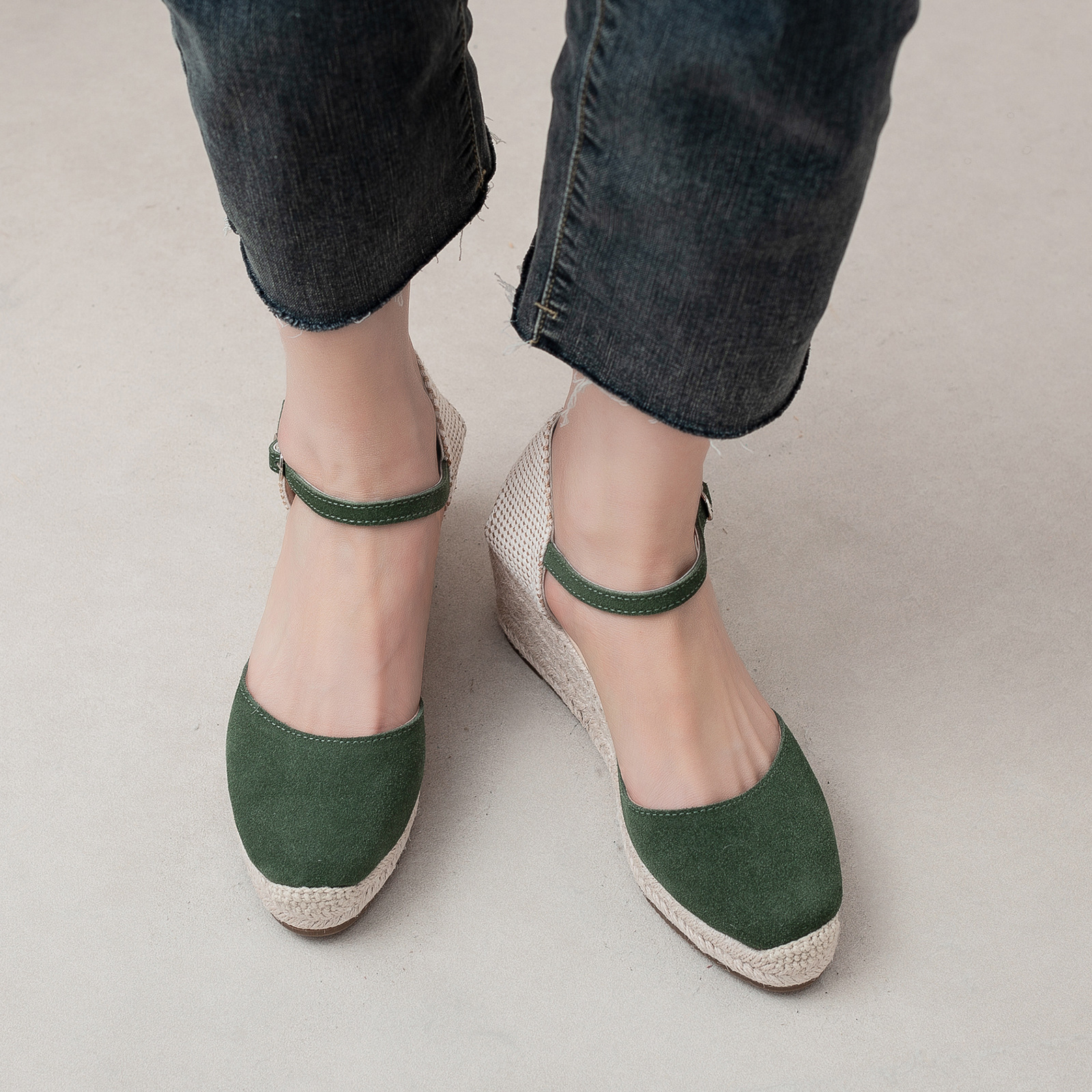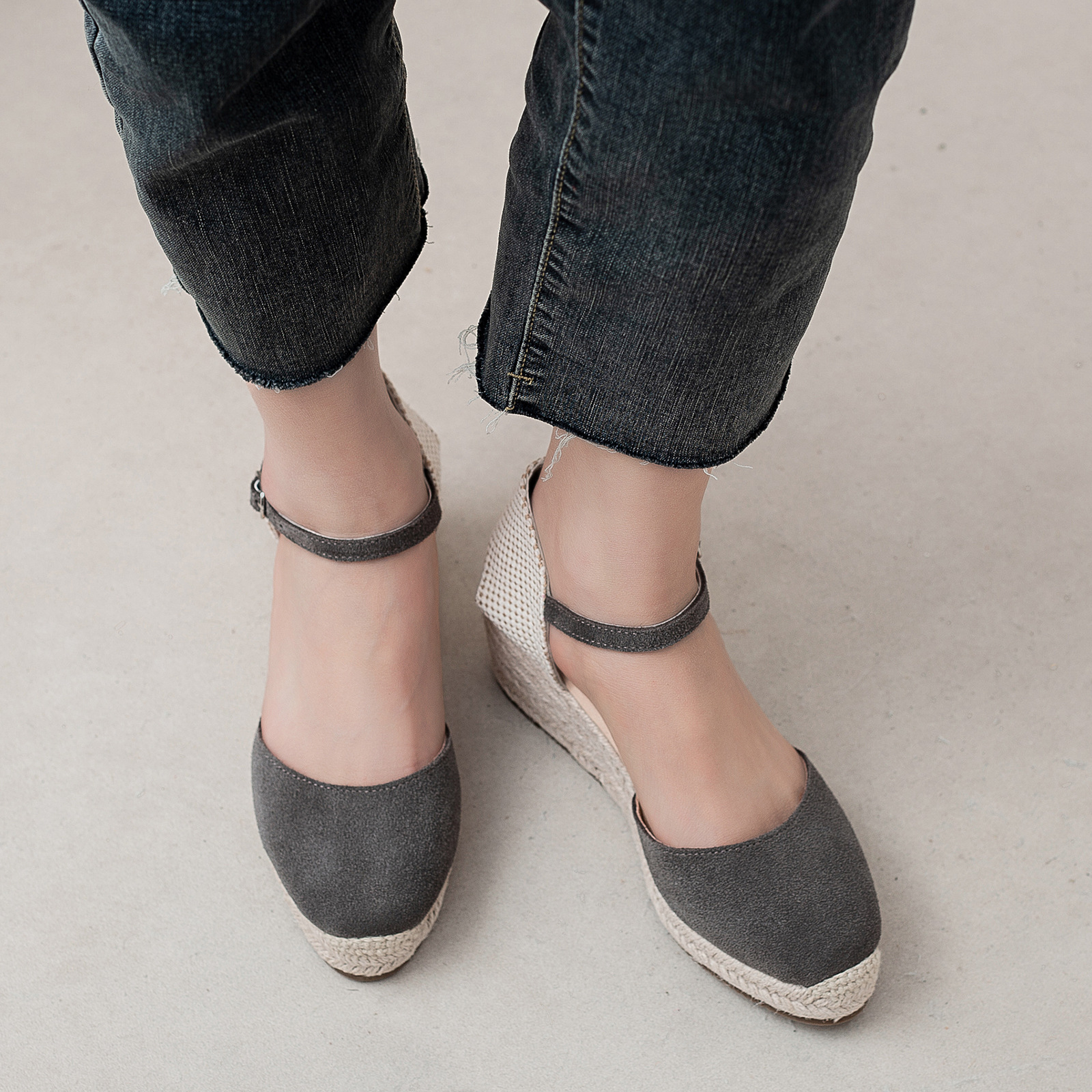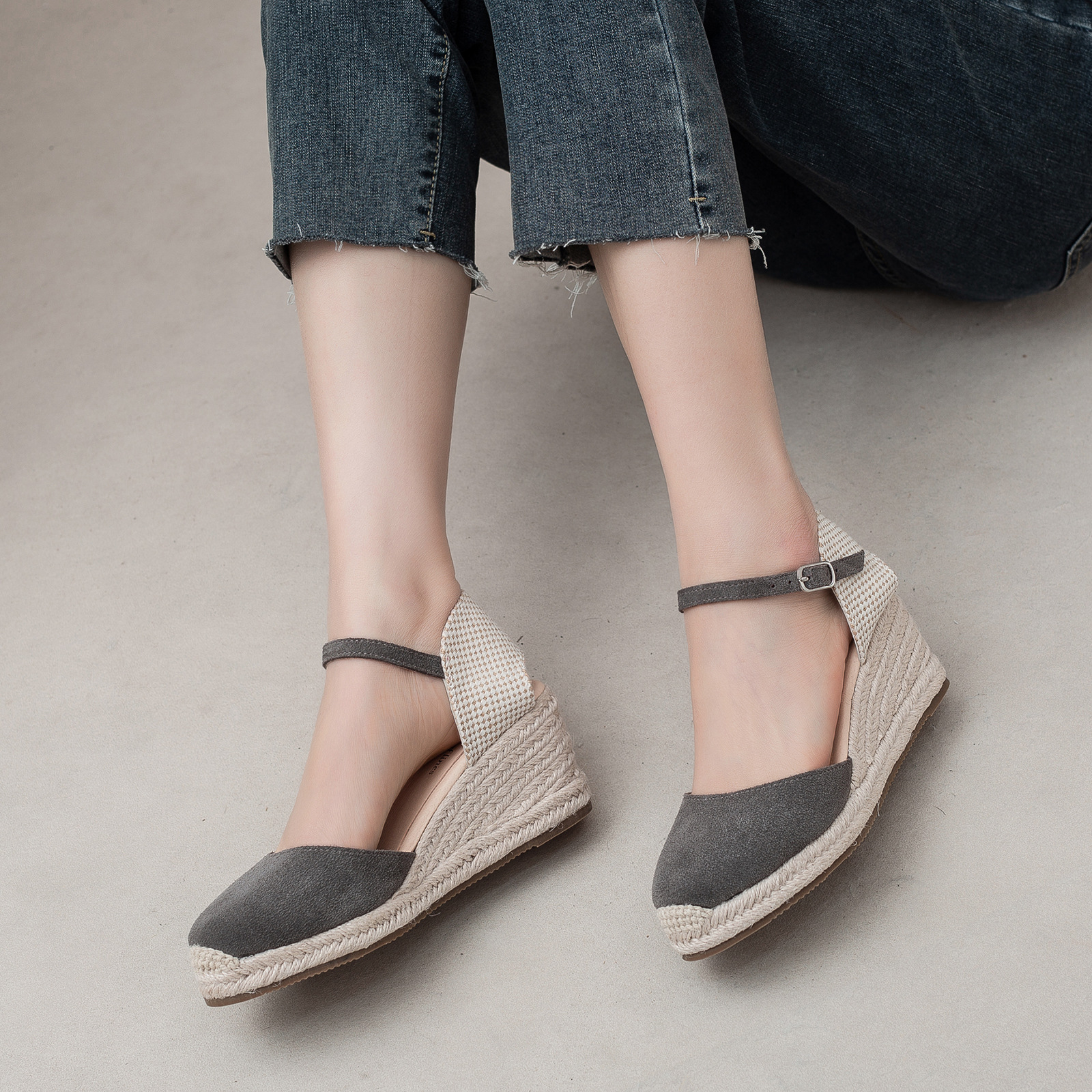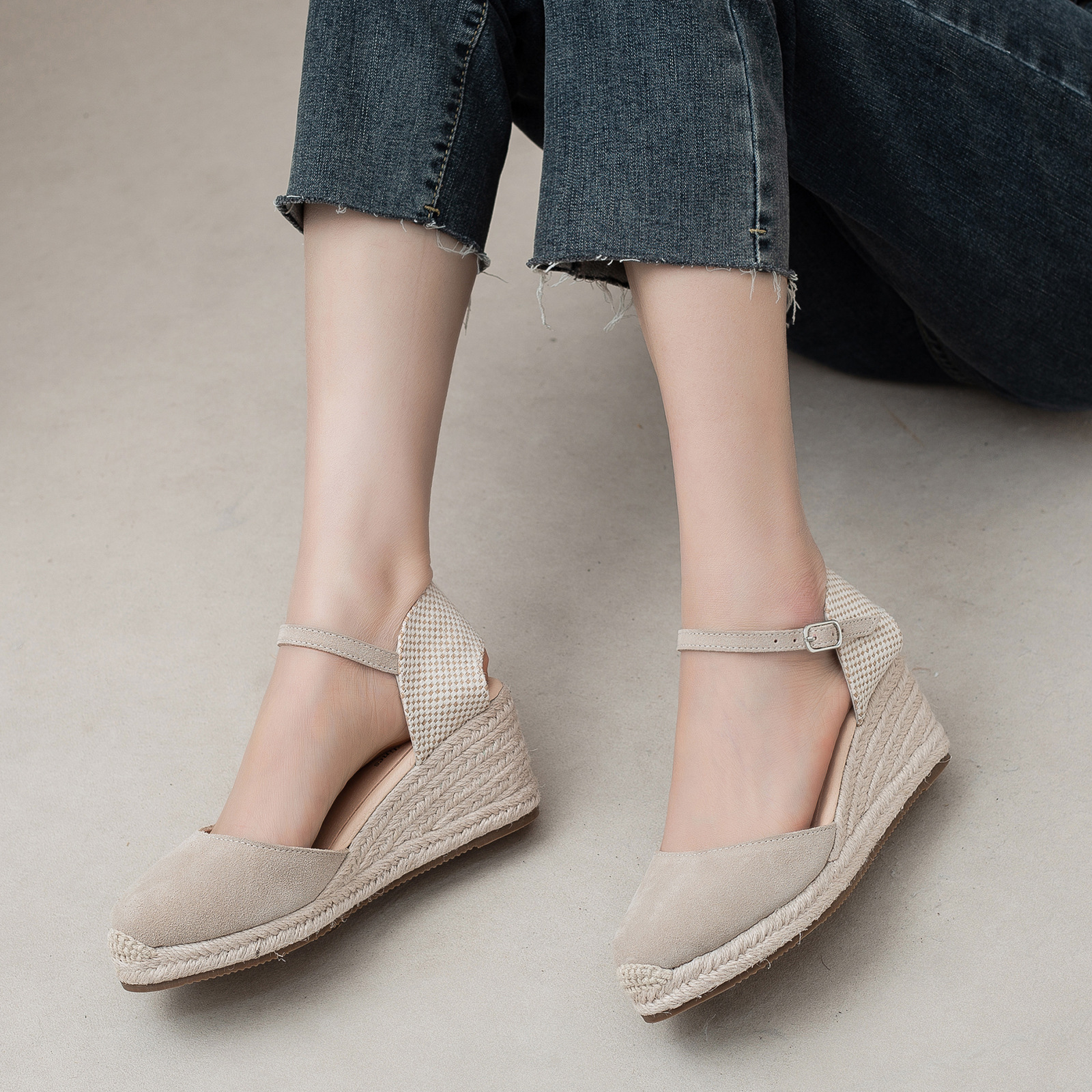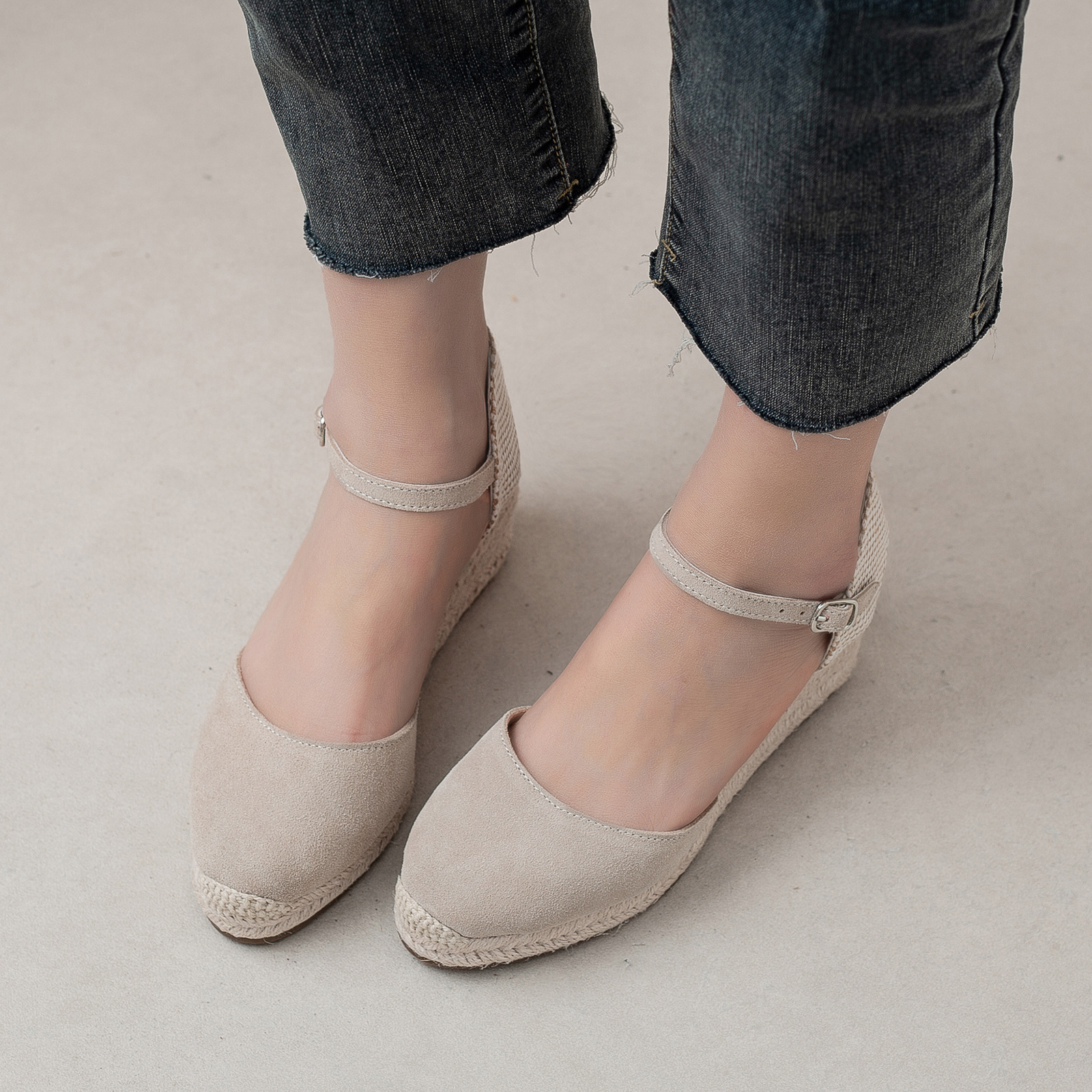 밀짚 웨지 샌들 봄과 여름 유럽과 미국 패션 새로운 소 벨벳 통기성 땀 흡수성 캐주얼 얕은 입 패션 여성 우아한