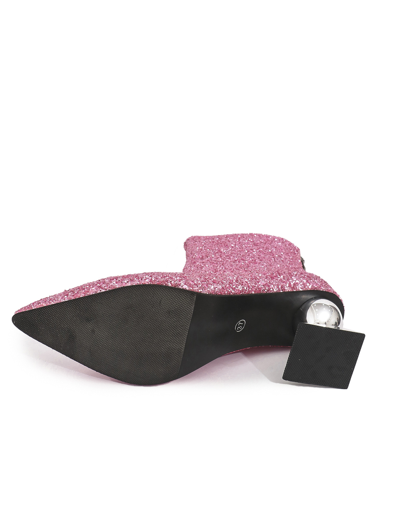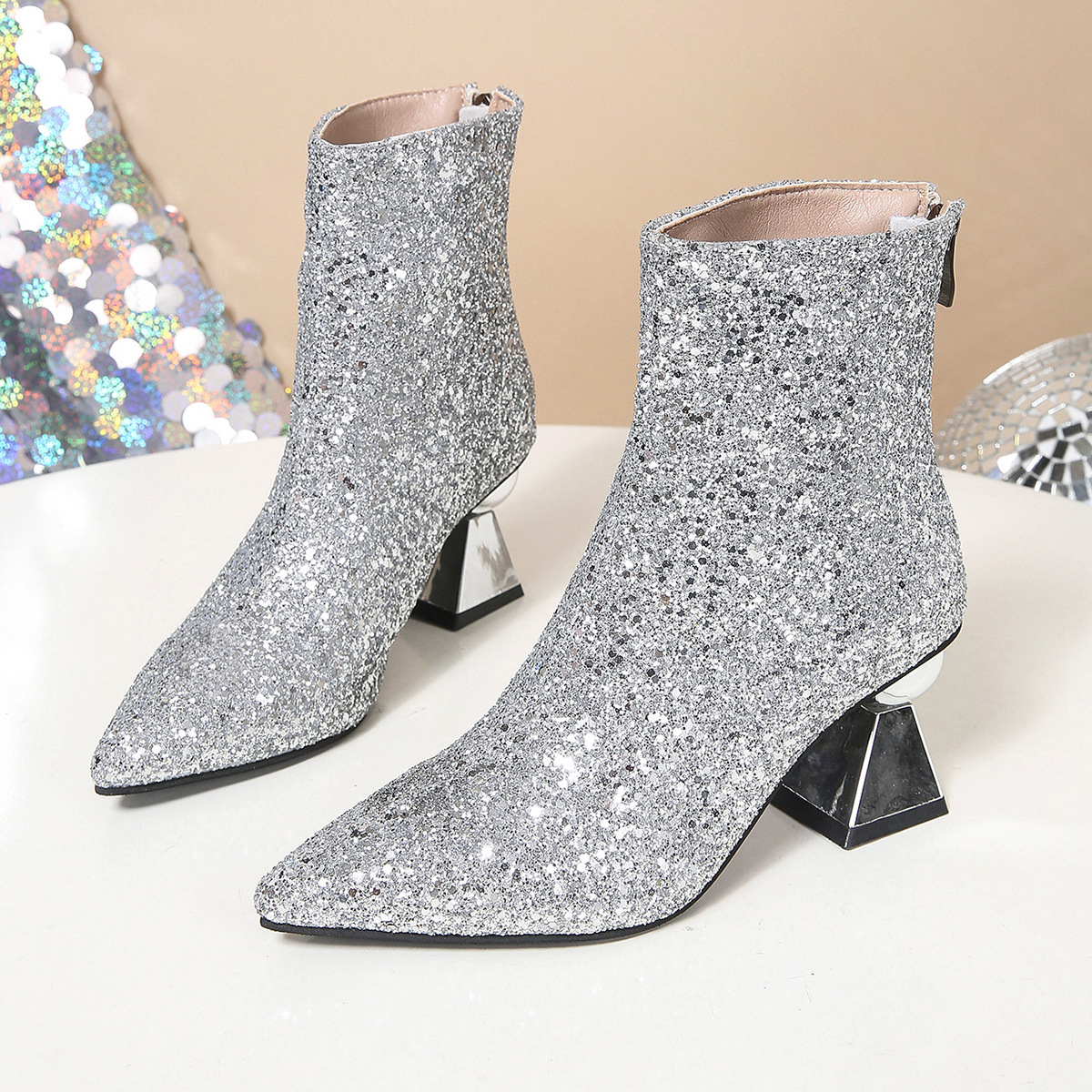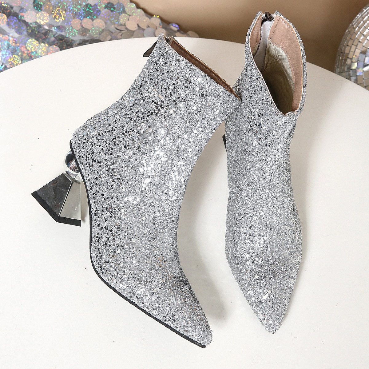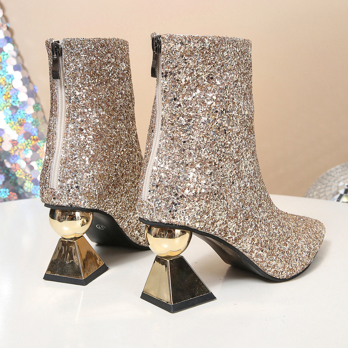 2025 가을 신상 대외 무역용 대형 사이즈 하이힐 부츠, 반짝이 장식이 있는 특별한 모양의 굽, 부드러운 밑창, 뒷면 지퍼가 있는 여성용 부츠, 마틴 부츠