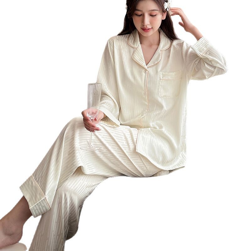 여성용 잠옷, 아이스 실크 자카드, 큰 사이즈, 루즈핏, 긴팔, 긴 바지, 외출복으로도 착용 가능, 홈웨어, 엄마복, 편안하고 고급스러운 느낌