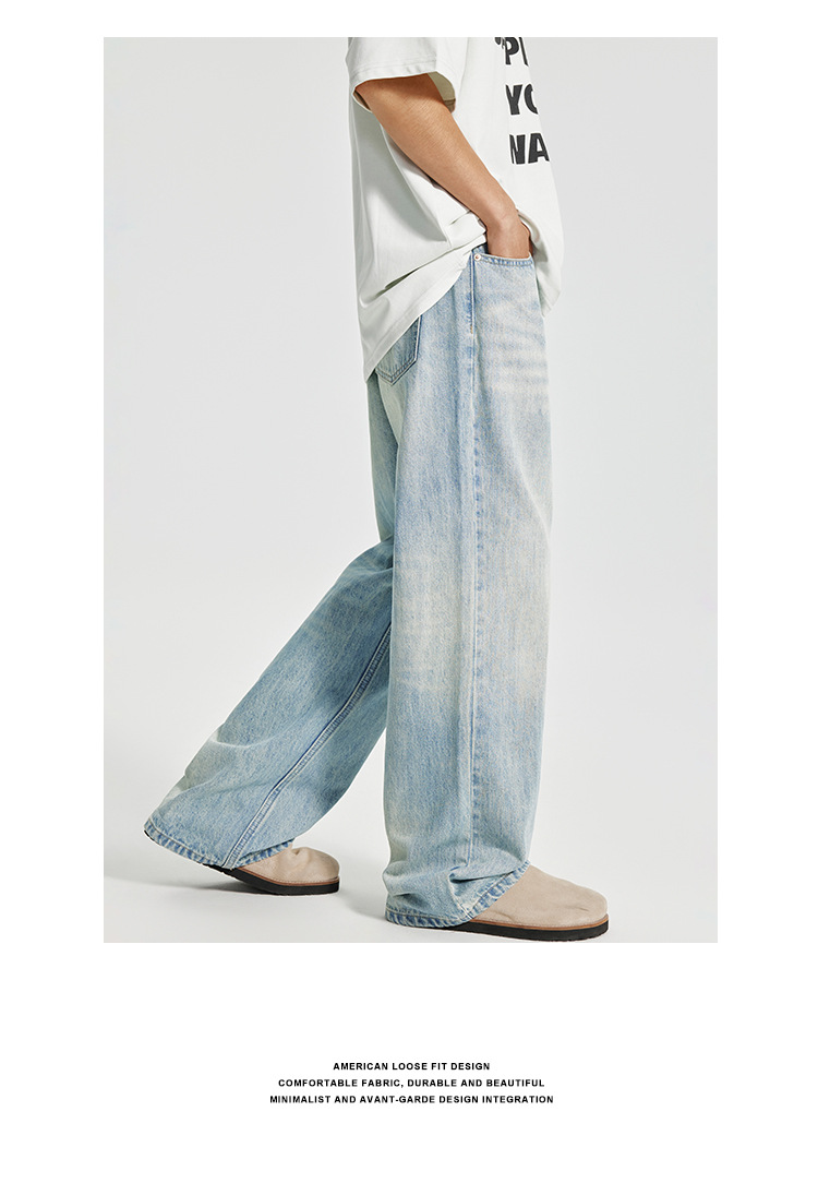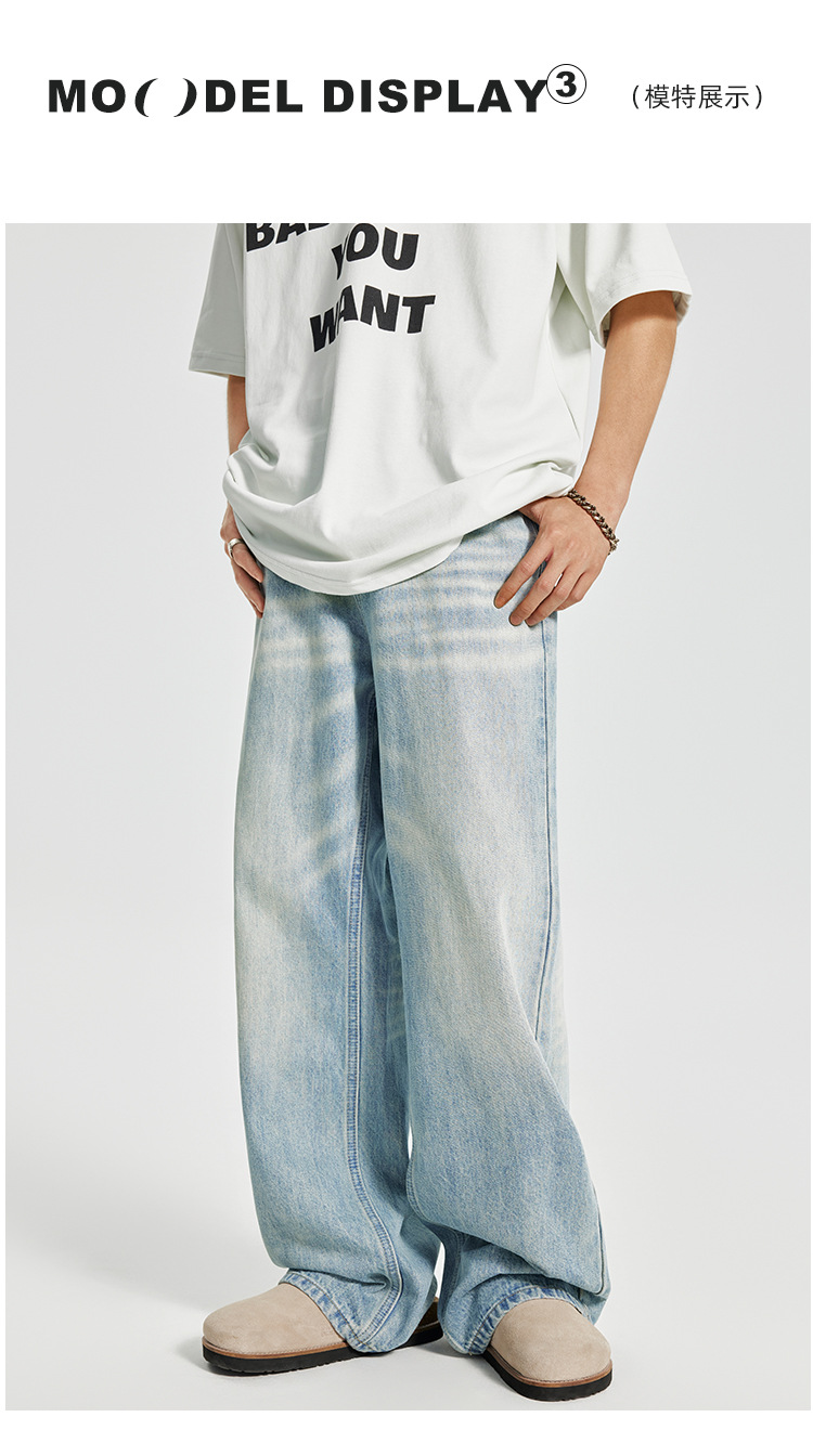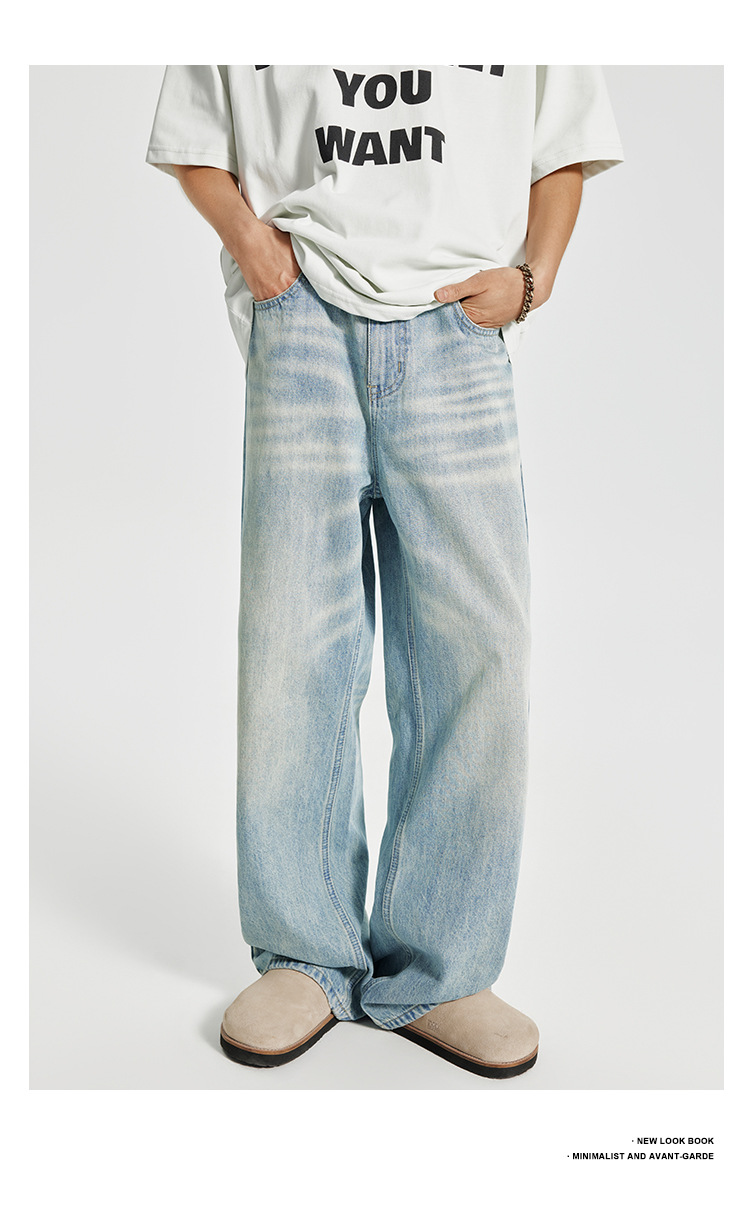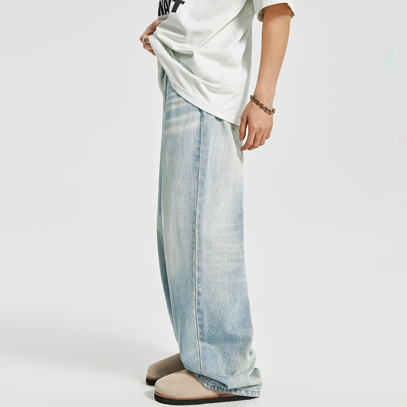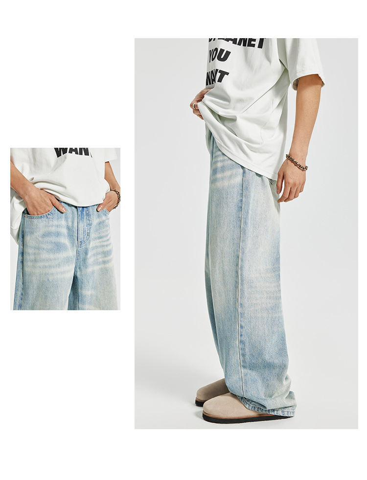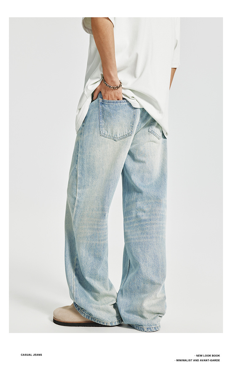 OTTB 레트로 그라데이션 청바지 남성용 아메리칸 스타일 청소년 배색 워싱 블루 루즈핏 스트레이트 데님 남성용 롱 팬츠