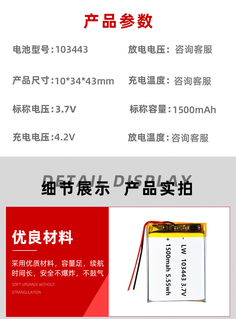 공장 직접 판매 103443 리튬 배터리 3.7V1500MAH 배터리 공기 청정기 폴리머 리튬 배터리