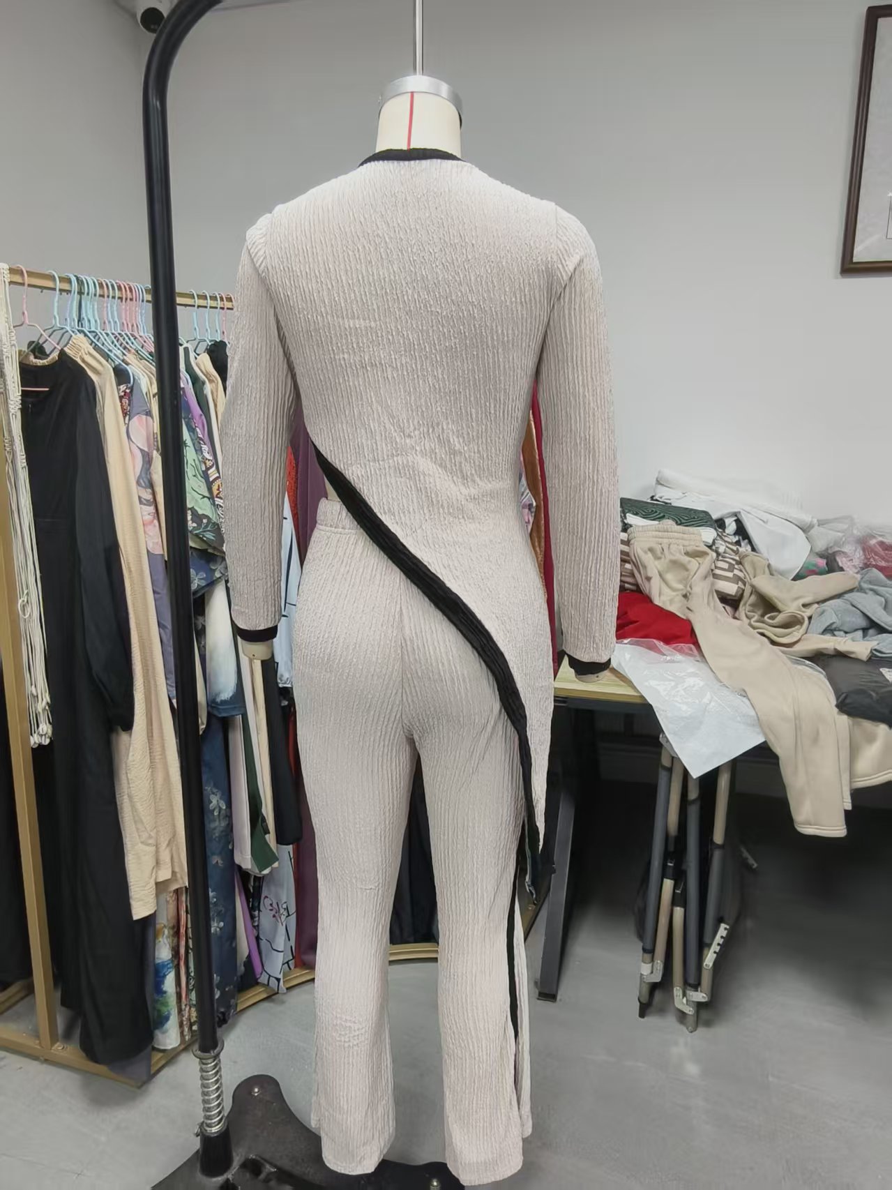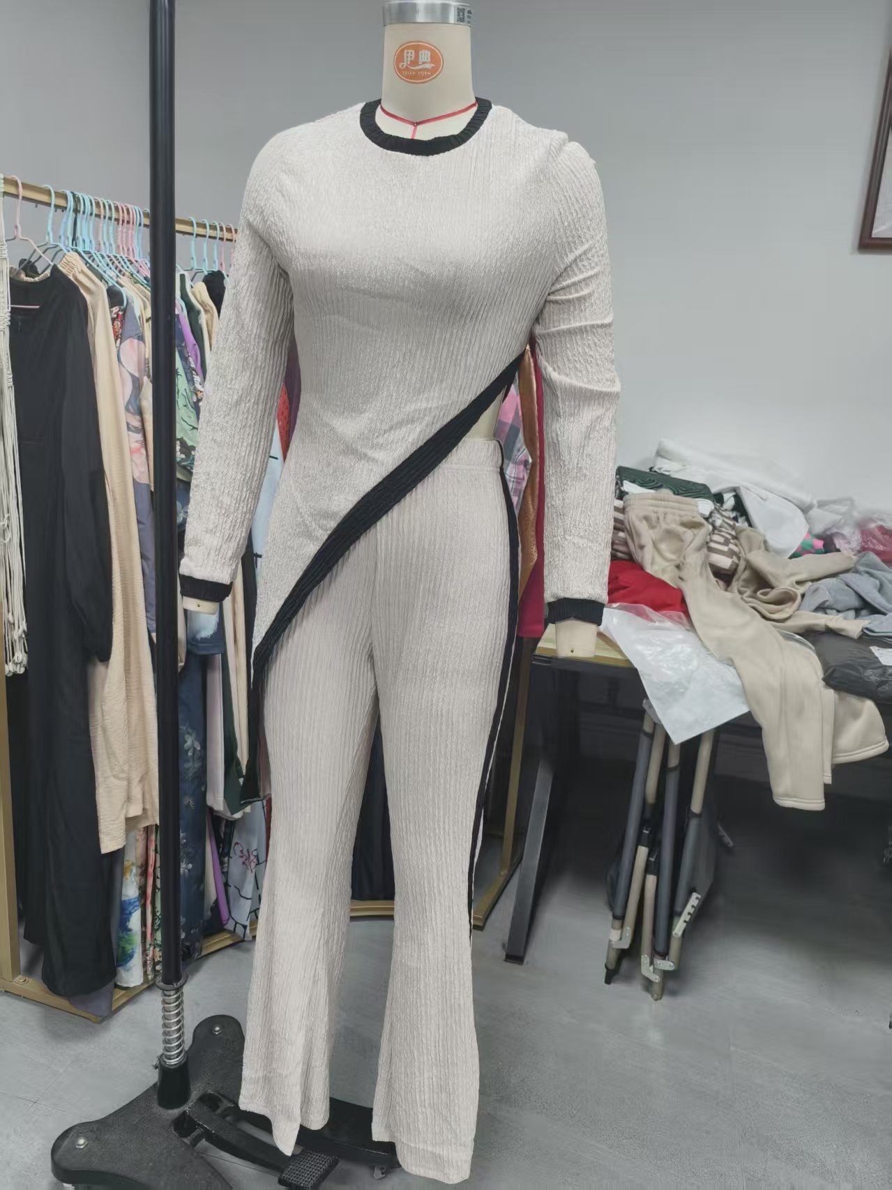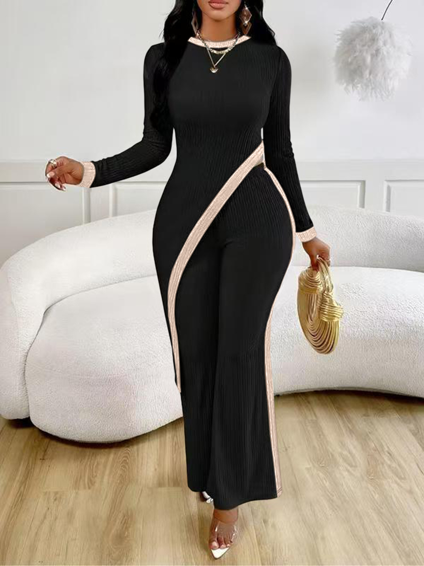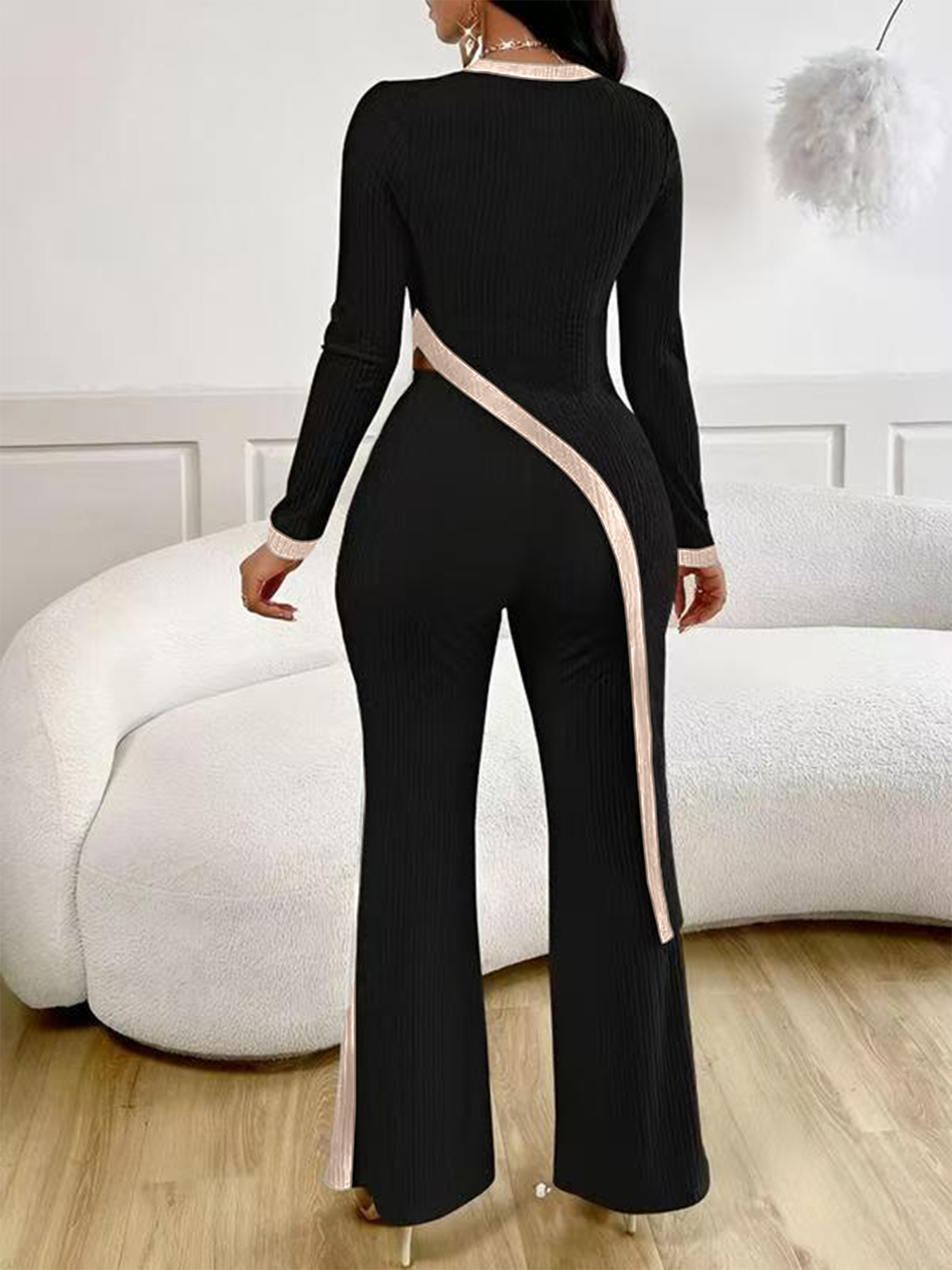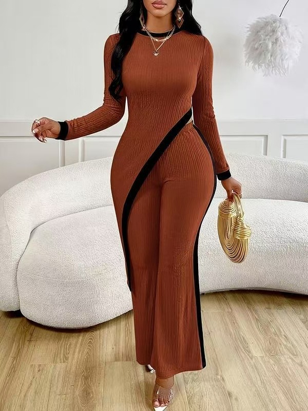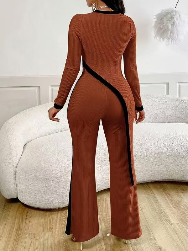 유럽 및 미국 해외직구 2025 봄/여름 신상 여성 패션 배색 긴팔 사이드 슬릿 티셔츠+스플라이싱 팬츠 세트