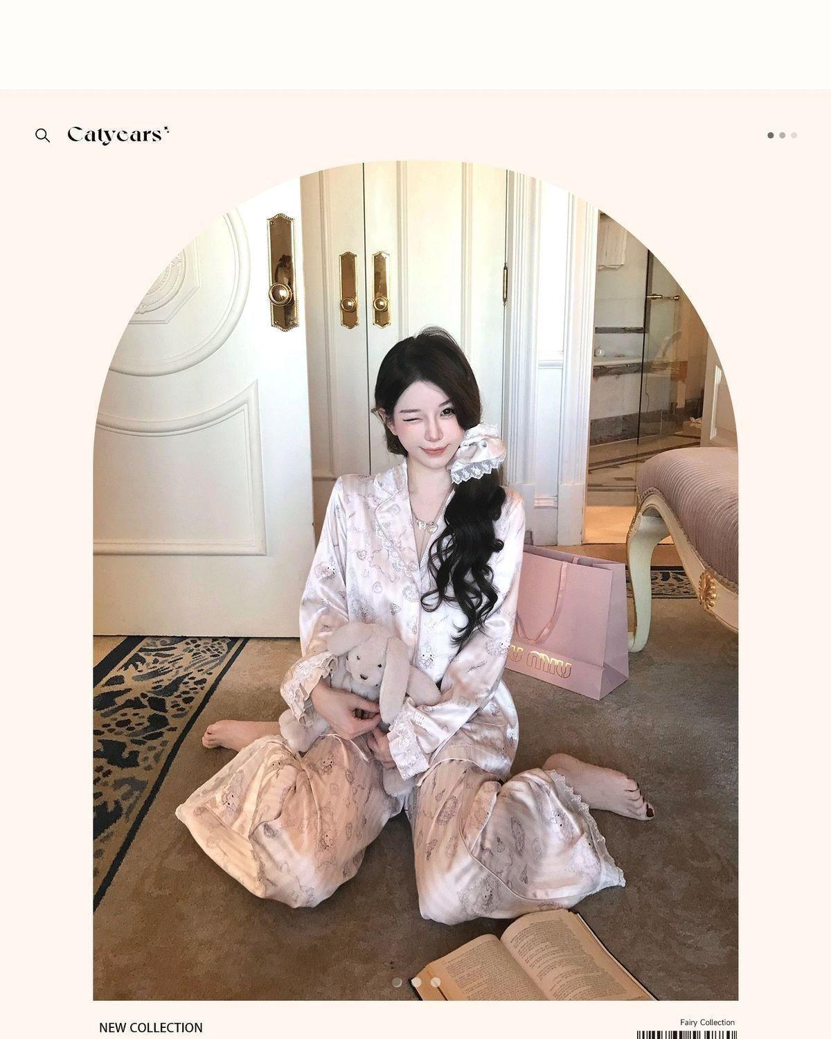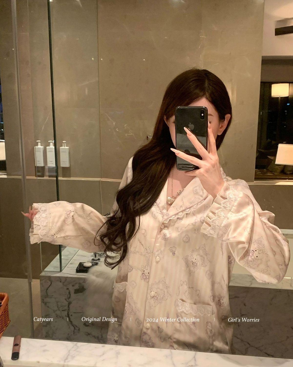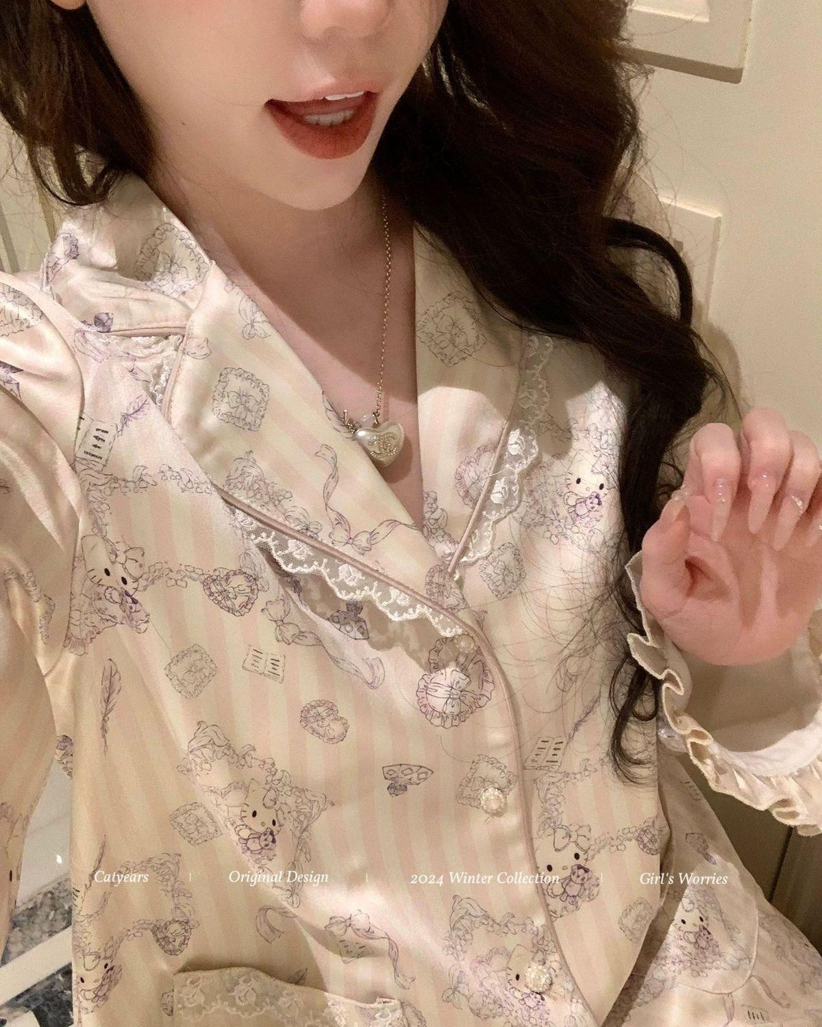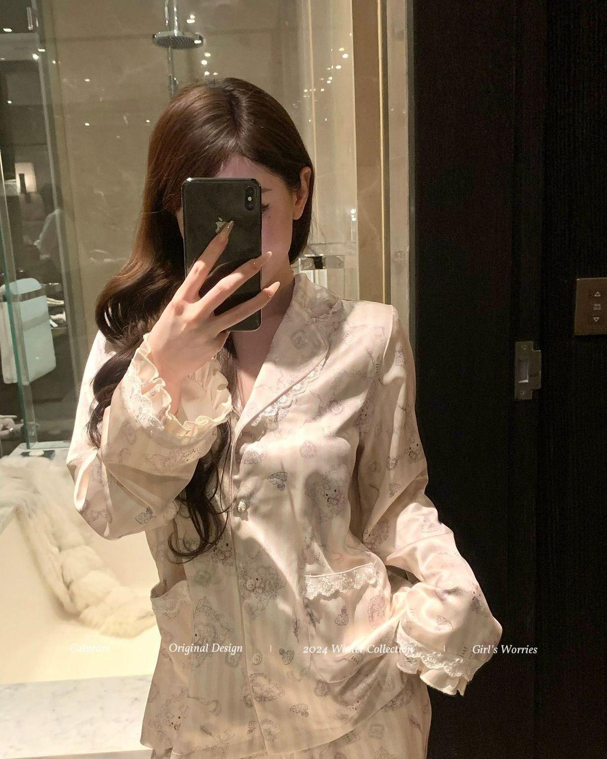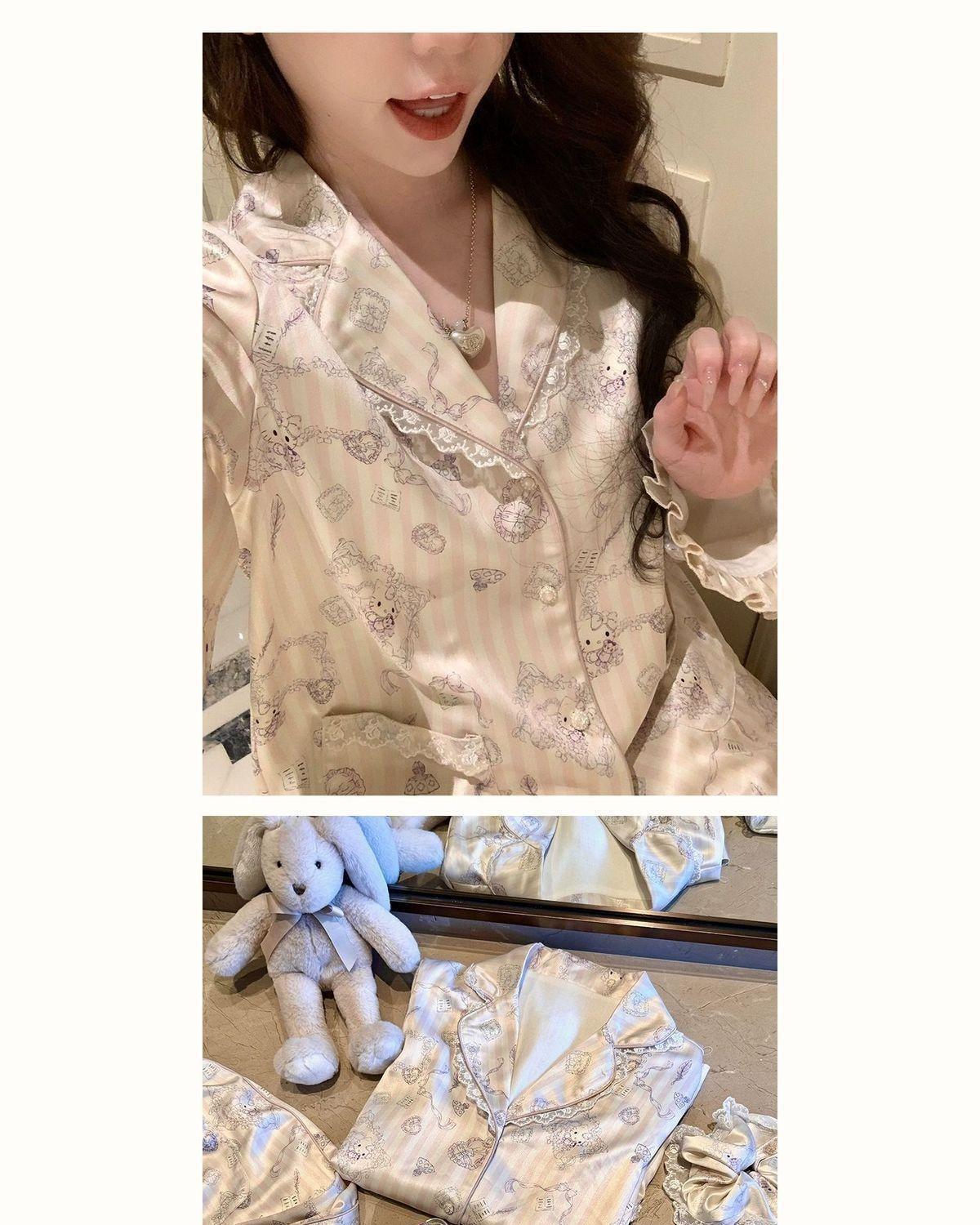 헬로 키티 아이스 실크 파자마 여성 봄과 가을 긴팔 하이 엔드 귀여운 4 면 샷건 실크 홈 의류 여름