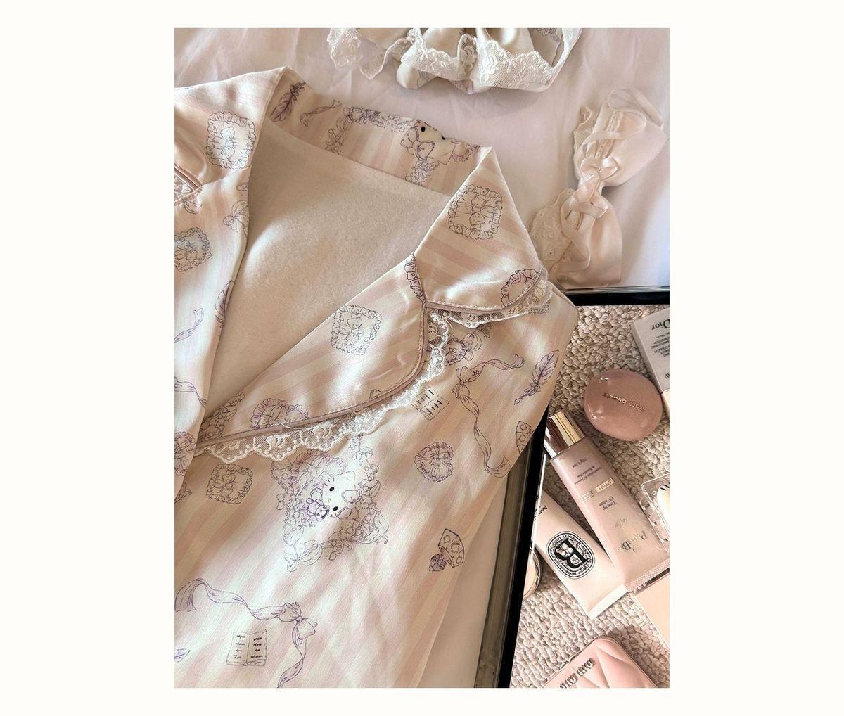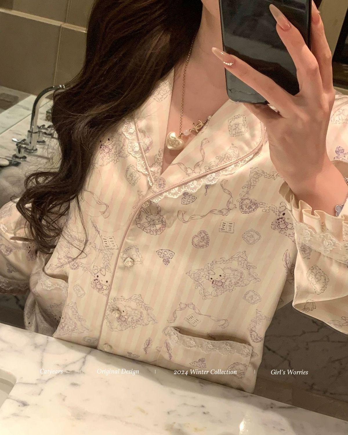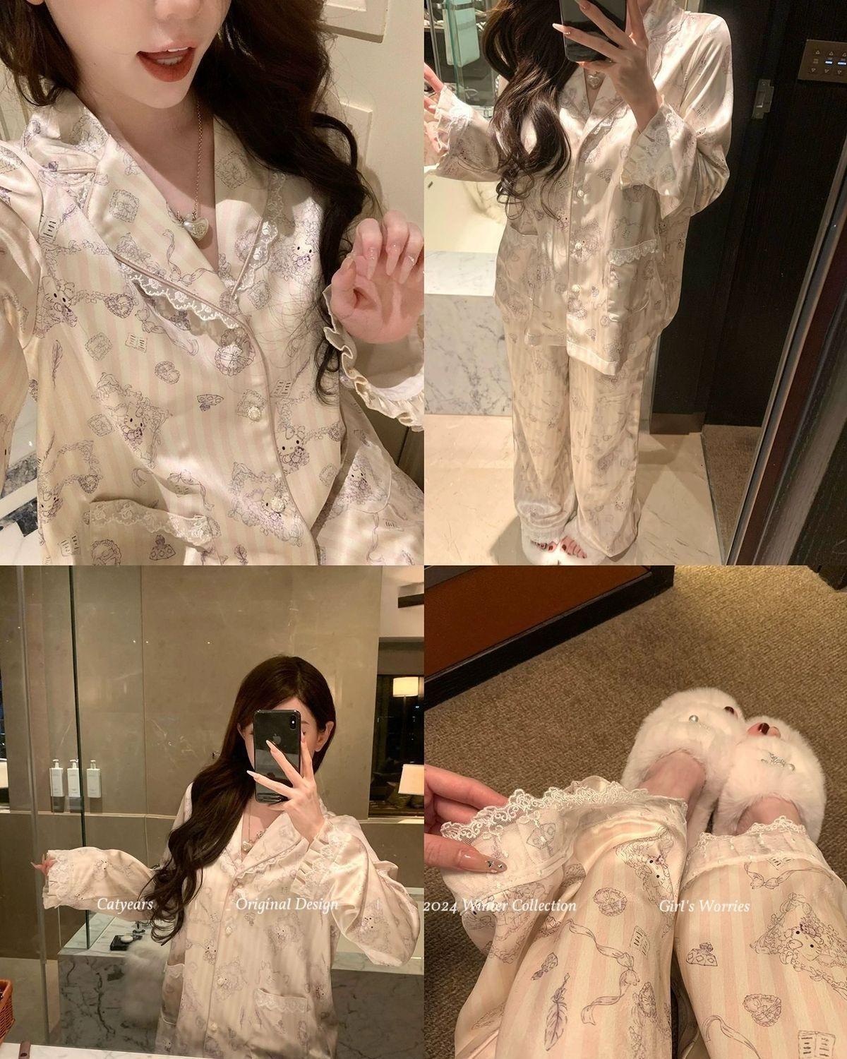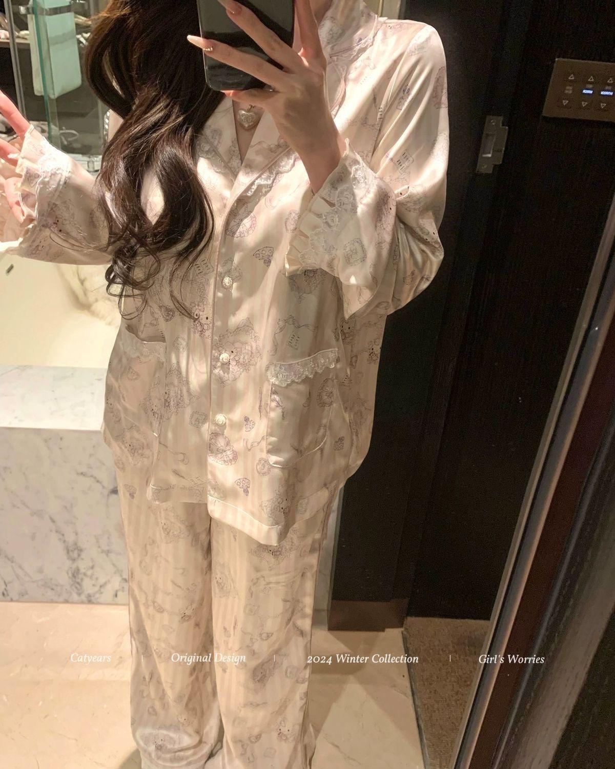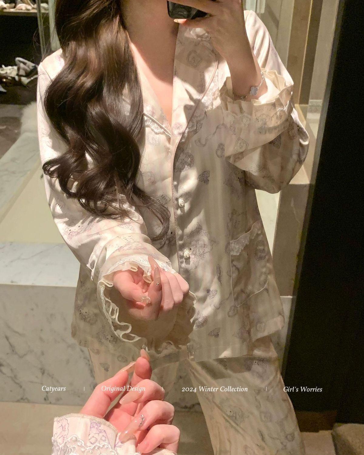 헬로 키티 아이스 실크 파자마 여성 봄과 가을 긴팔 하이 엔드 귀여운 4 면 샷건 실크 홈 의류 여름