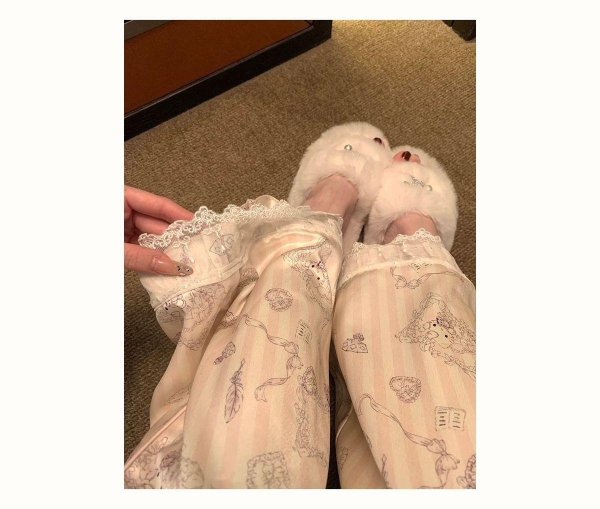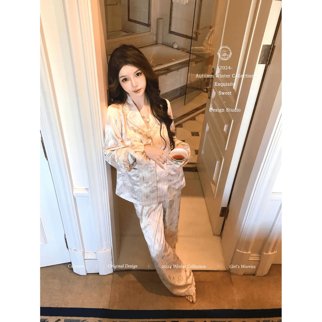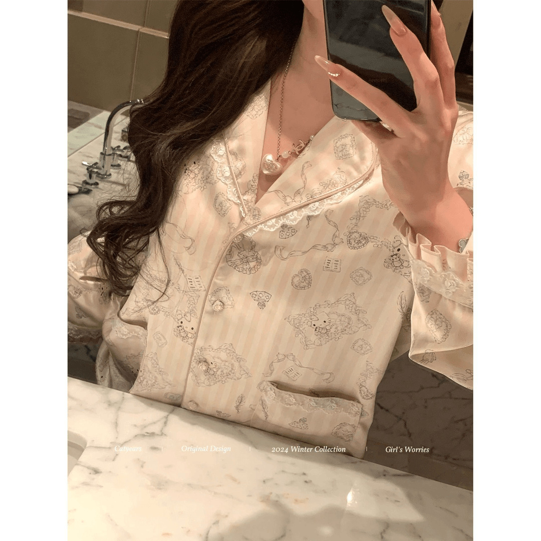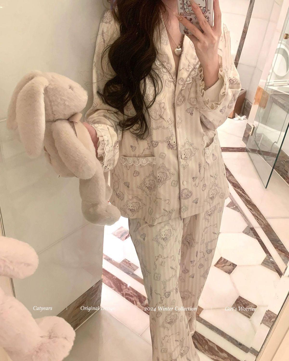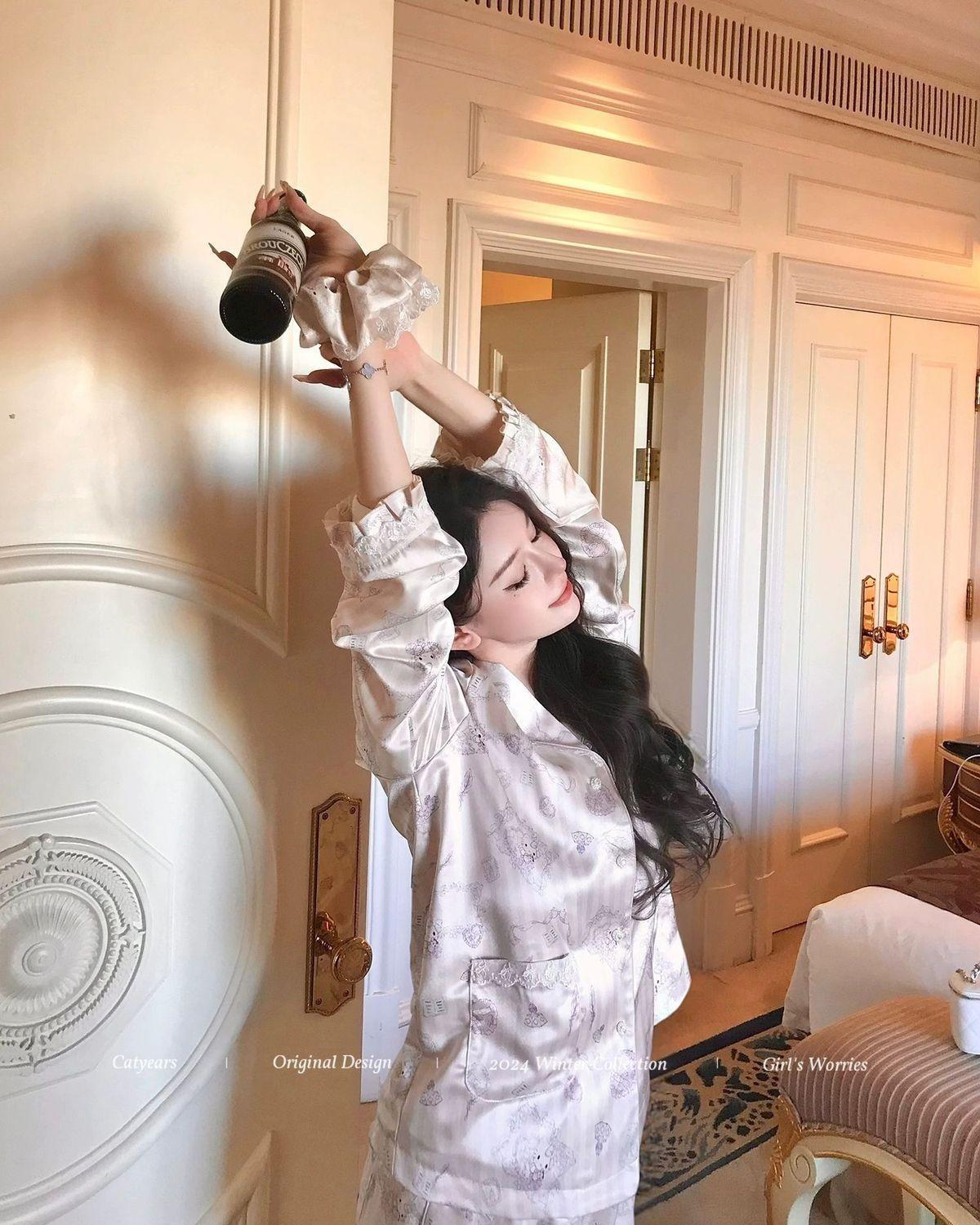 헬로 키티 아이스 실크 파자마 여성 봄과 가을 긴팔 하이 엔드 귀여운 4 면 샷건 실크 홈 의류 여름