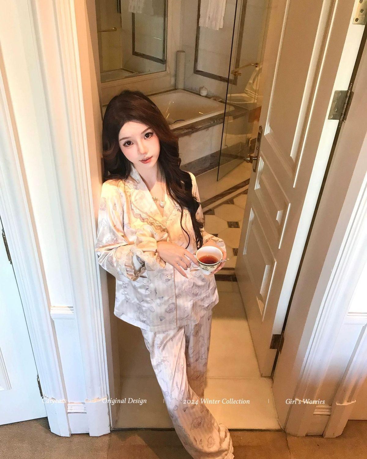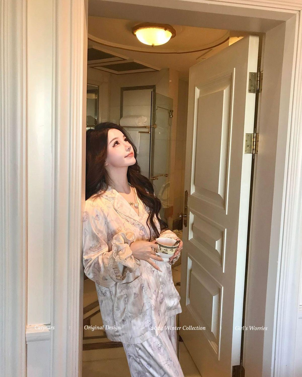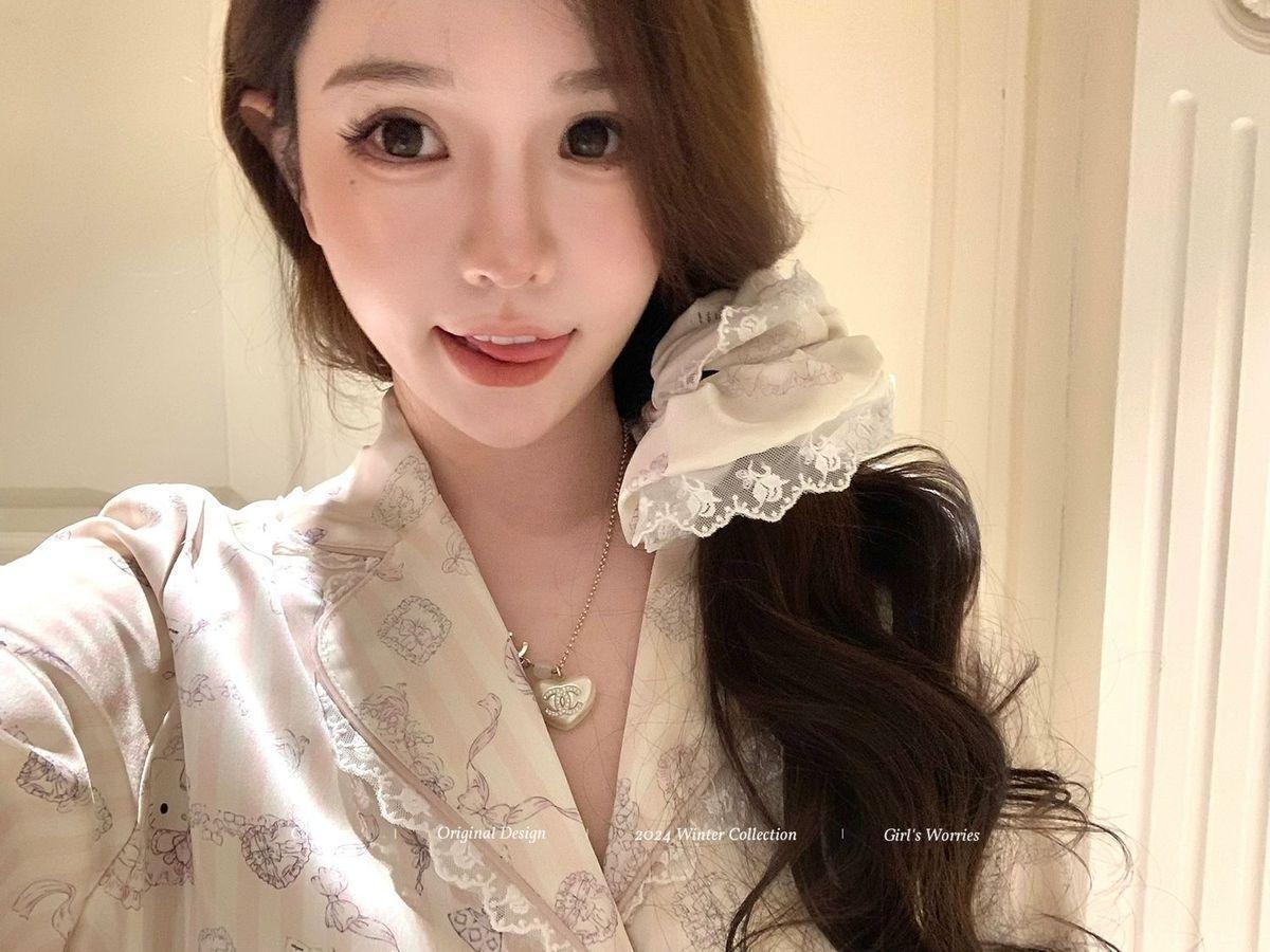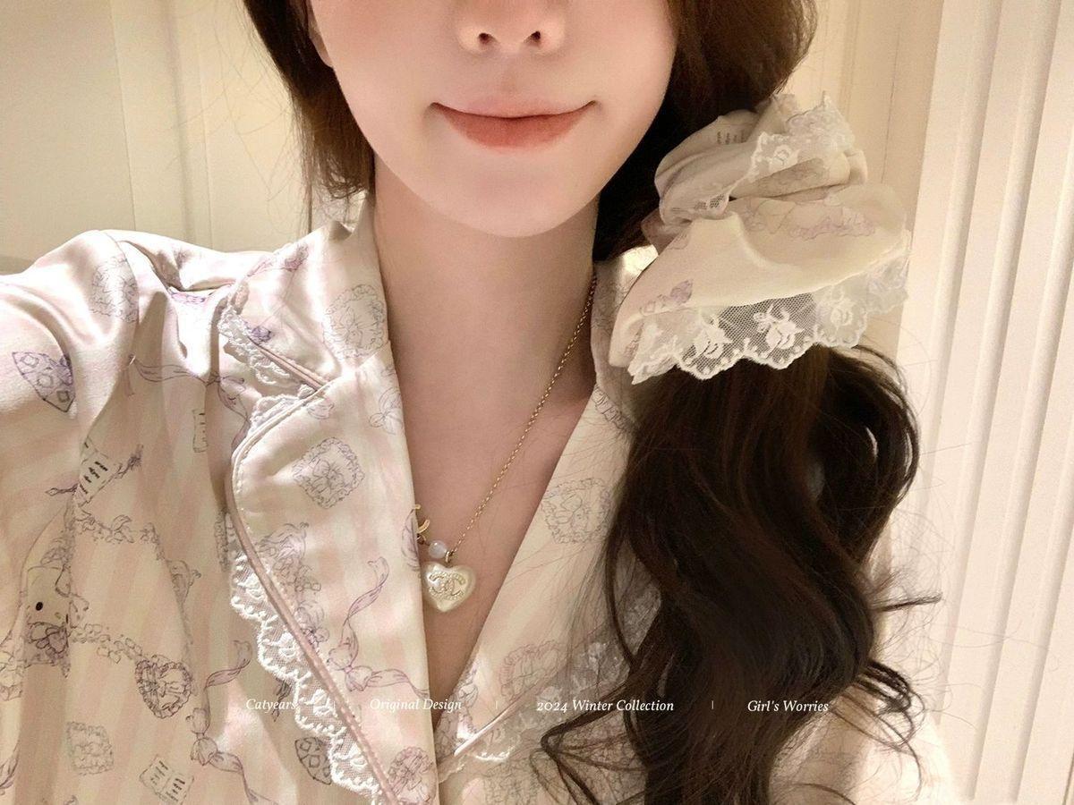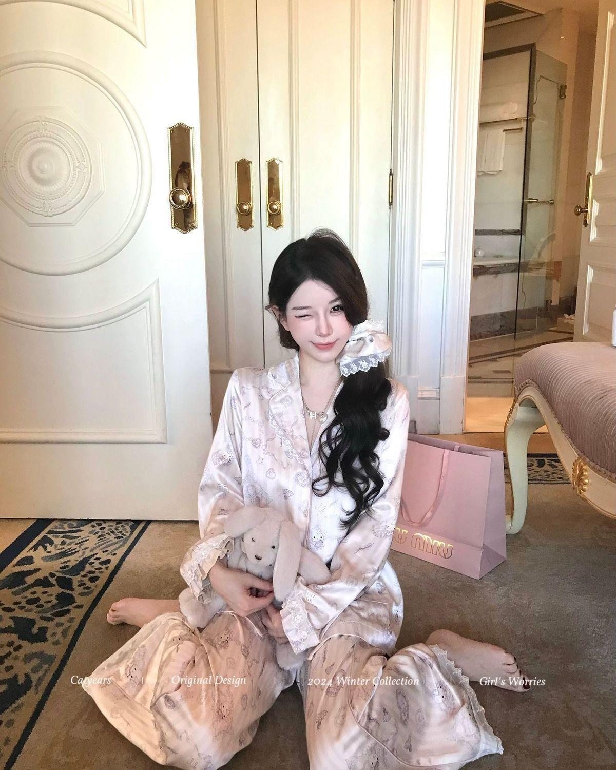 헬로 키티 아이스 실크 파자마 여성 봄과 가을 긴팔 하이 엔드 귀여운 4 면 샷건 실크 홈 의류 여름