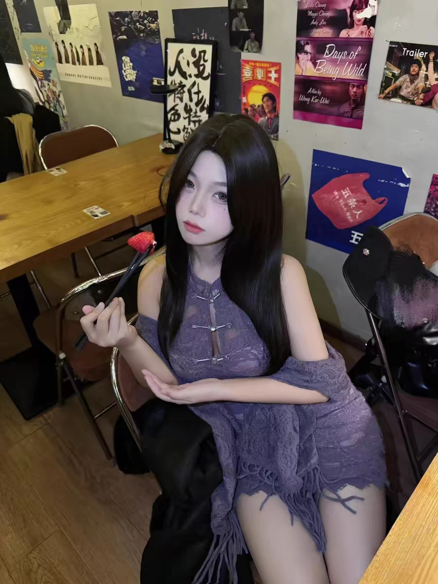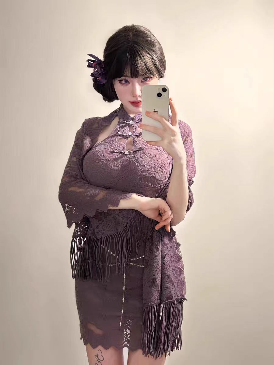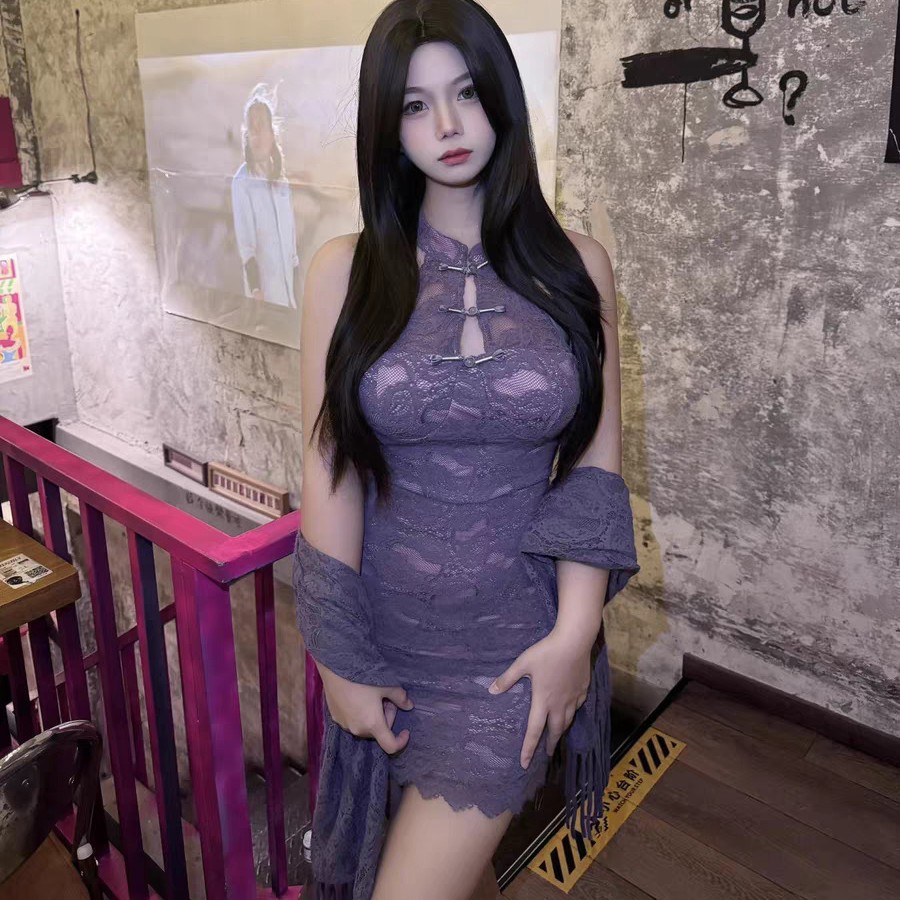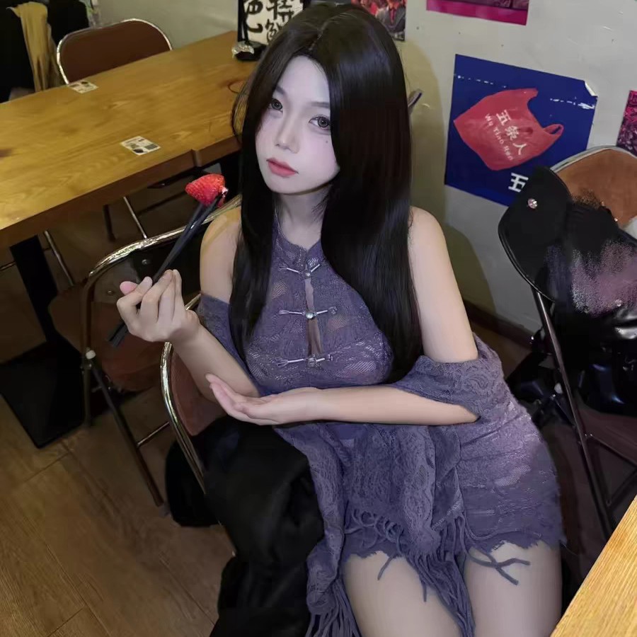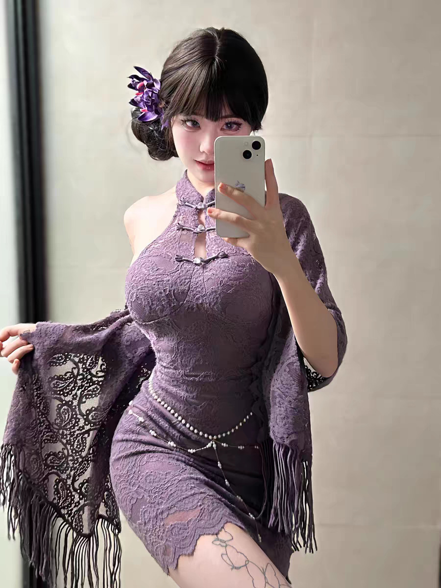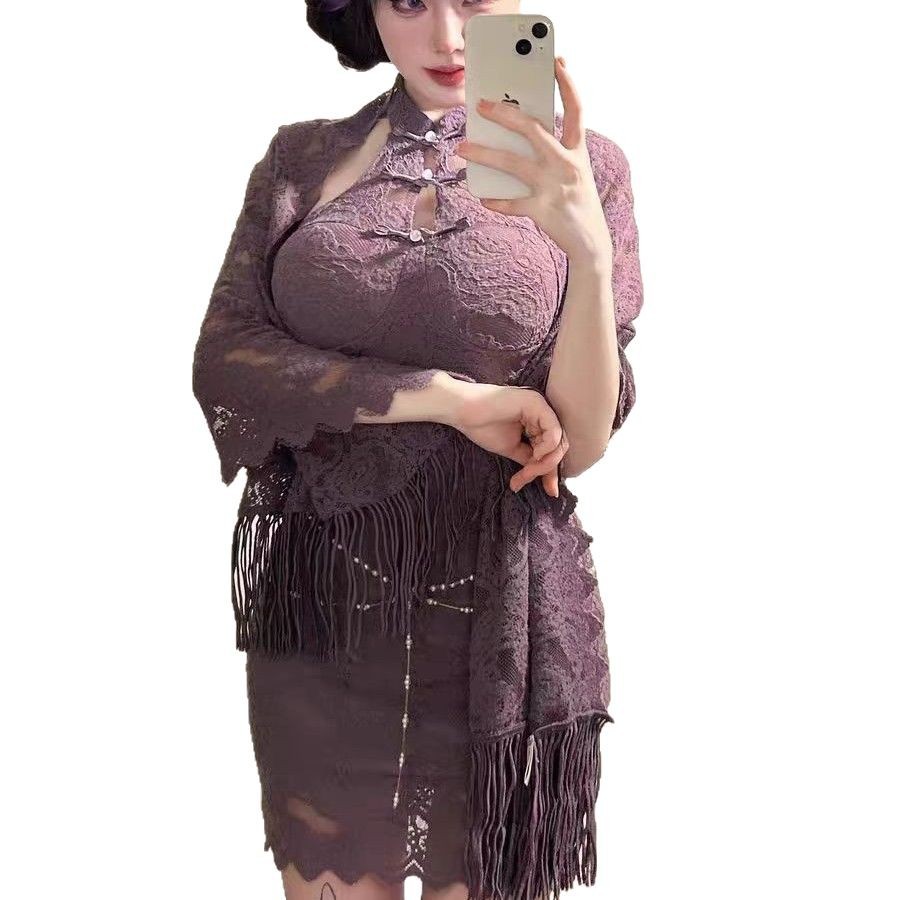 청삼 섹시한 속옷 섹시한 나이트 드레스 재생 보라색 자매 새로운 중국 스타일 빛 럭셔리 레이스 어깨 원피스 역할