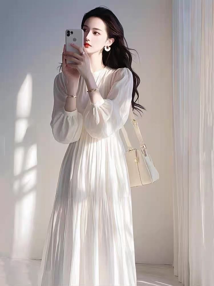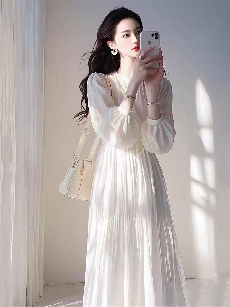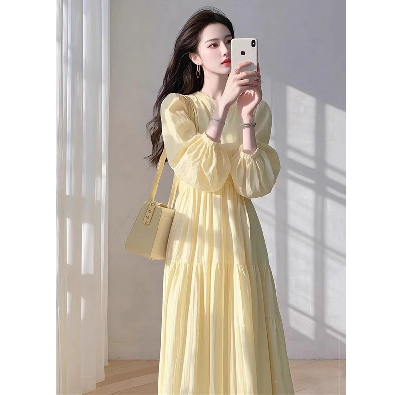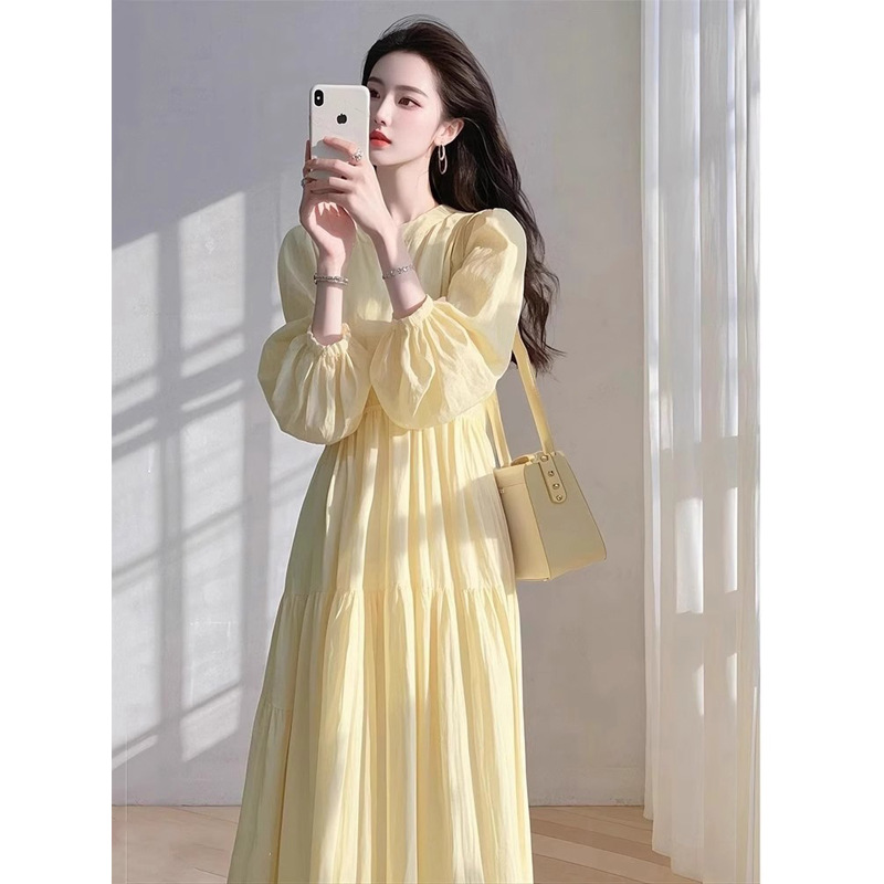 매우 아름다운 노란색 루즈핏 슬리밍 원피스 여성용 2026 봄 신상 프렌치 리조트 스타일 요정같은 분위기의 롱 원피스