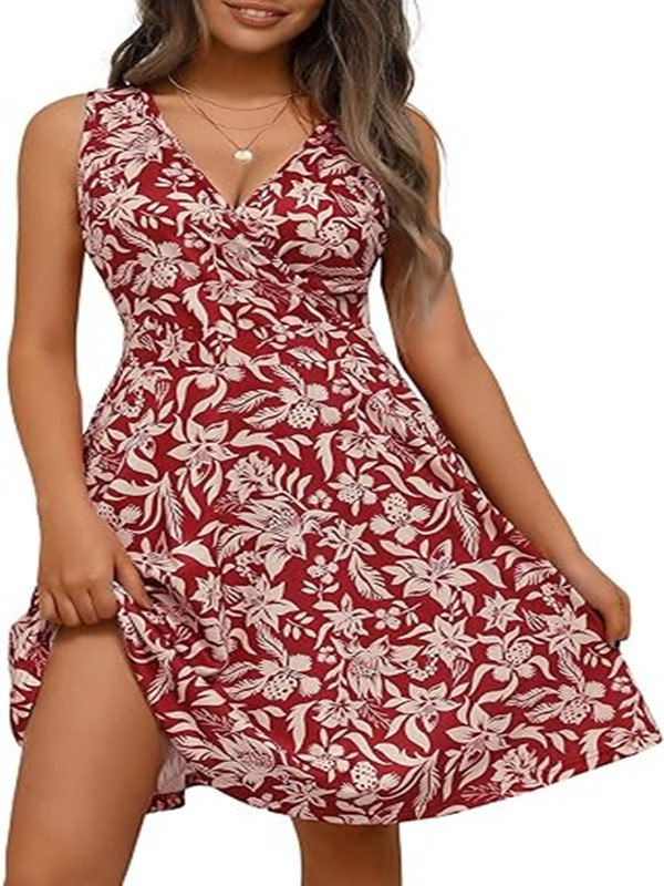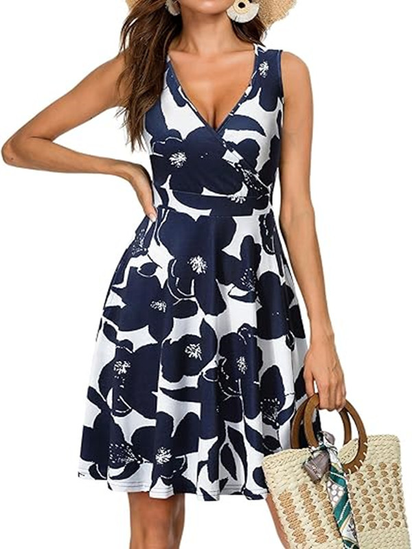 2025春夏新款欧美亚马逊优雅V领时尚印花口袋无袖连衣裙
