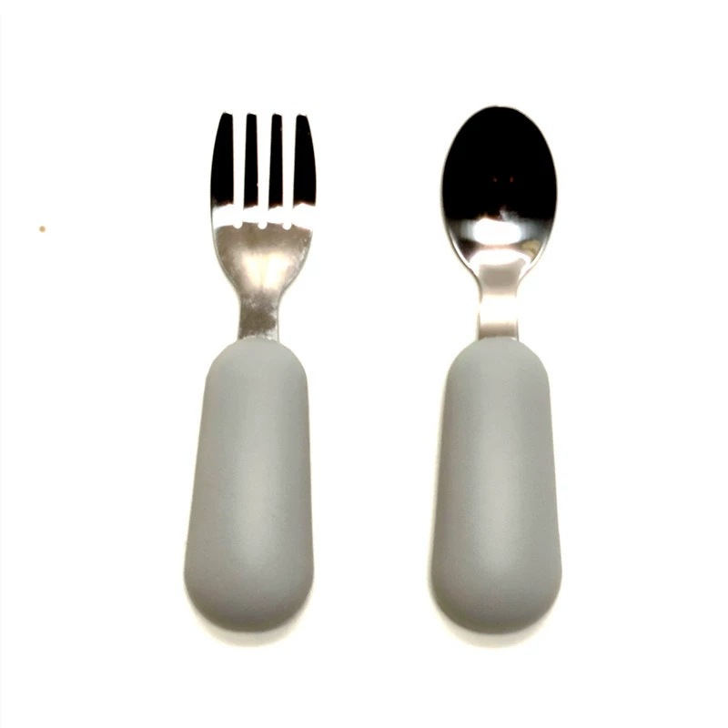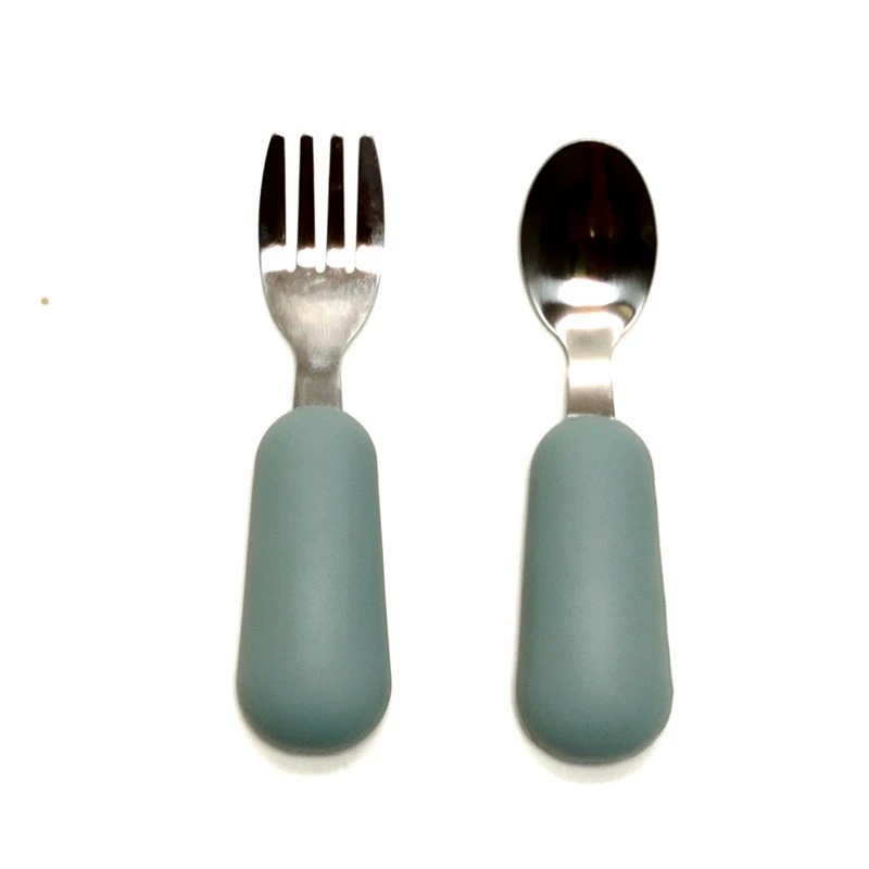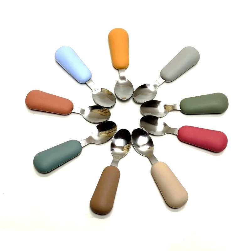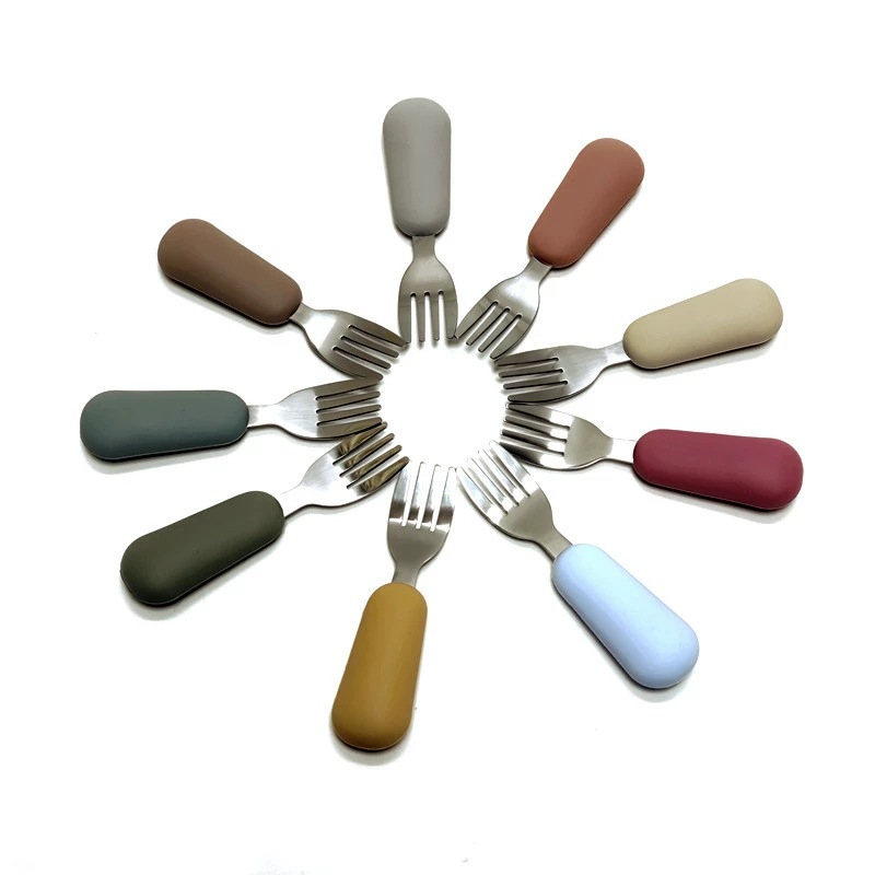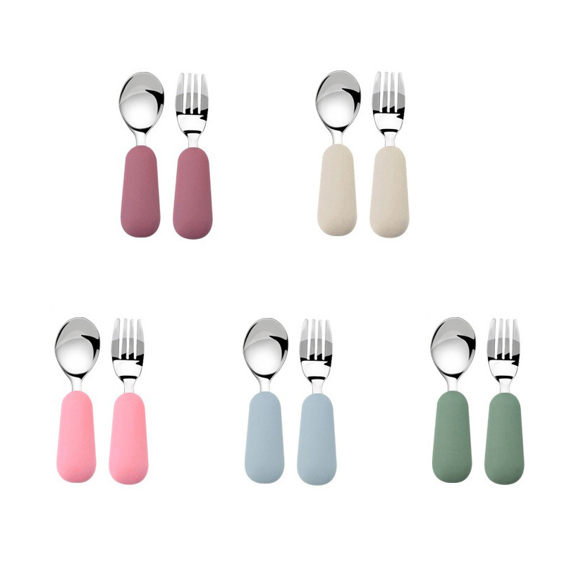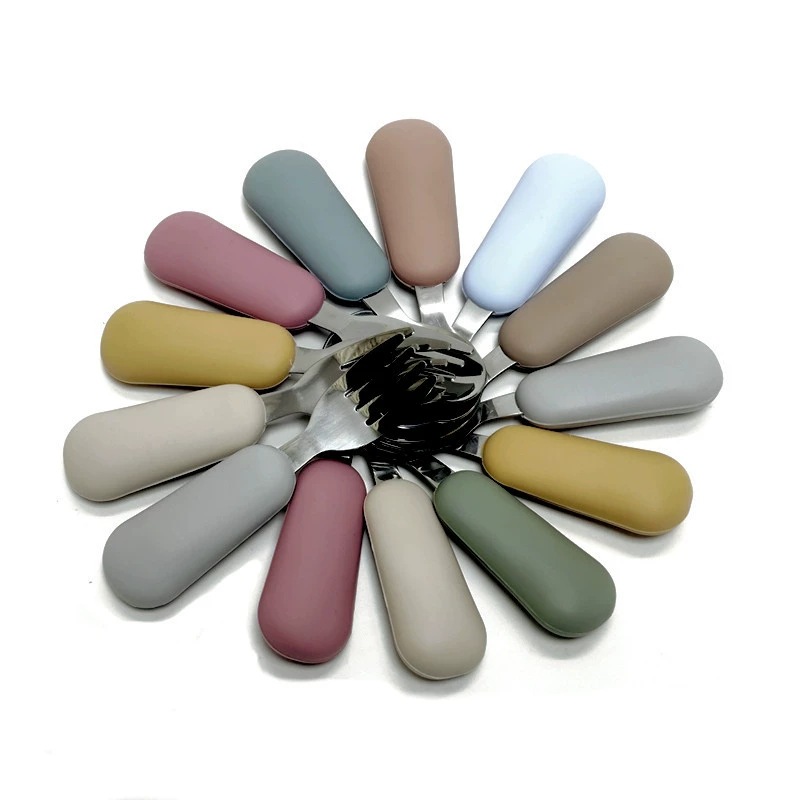 공장 직접 판매 아기 먹는 훈련 실리콘 스테인레스 스틸 포크와 스푼 아기 짧은 손잡이 어린이 식기 휴대용 스푼과 포크