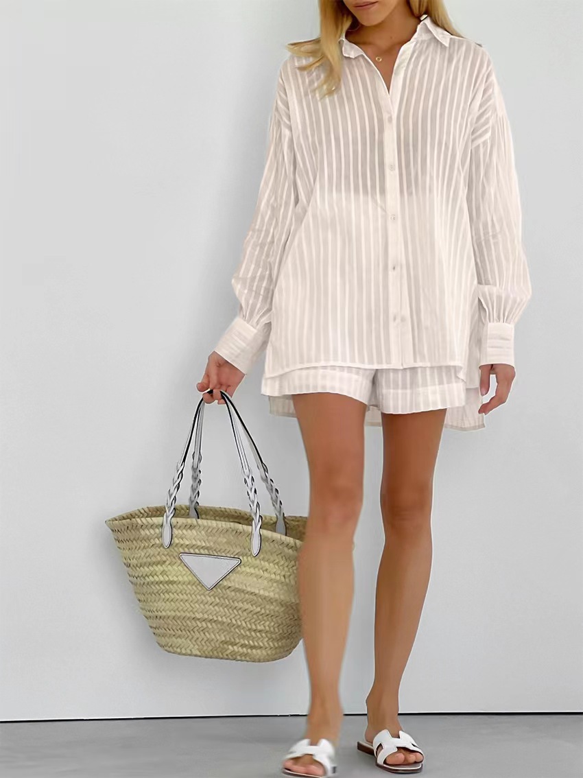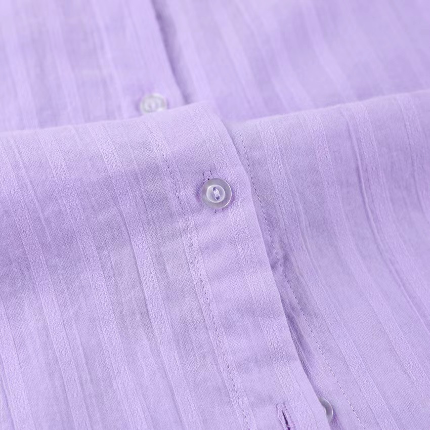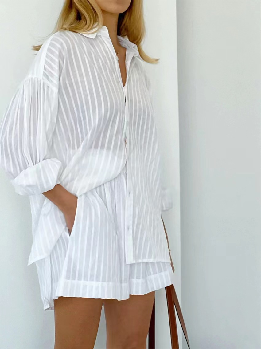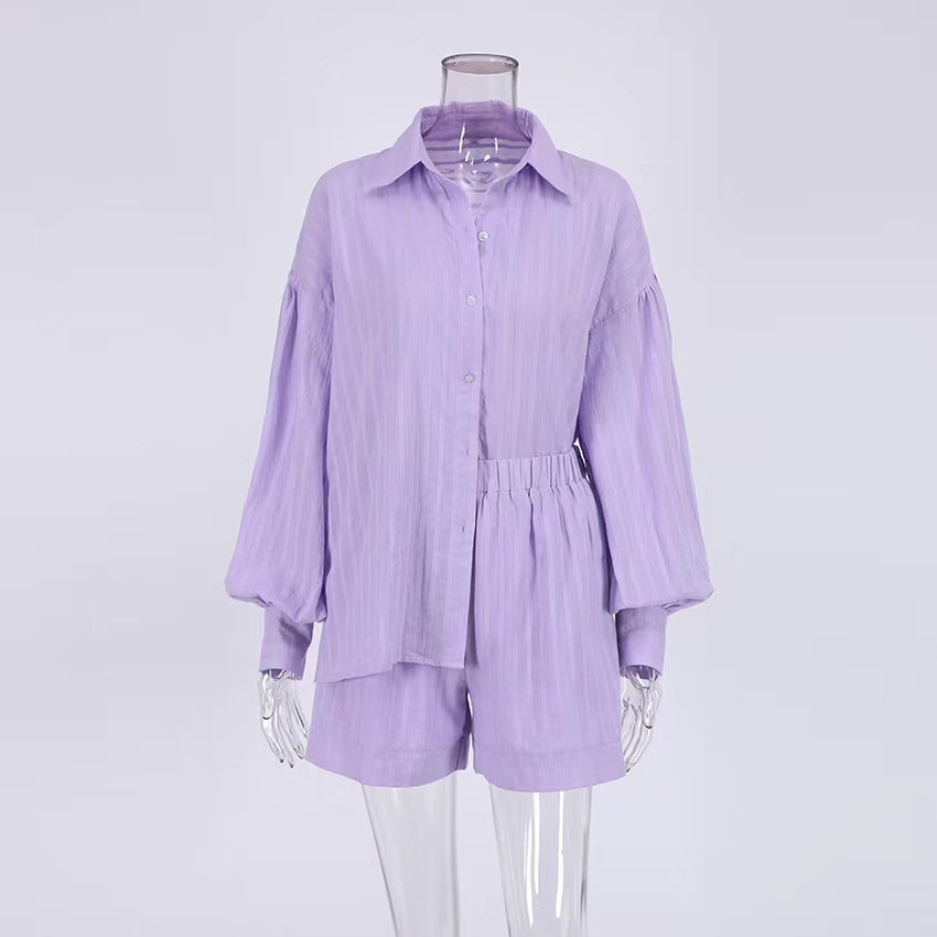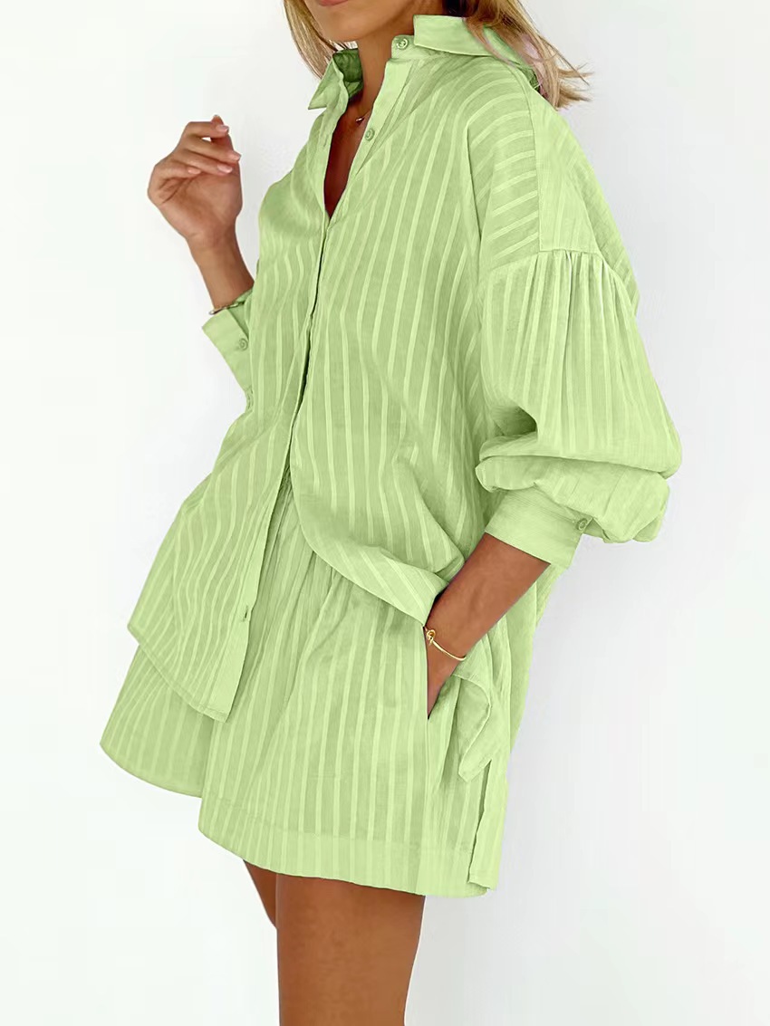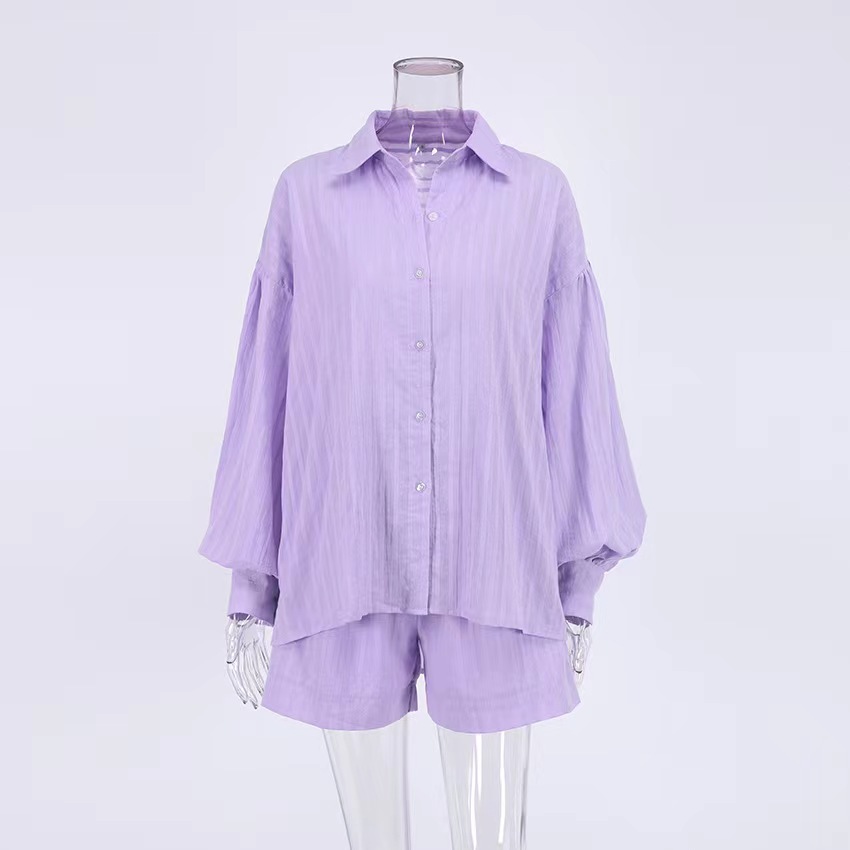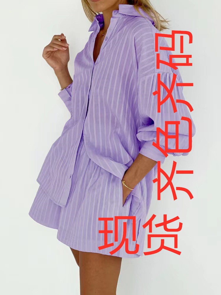 유럽과 미국 여성의 2025 새로운 100 면 자카드 스트라이프 옷깃 버블 슬리브 셔츠 투피스 세트 반바지 세트