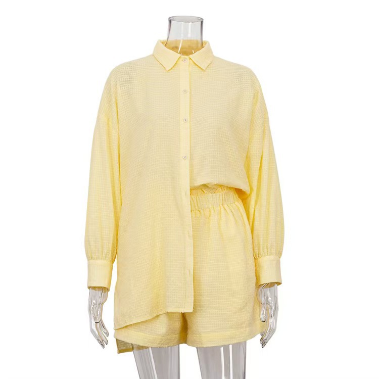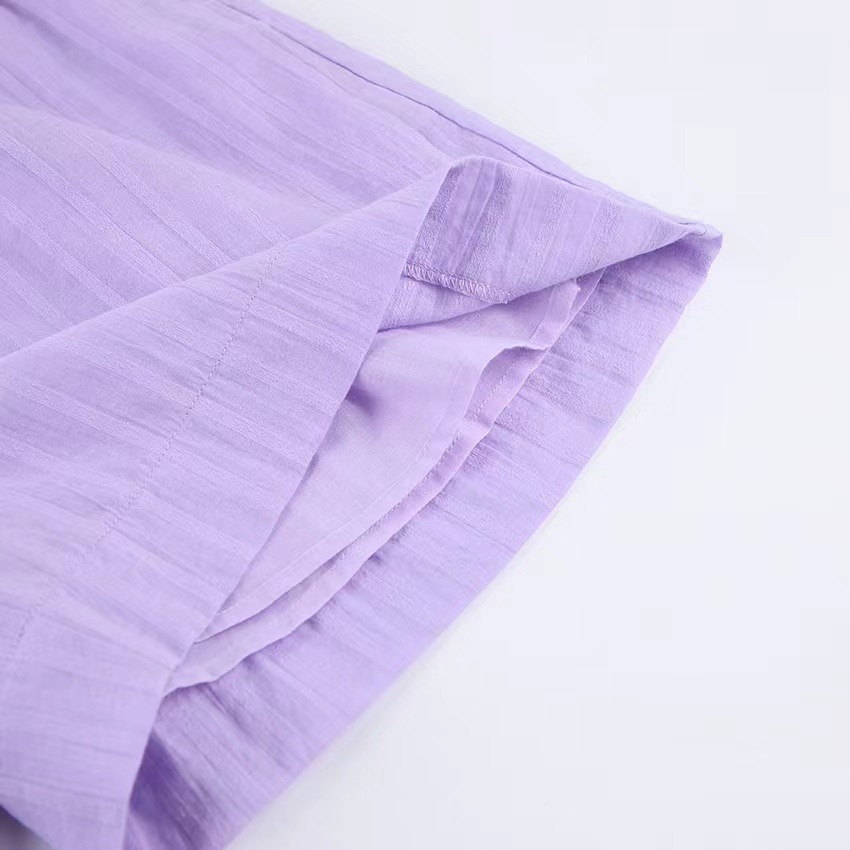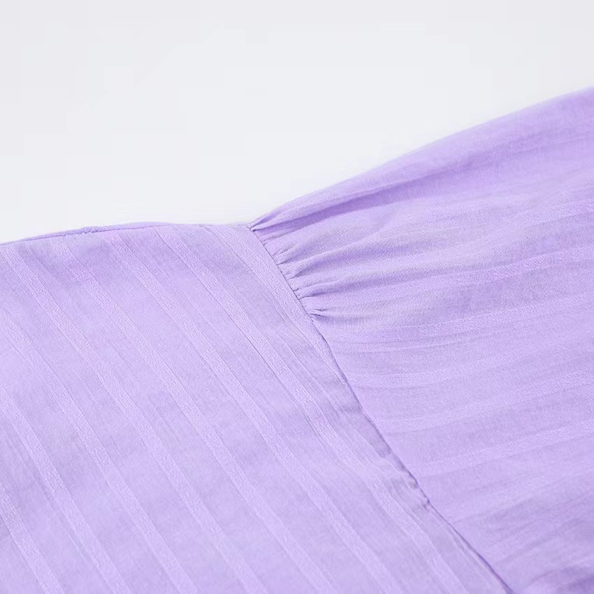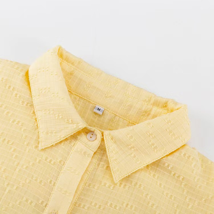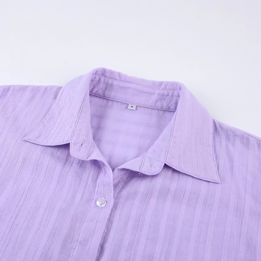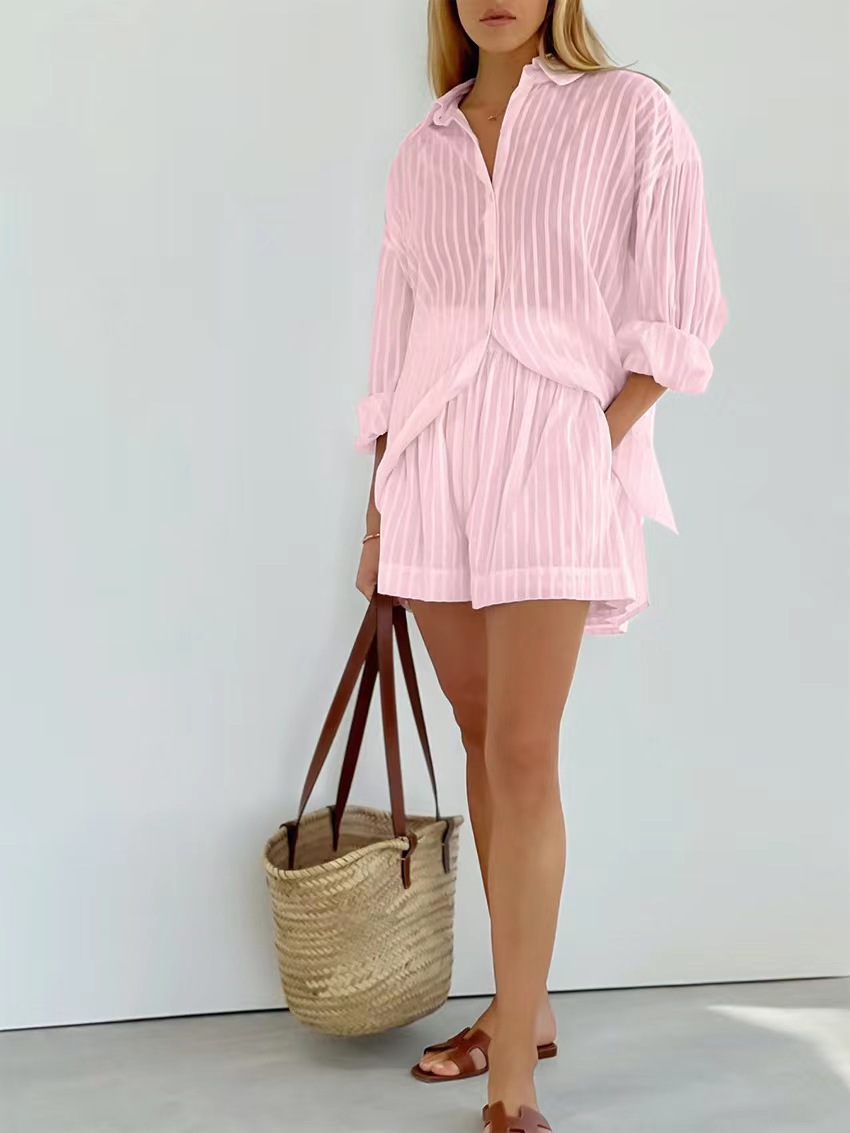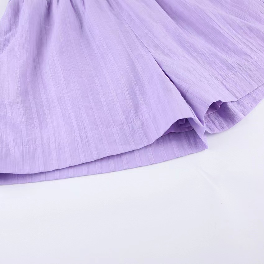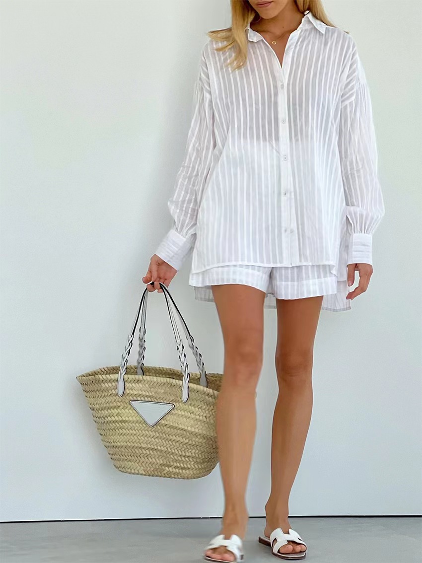 유럽과 미국 여성의 2025 새로운 100 면 자카드 스트라이프 옷깃 버블 슬리브 셔츠 투피스 세트 반바지 세트