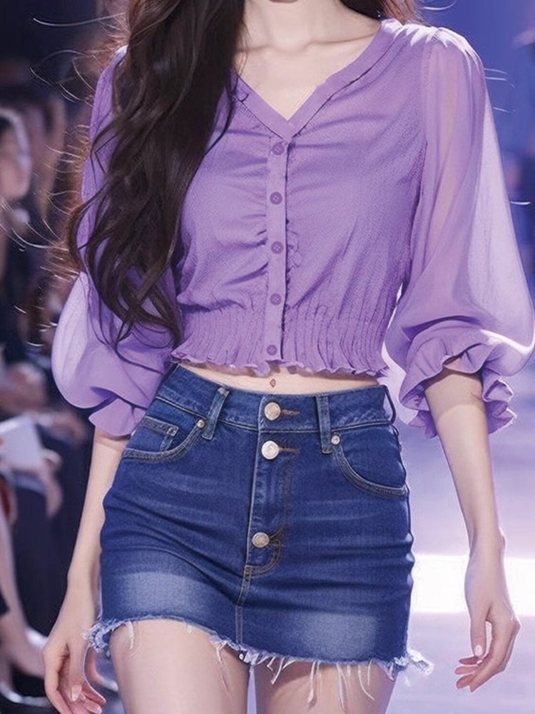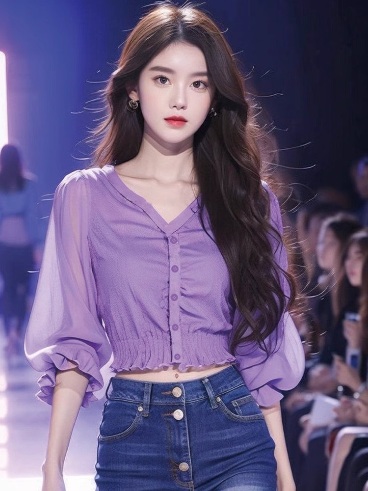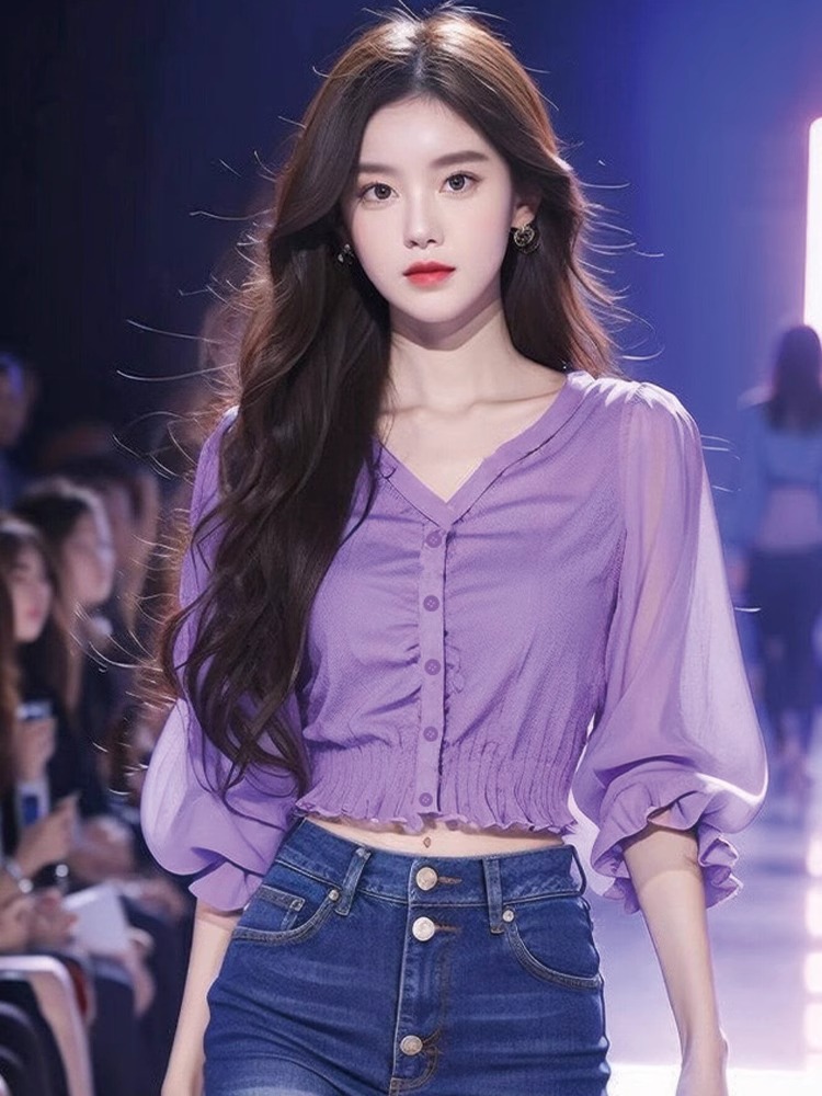 유럽과 미국의 2025년 신상 브이넥 스타일리시 허리 조임 랜턴 소매 쉬폰 배색 여성용 보라색 셔츠 다용도