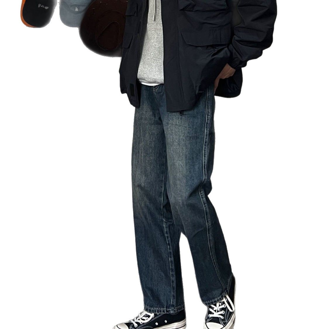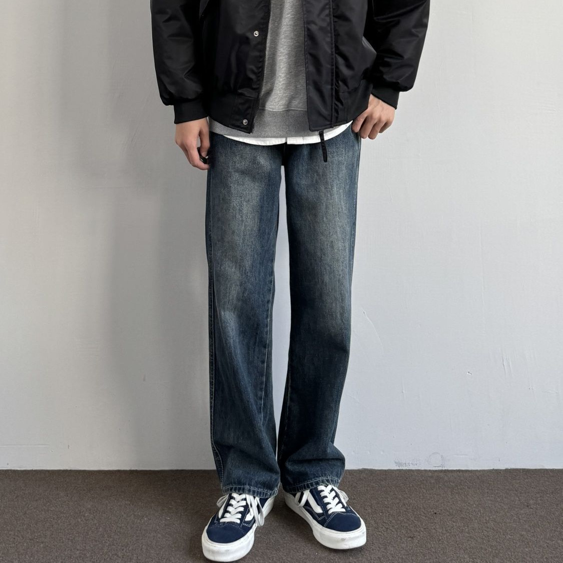 미국식 분위기 다크 블루 청바지 남성 2025 년 봄과 여름 새로운 리프팅 버전 바지 러피안 잘 생긴 느슨한 스트레이트 팬츠
