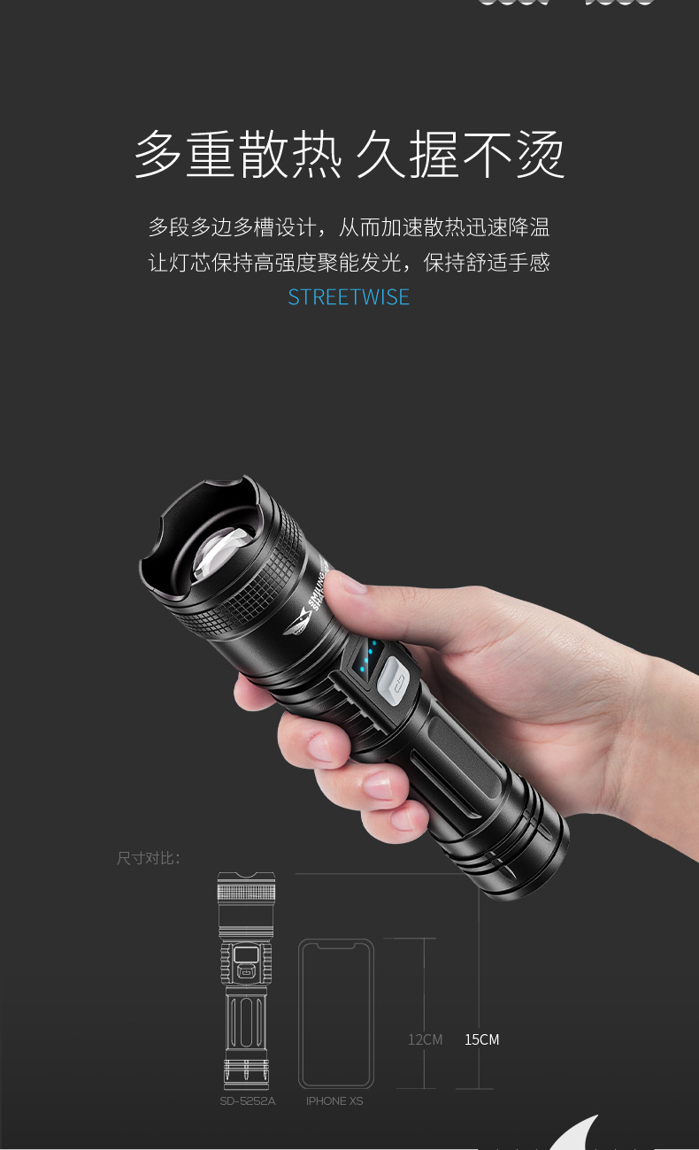 SD-5252A 줌 손전등 [LED 전자 디스플레이 모델 - 검정색, 내장 배터리 800MAH]