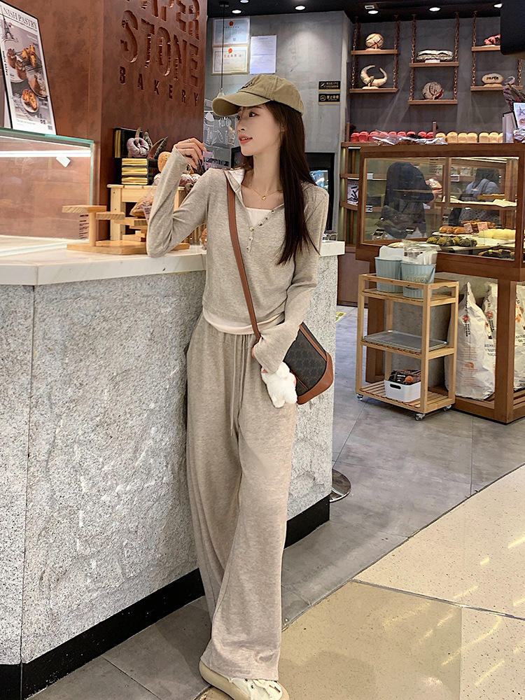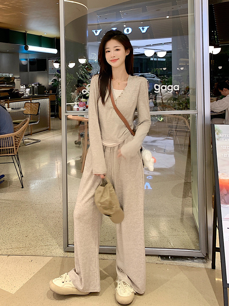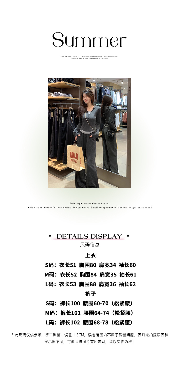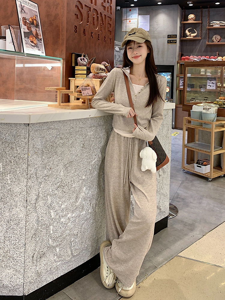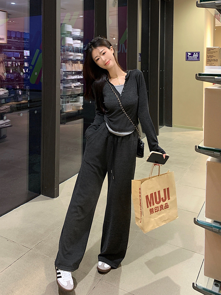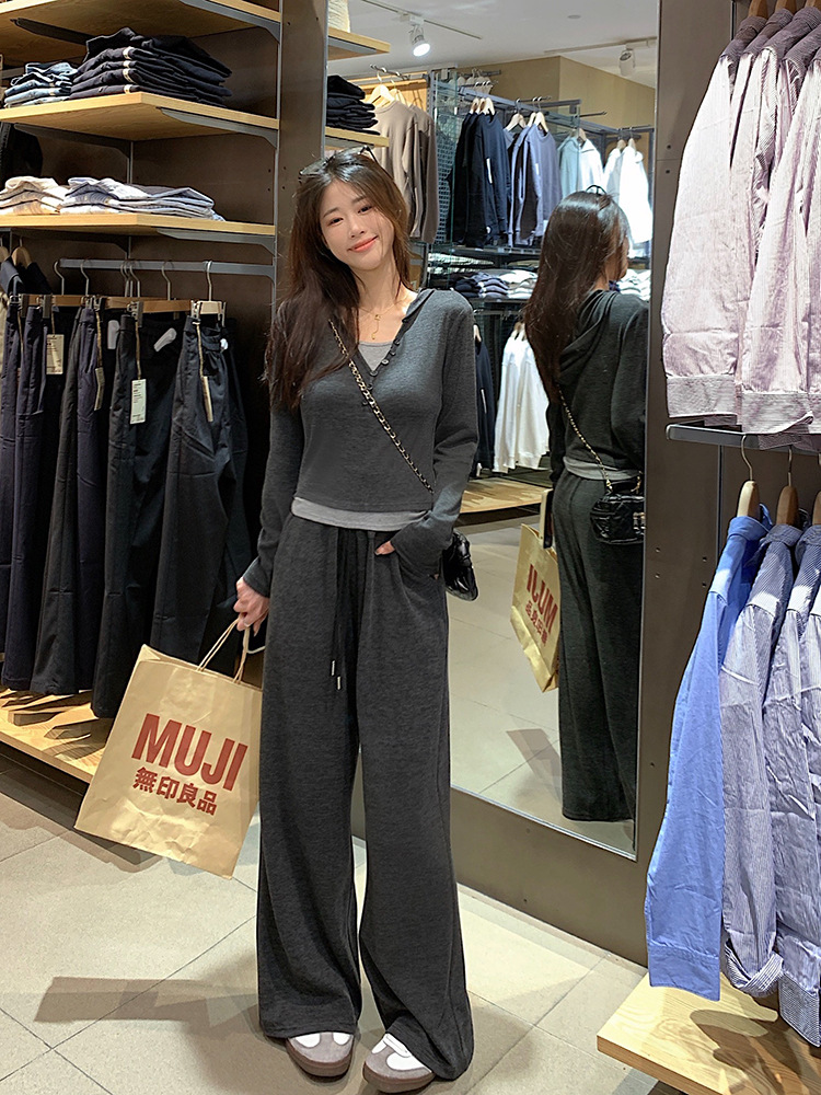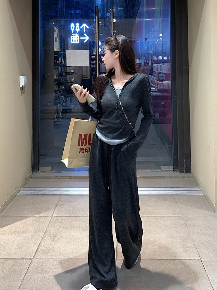 찹쌀 세트 투피스 캐주얼 스포츠 세트 가짜 투피스 긴팔 탑 여성용 가을 높은 허리 바지 와이드 레그 바지