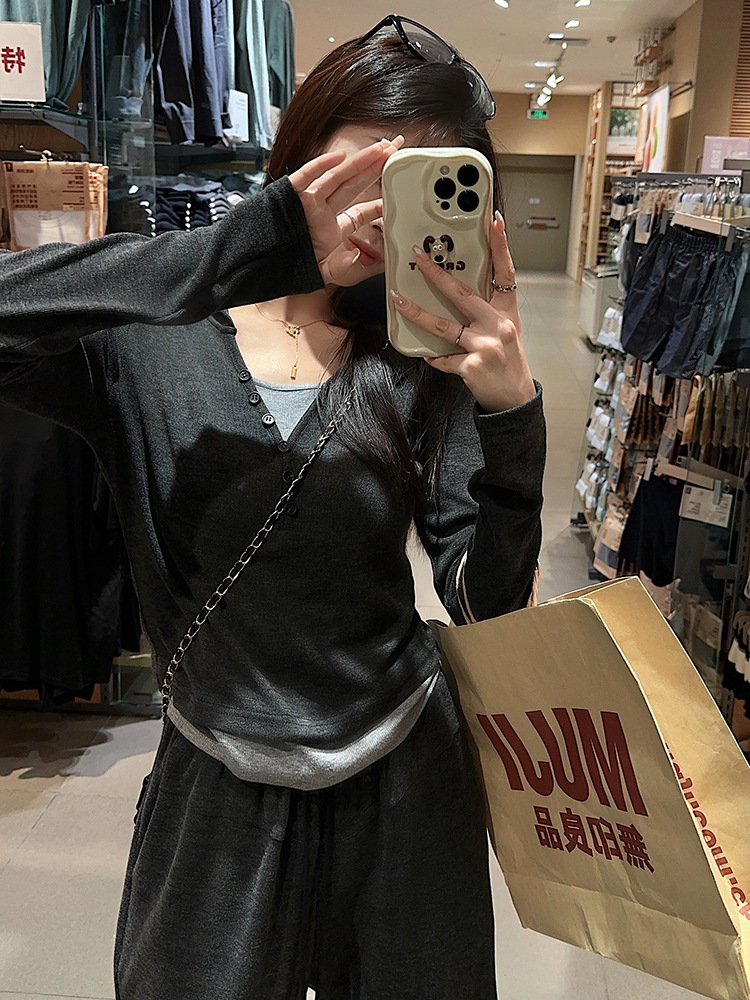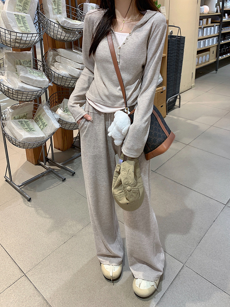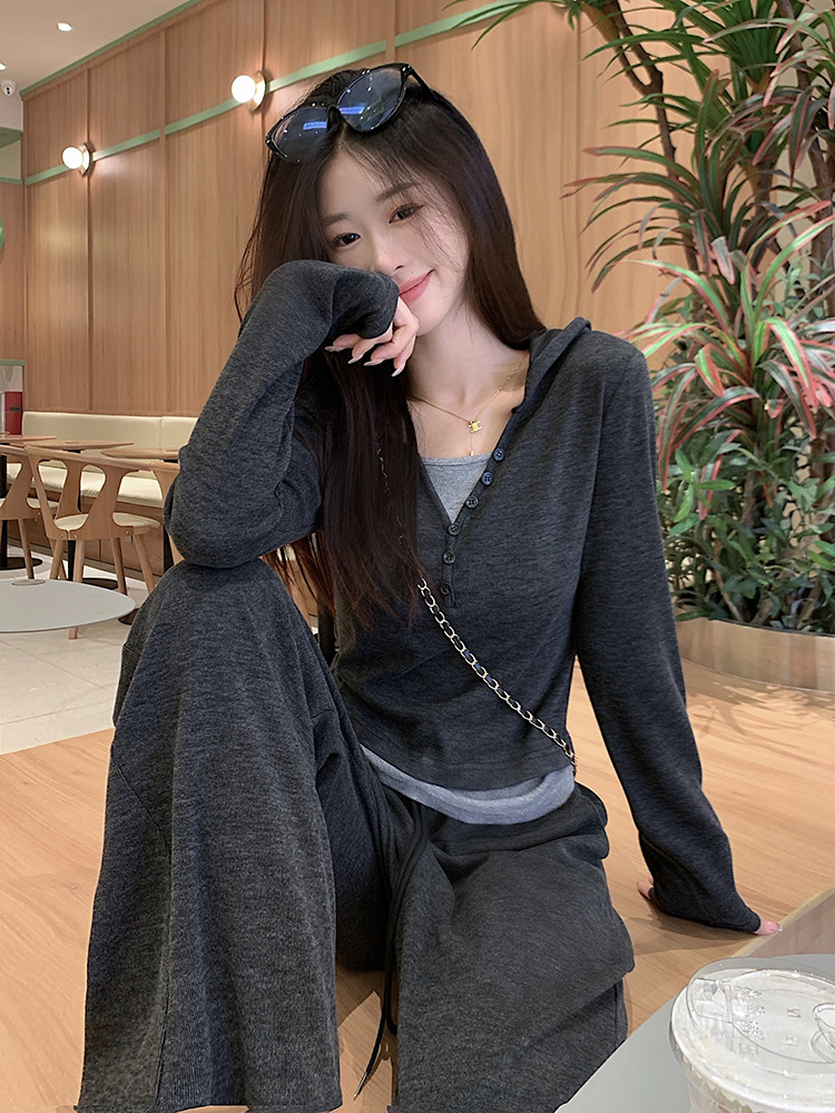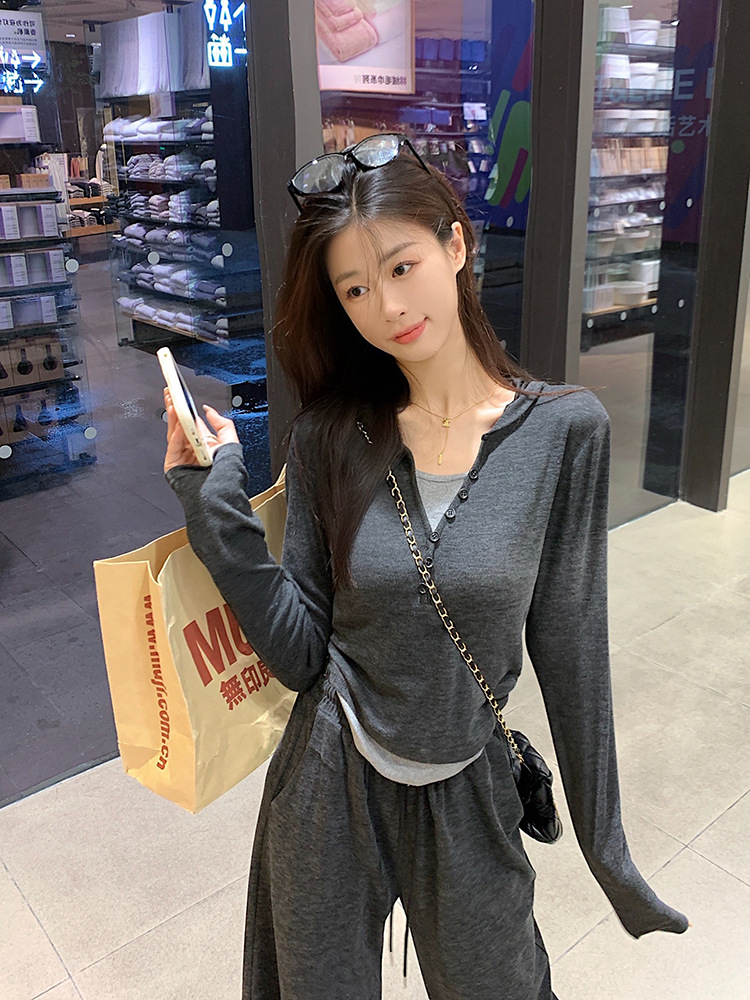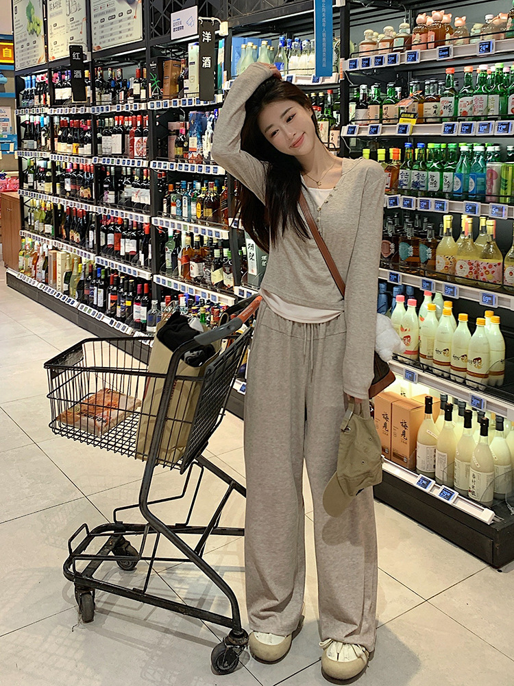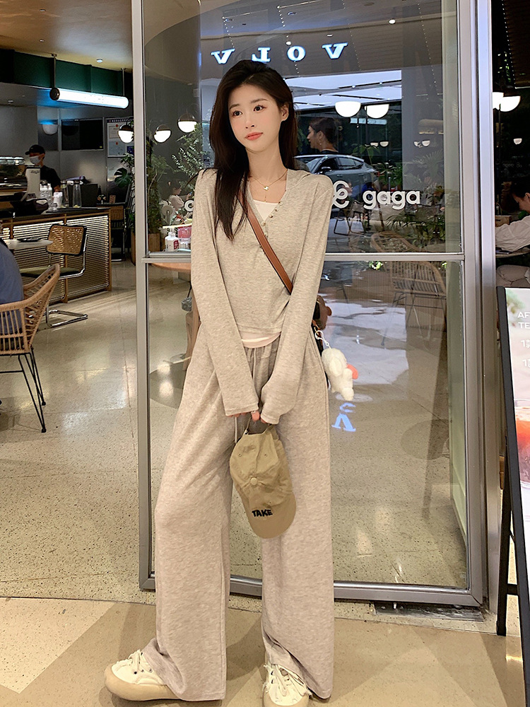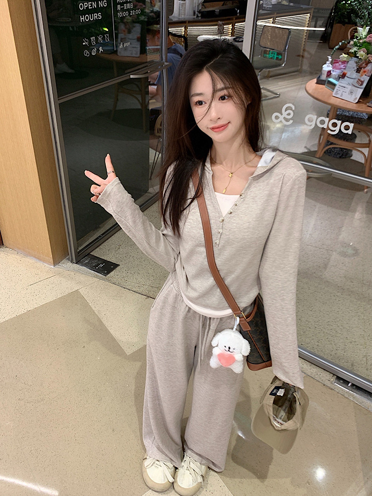 찹쌀 세트 투피스 캐주얼 스포츠 세트 가짜 투피스 긴팔 탑 여성용 가을 높은 허리 바지 와이드 레그 바지