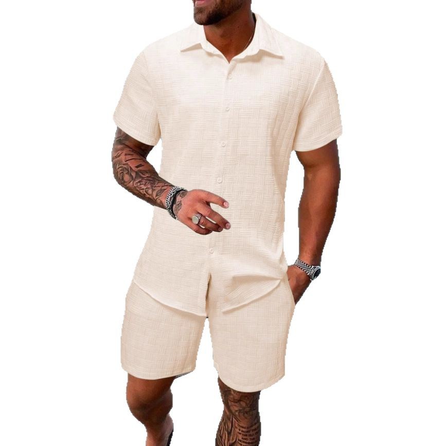 유럽과 미국의 국경 간 여름 자카드 흑백 단색 남성 세트 반팔 휴일 캐주얼 셔츠와 반바지 투피스 세트