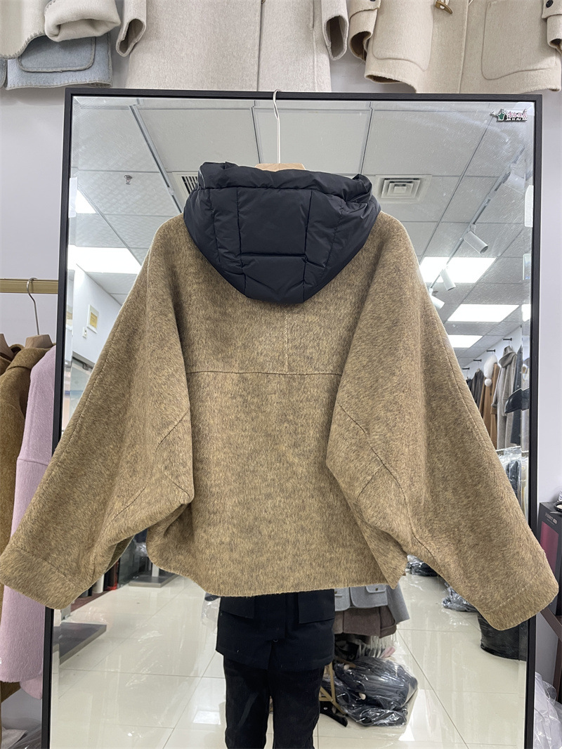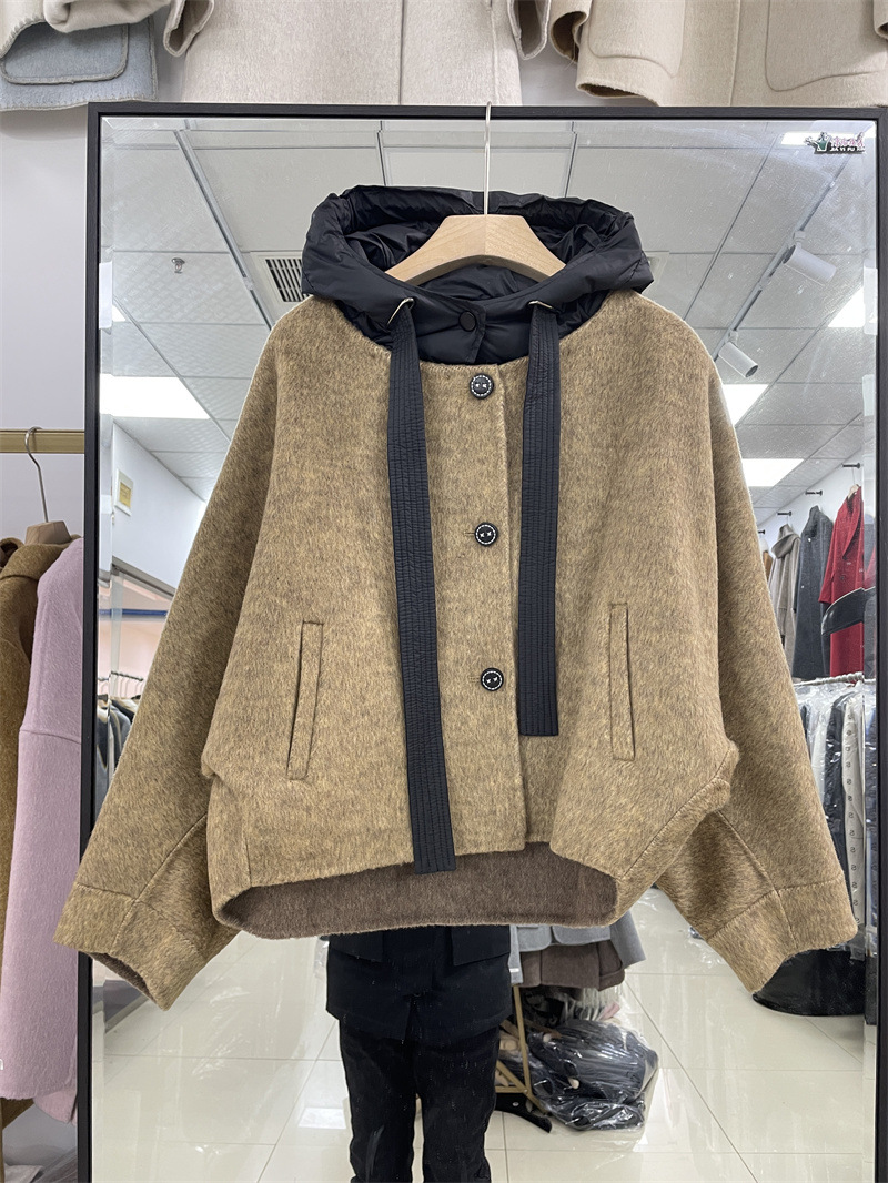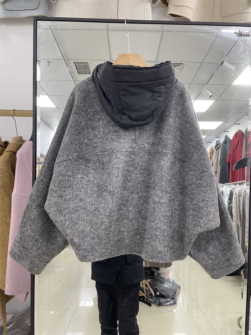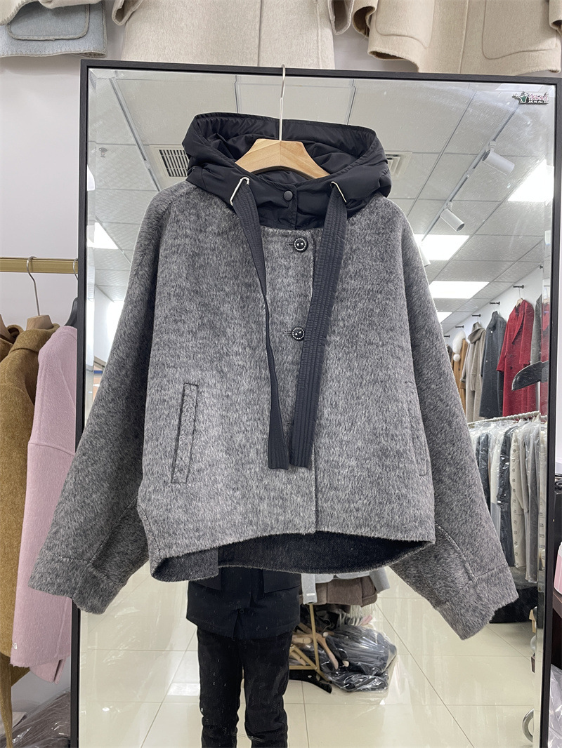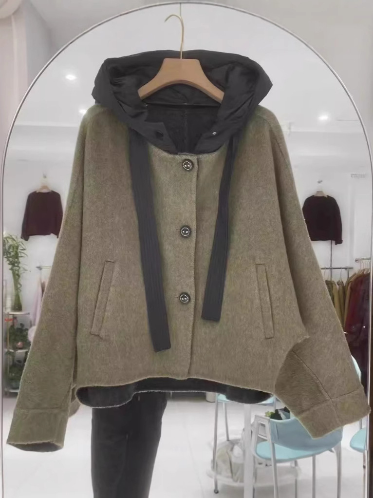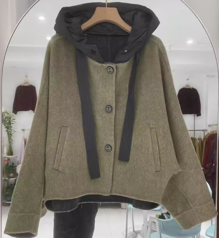 2025 봄, 가을 새로운 모직 코트 양면 모직 코트 후드 배트 슬리브 짧은 후드 여성 코트