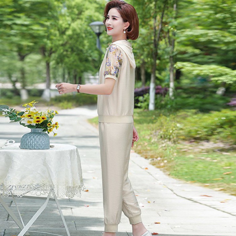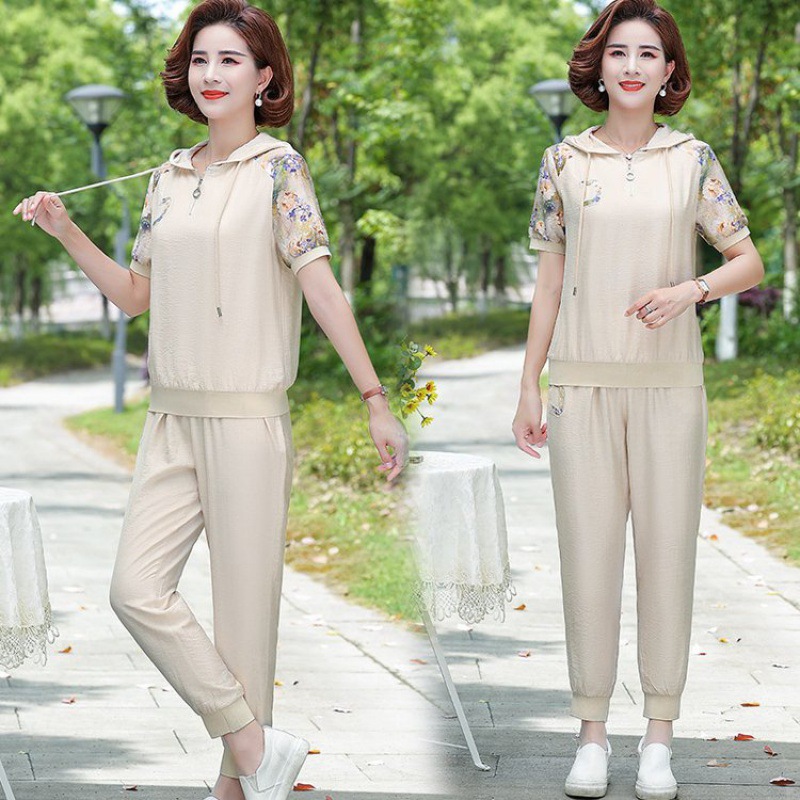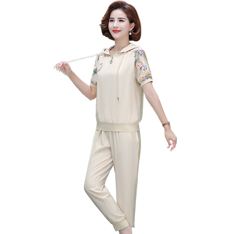 엄마의 여름 캐주얼 운동복 세트 서양식 플러스 사이즈 새로운 중년 및 노인 여성의 여름 반팔 운동복 투피스 세트