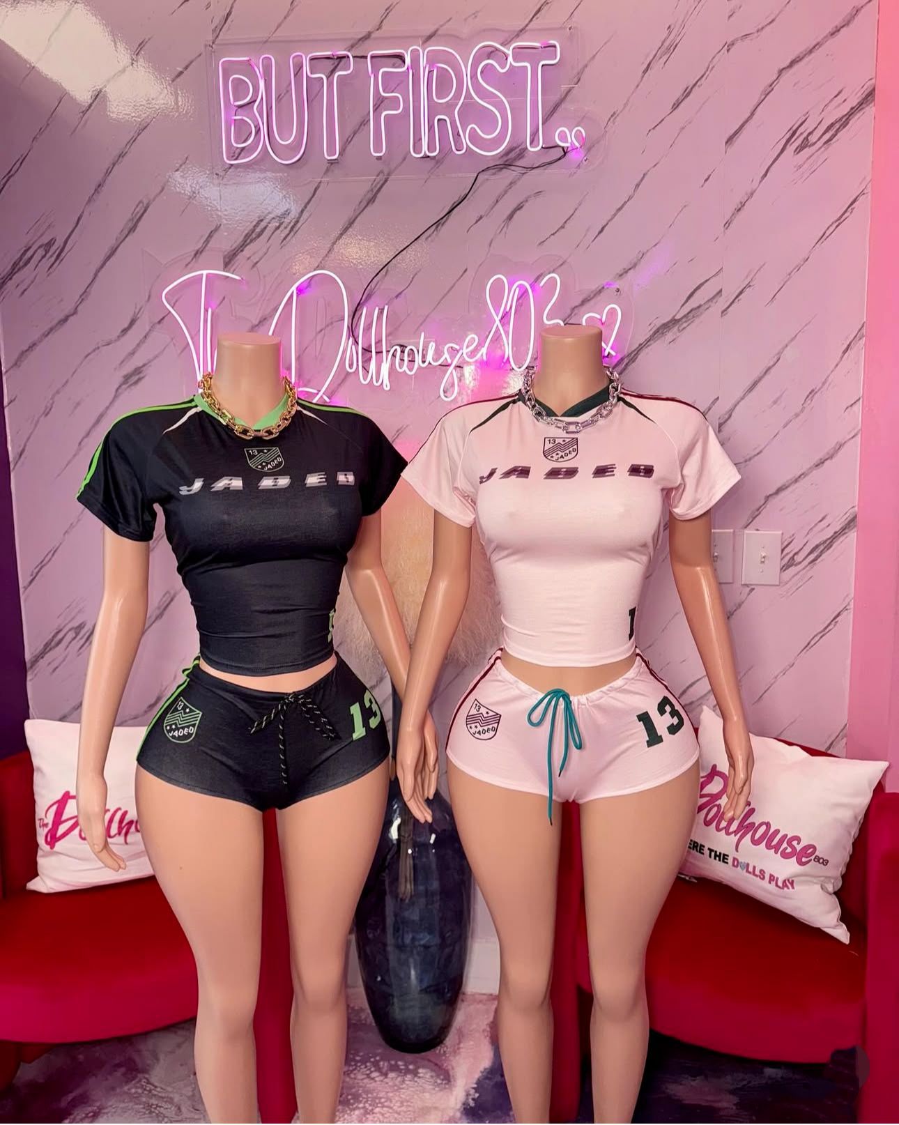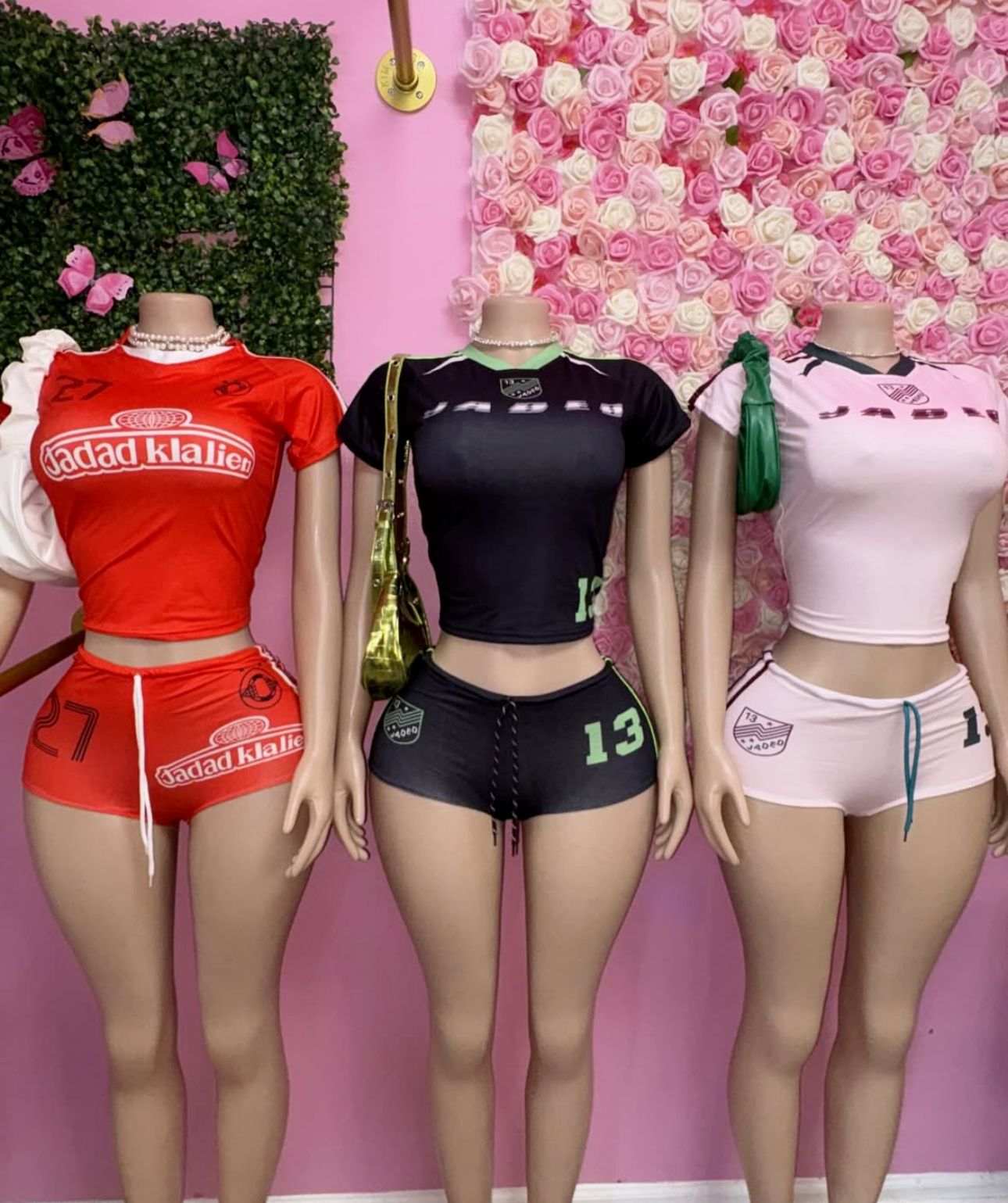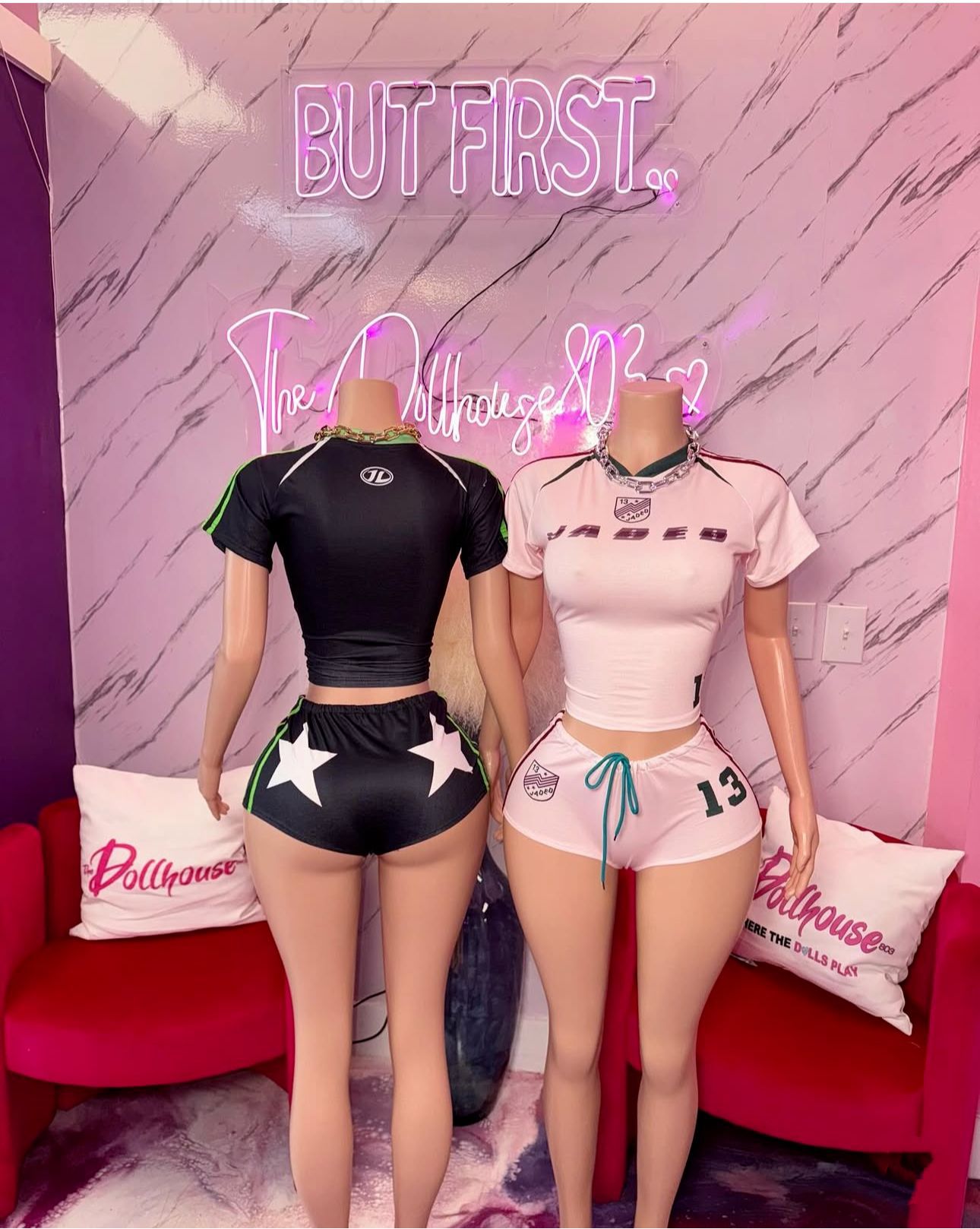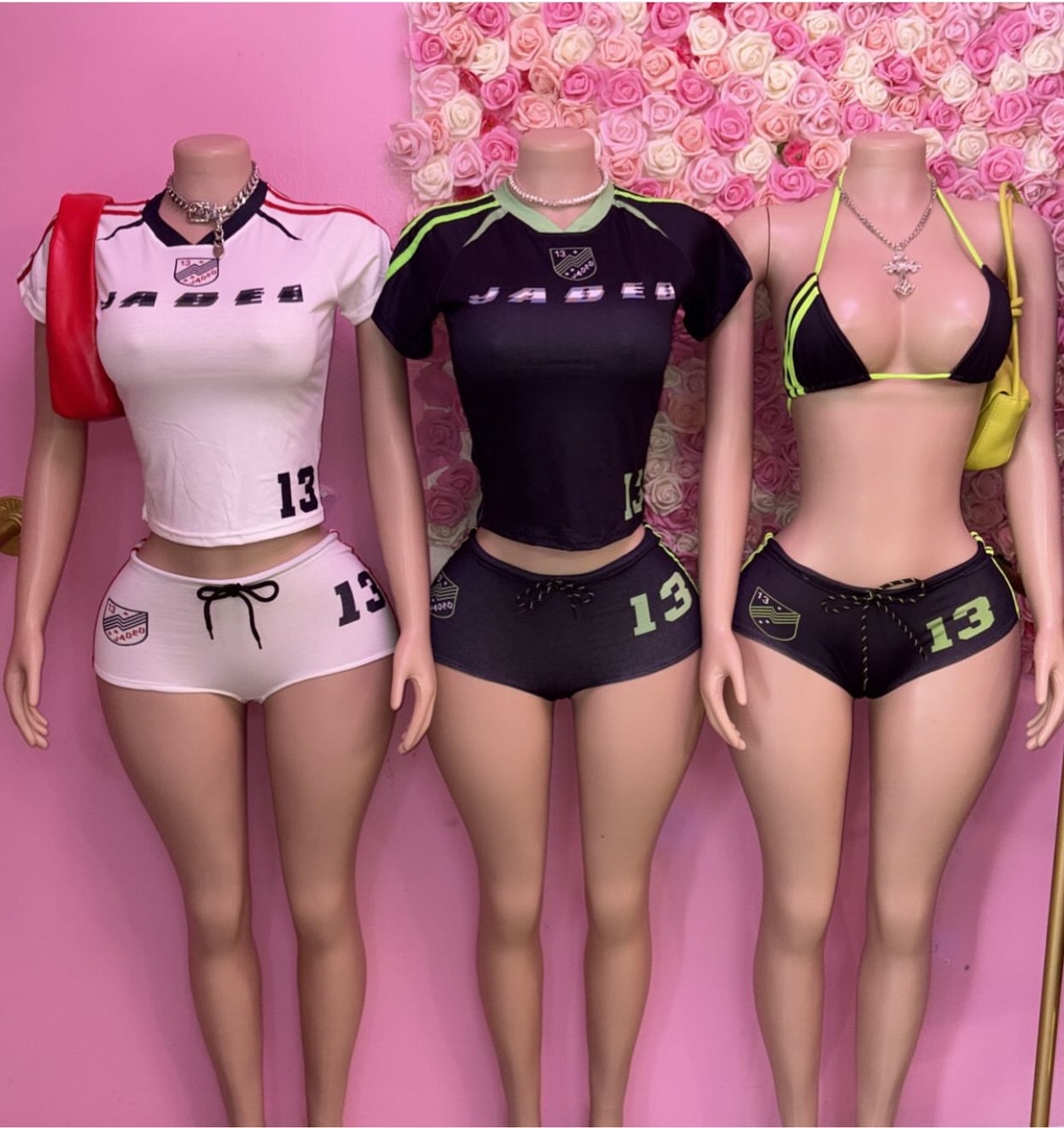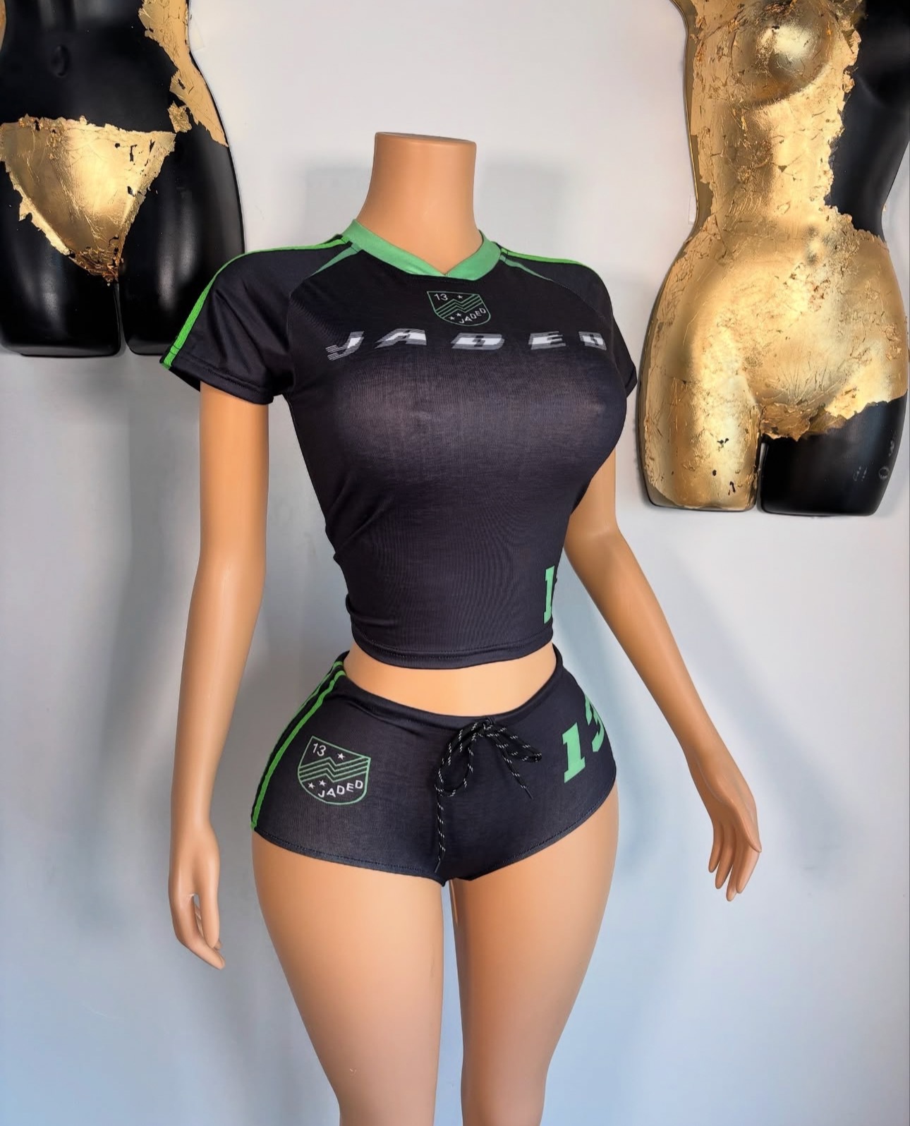 여름 새로운 국경 유럽 및 미국 스포츠 패션 슬림 핏 레트로 스파이스 소녀 편지 인쇄 반팔 상단 반바지 세트