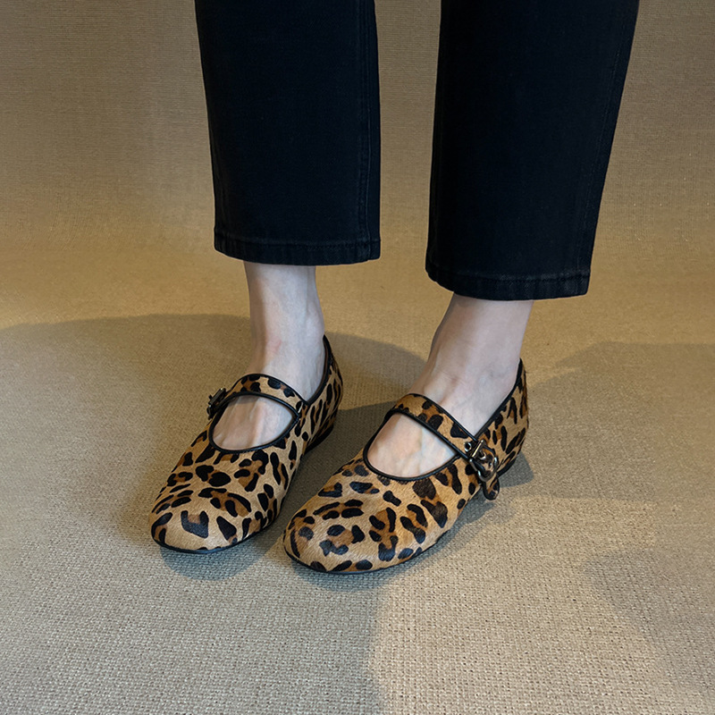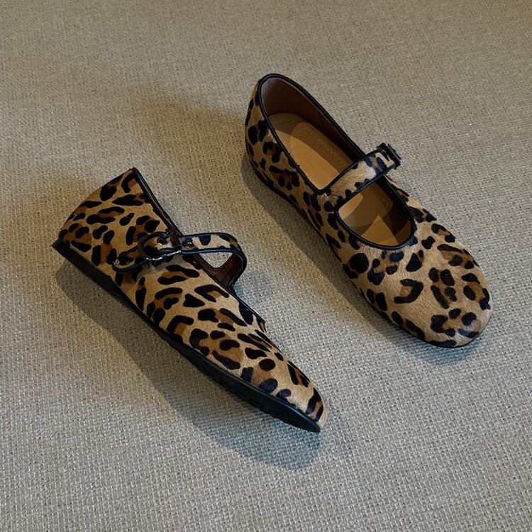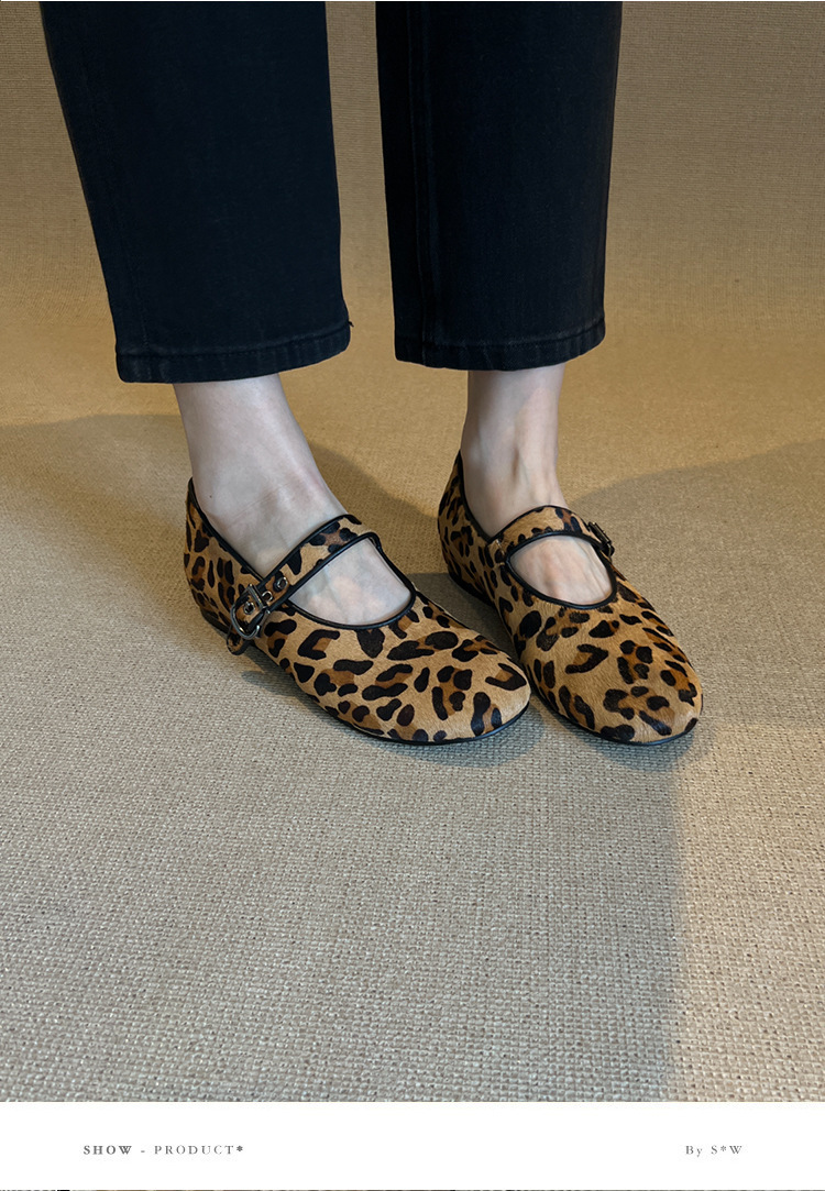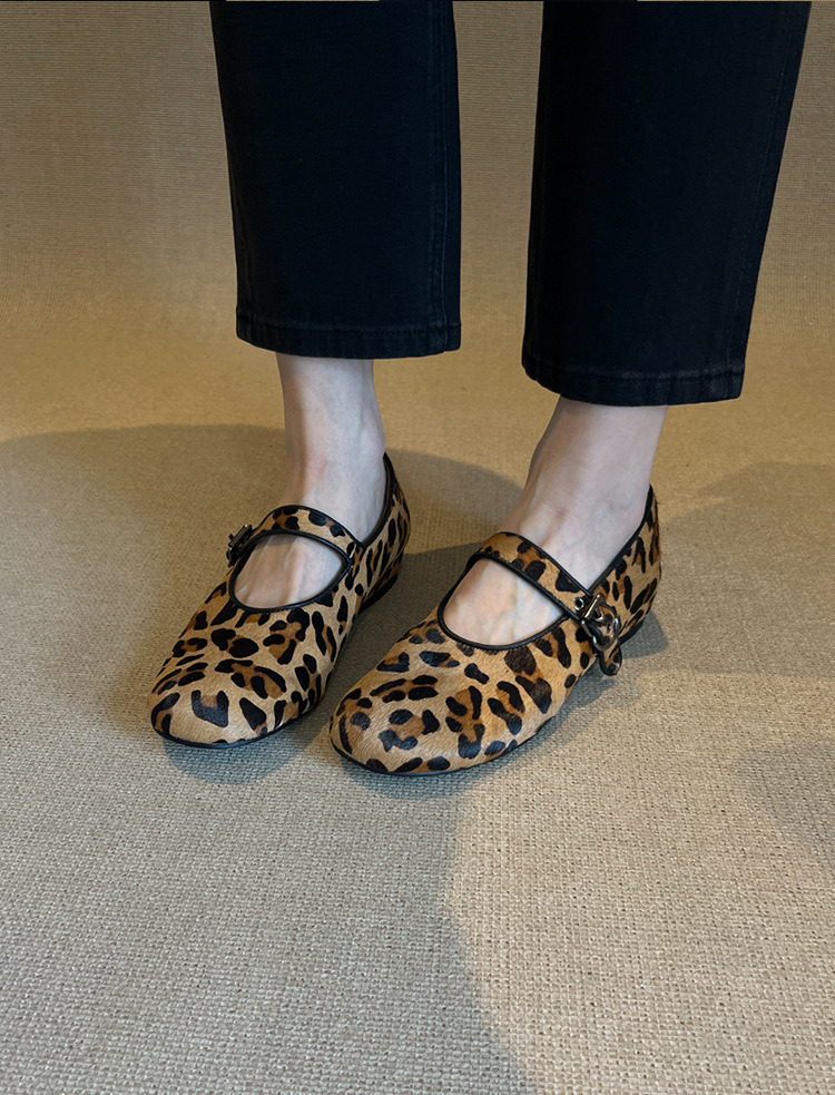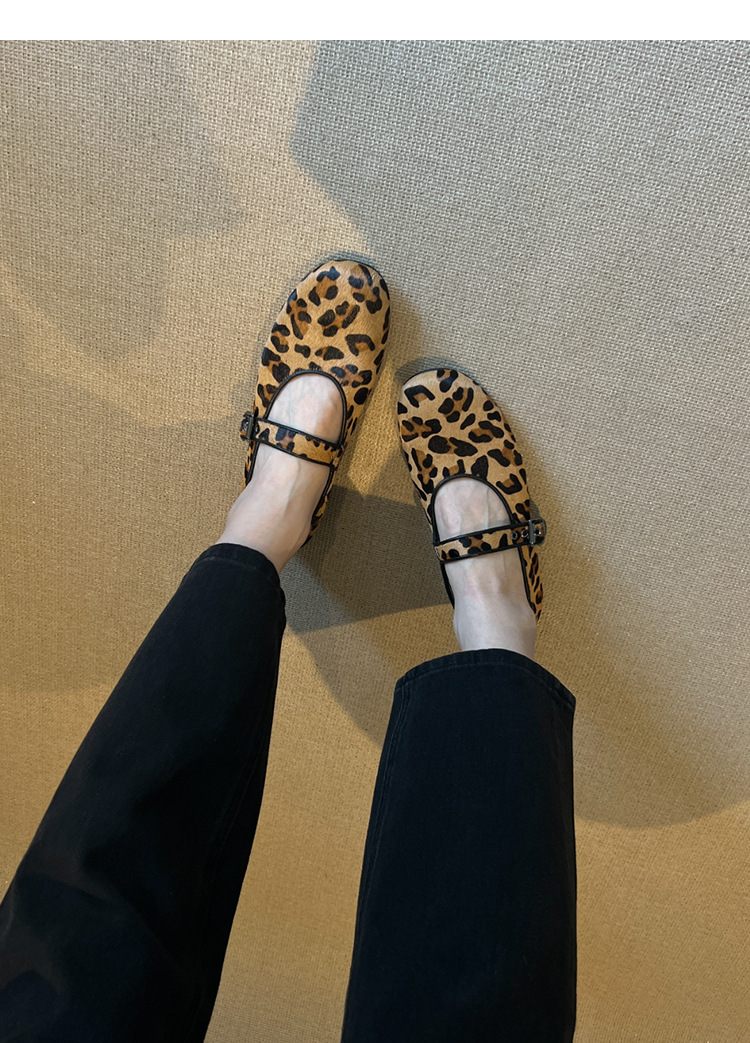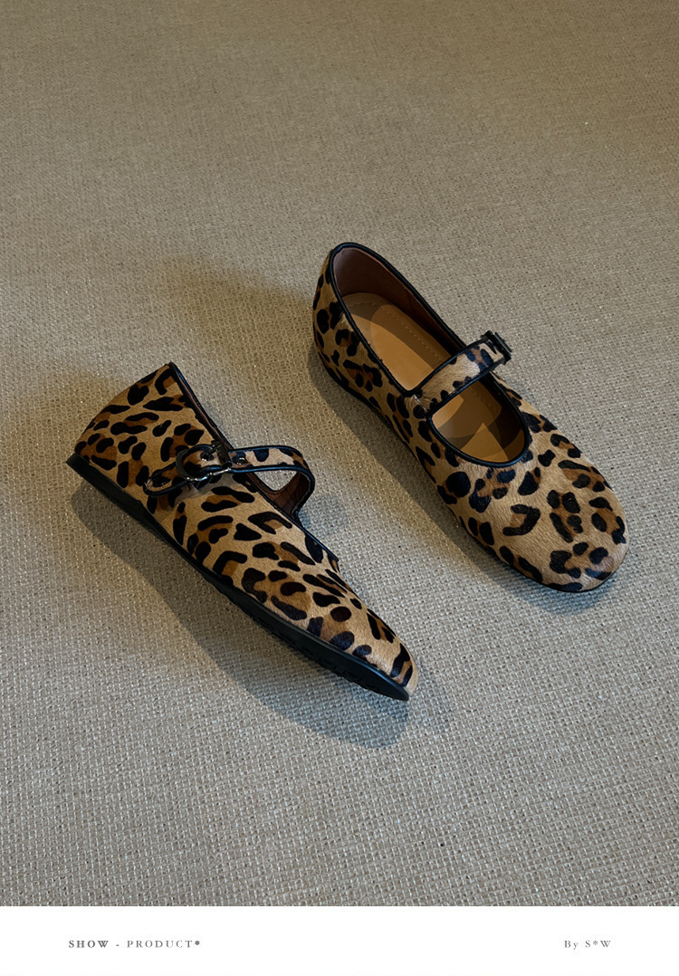 양가죽 판 ~ 2025 새로운 틈새 레오파드 무늬 말 머리 신발 얕은 입 여성용 플랫 메리 제인 여성 신발